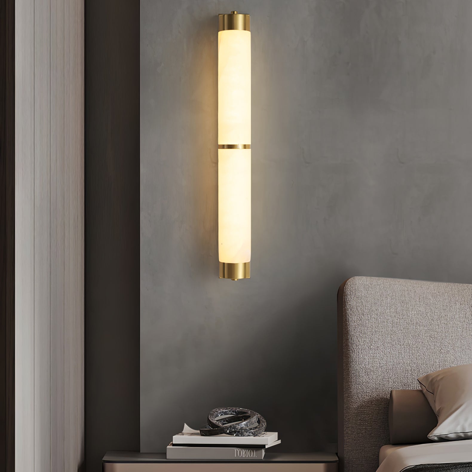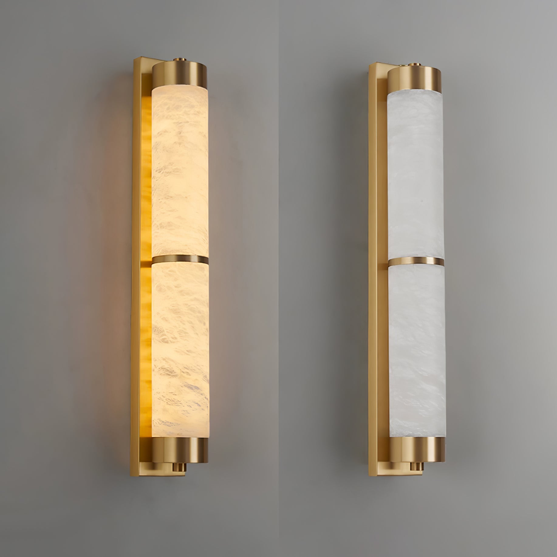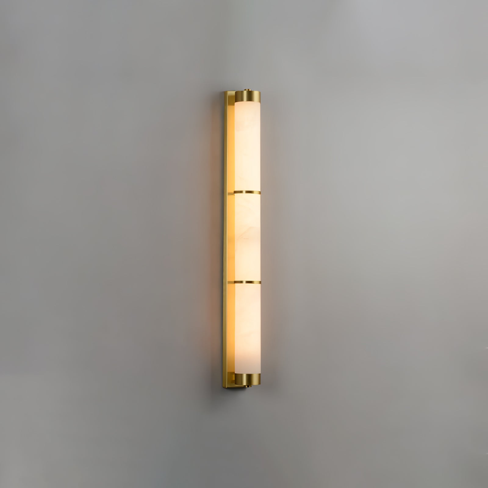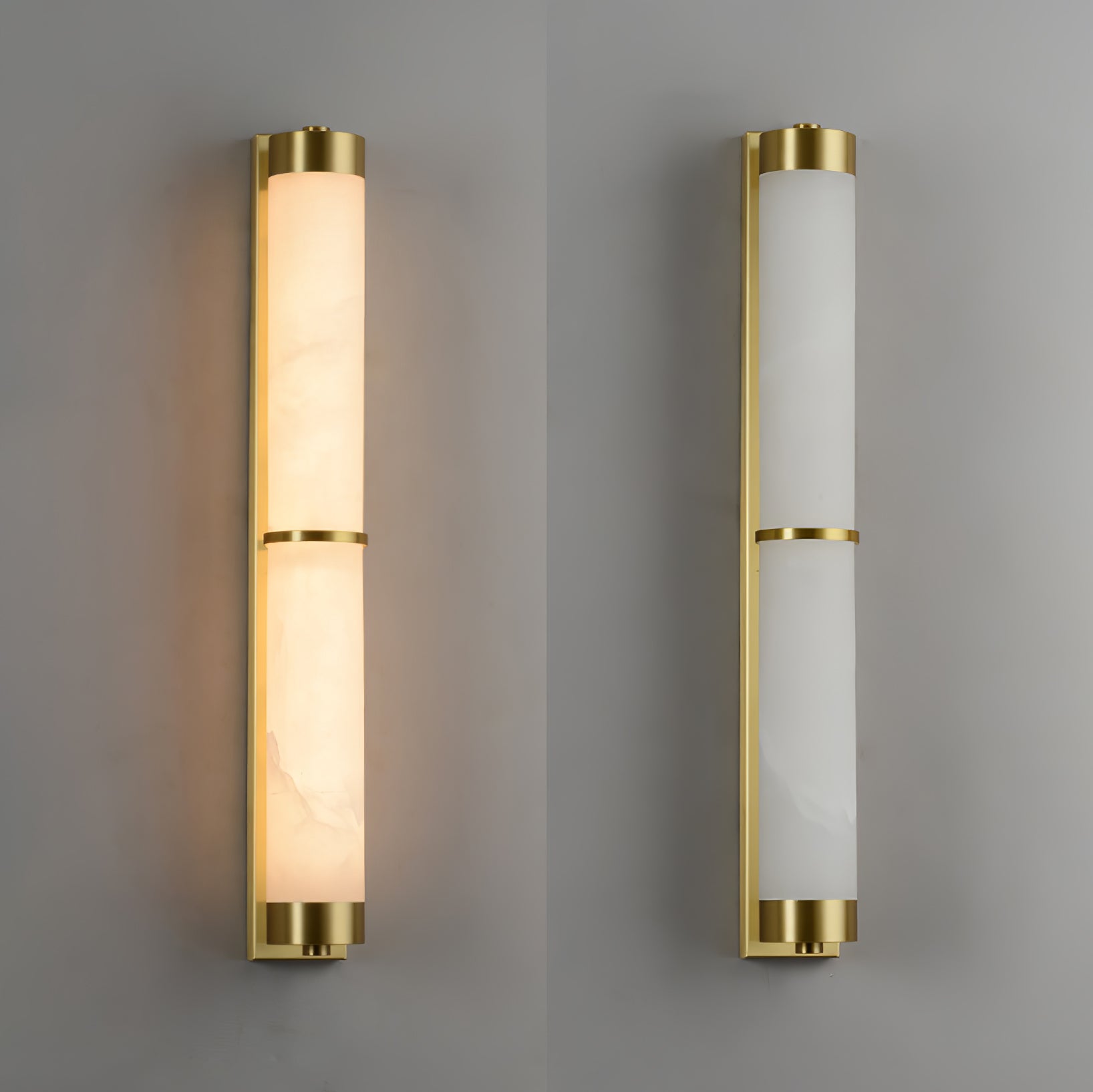 Cylindra Alabaster Brass Wall Light on osoitus yksinkertaisuuden eleganssista ja luonnonmateriaalien kauneudesta. Hienoimmasta messingistä valmistettu ja sylinterimäisellä alabasterivarjostimella koristeltu seinävalaisin huokuu lämmintä, tunnelmallista hehkua, joka korostaa alabasterin ainutlaatuista suonistoa ja kermaista rakennetta.