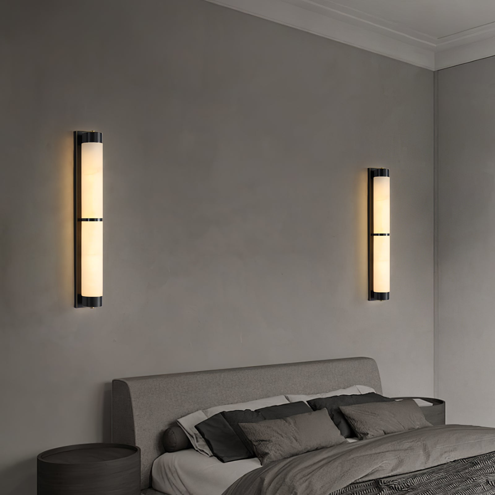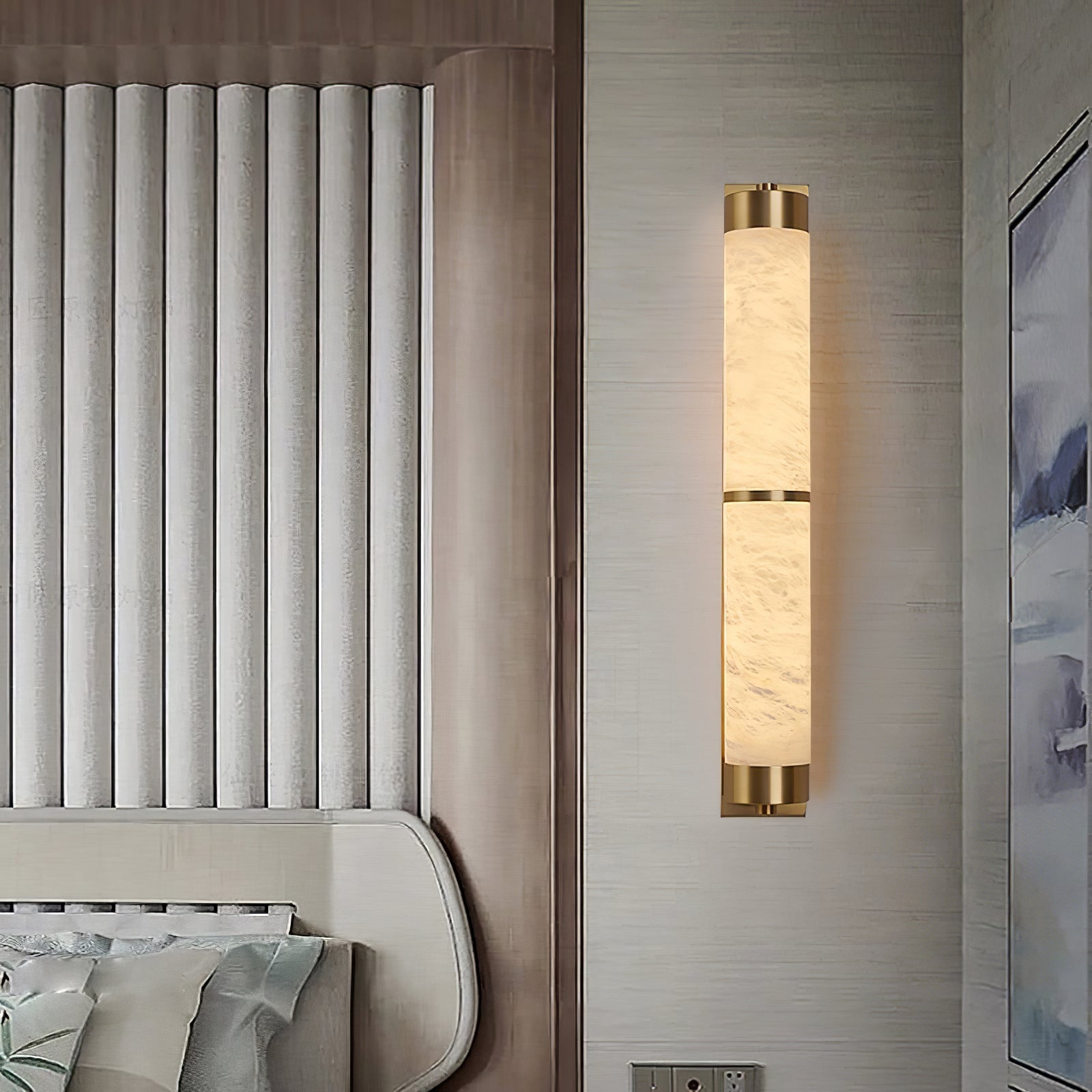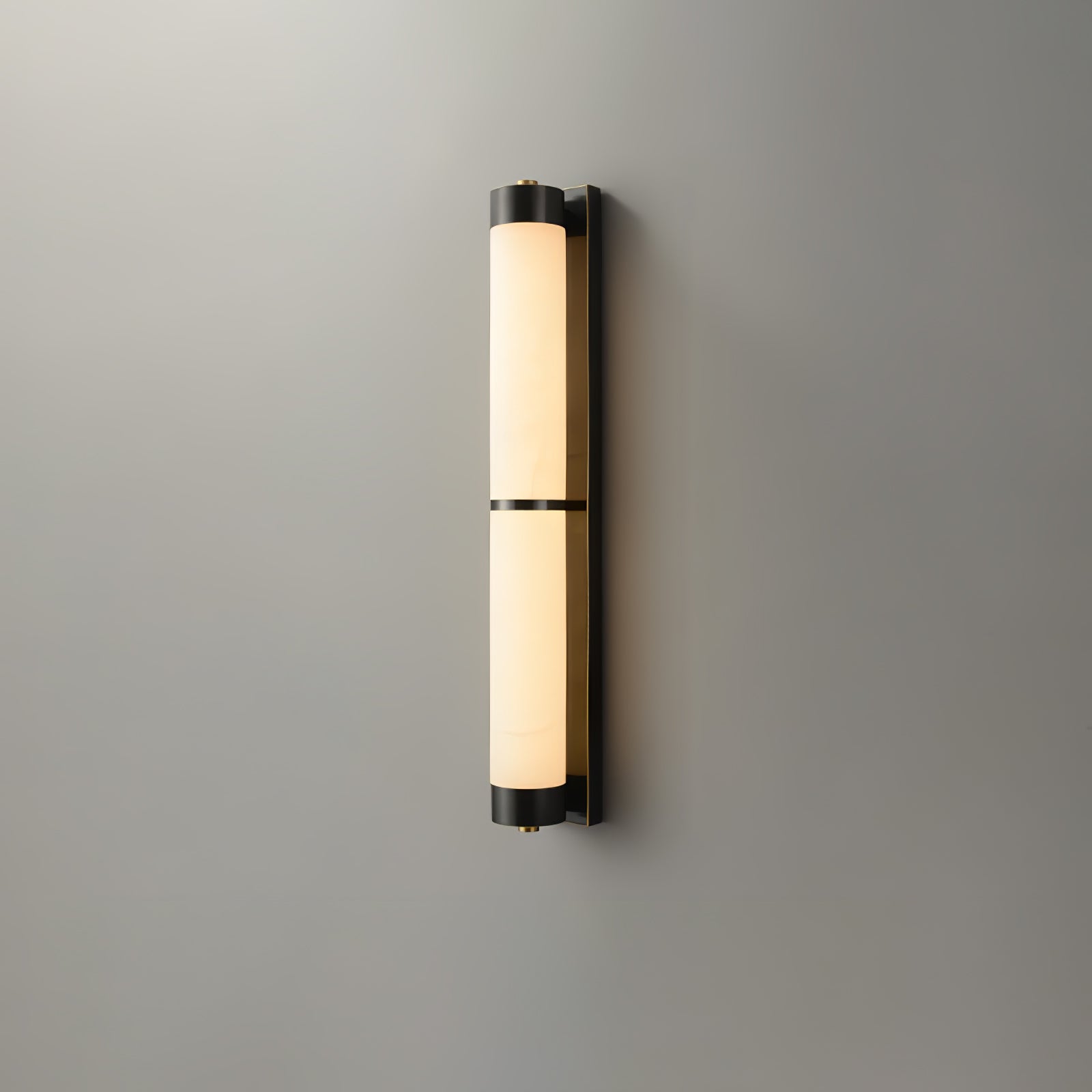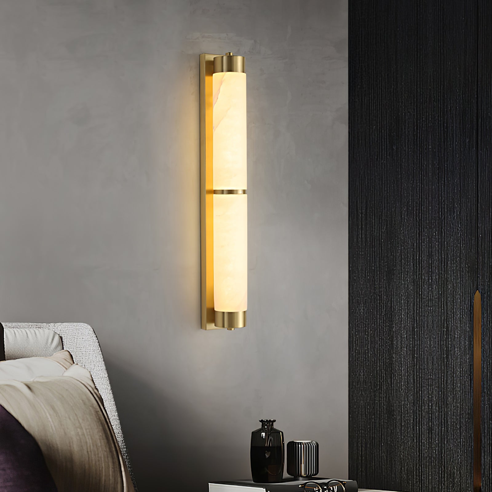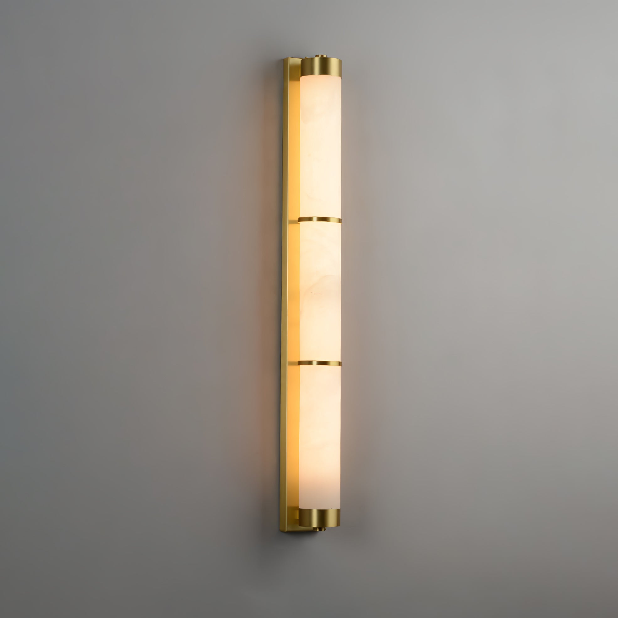 Cylindra Alabaster Brass Wall Light on osoitus yksinkertaisuuden eleganssista ja luonnonmateriaalien kauneudesta. Hienoimmasta messingistä valmistettu ja sylinterimäisellä alabasterivarjostimella koristeltu seinävalaisin huokuu lämmintä, tunnelmallista hehkua, joka korostaa alabasterin ainutlaatuista suonistoa ja kermaista rakennetta.