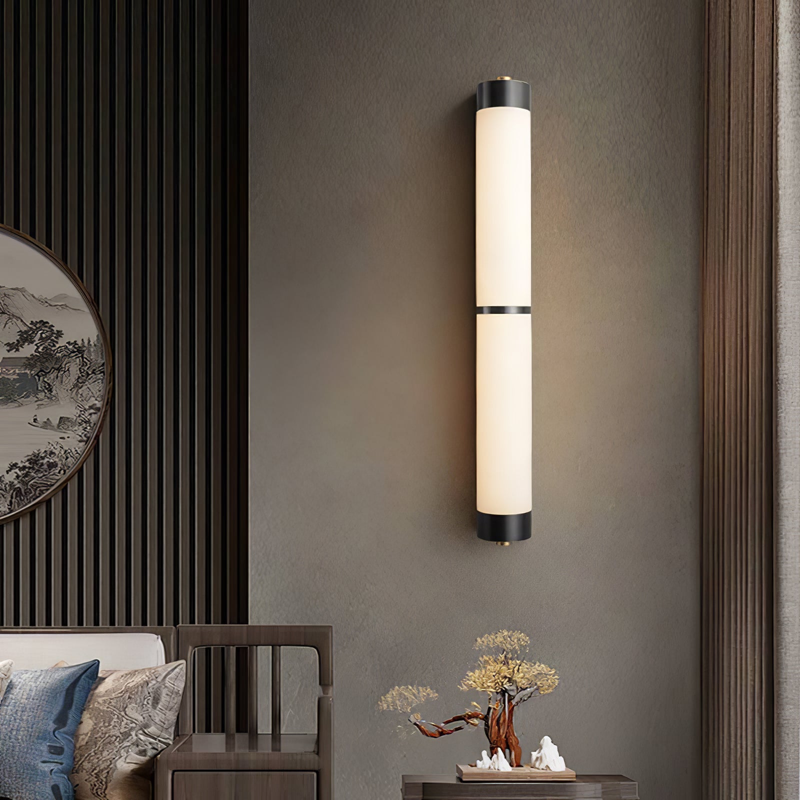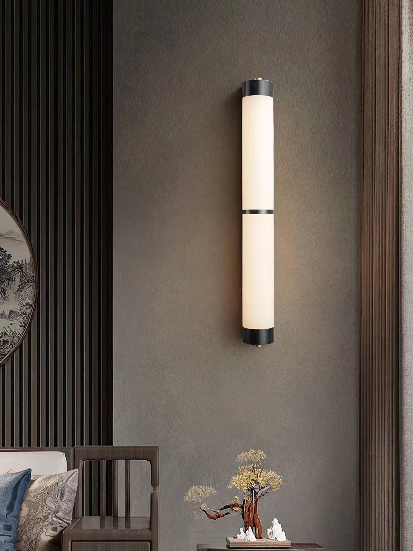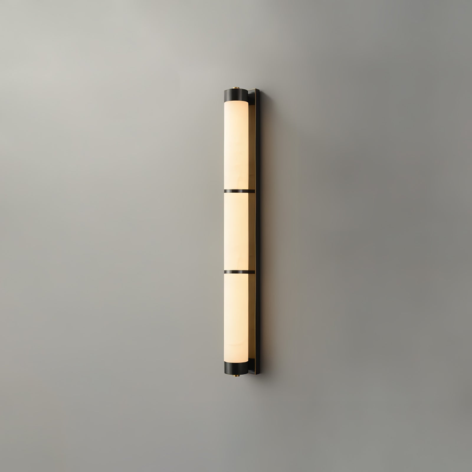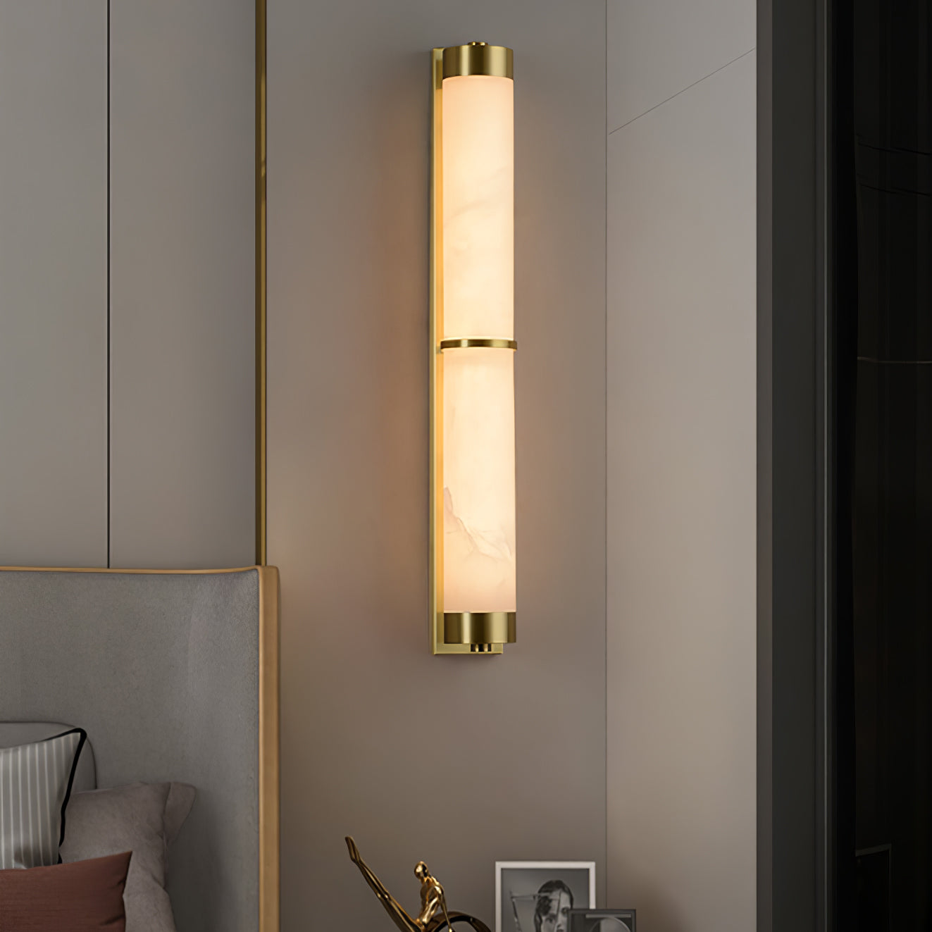 Cylindra Alabaster Brass Wall Light on osoitus yksinkertaisuuden eleganssista ja luonnonmateriaalien kauneudesta. Hienoimmasta messingistä valmistettu ja sylinterimäisellä alabasterivarjostimella koristeltu seinävalaisin huokuu lämmintä, tunnelmallista hehkua, joka korostaa alabasterin ainutlaatuista suonistoa ja kermaista rakennetta.