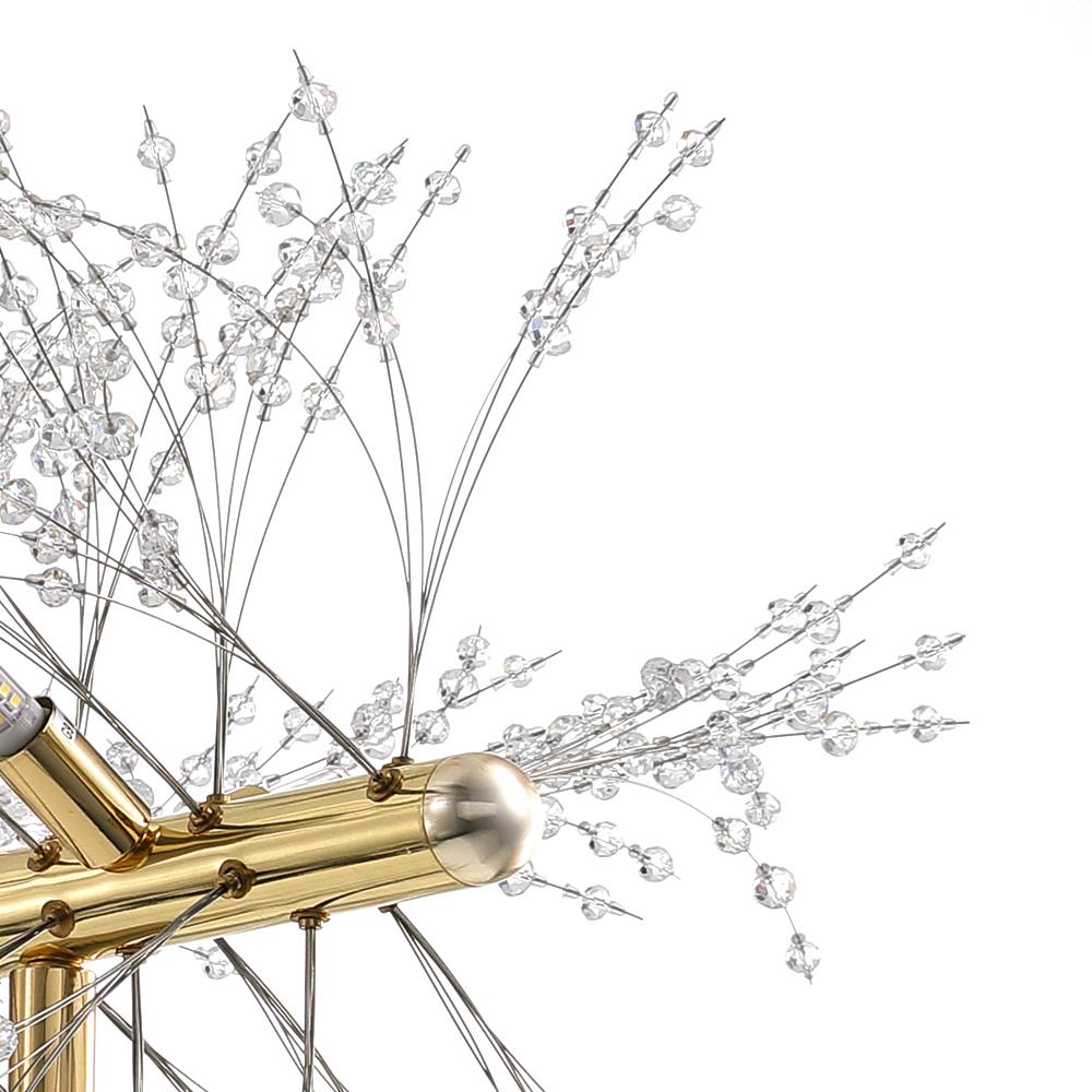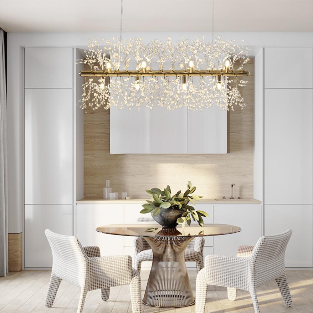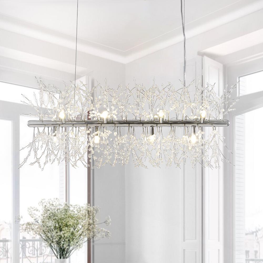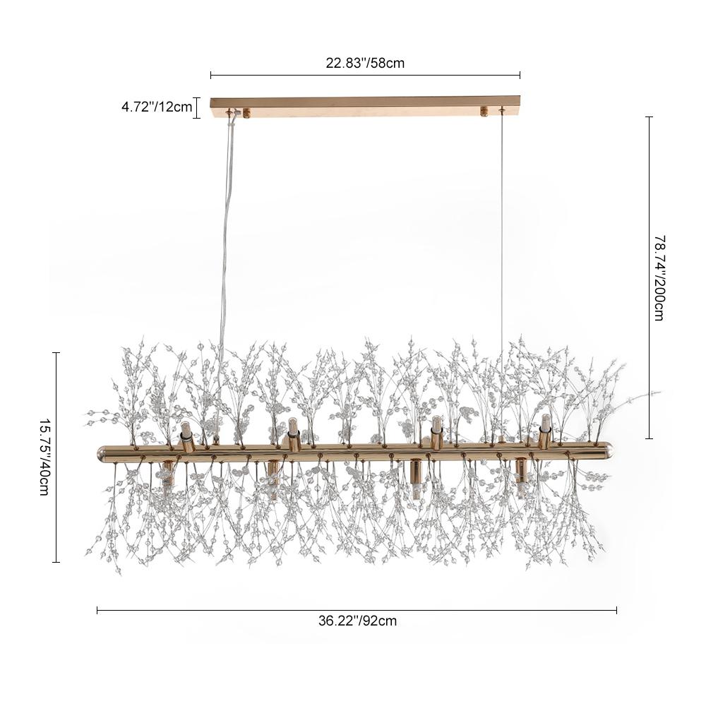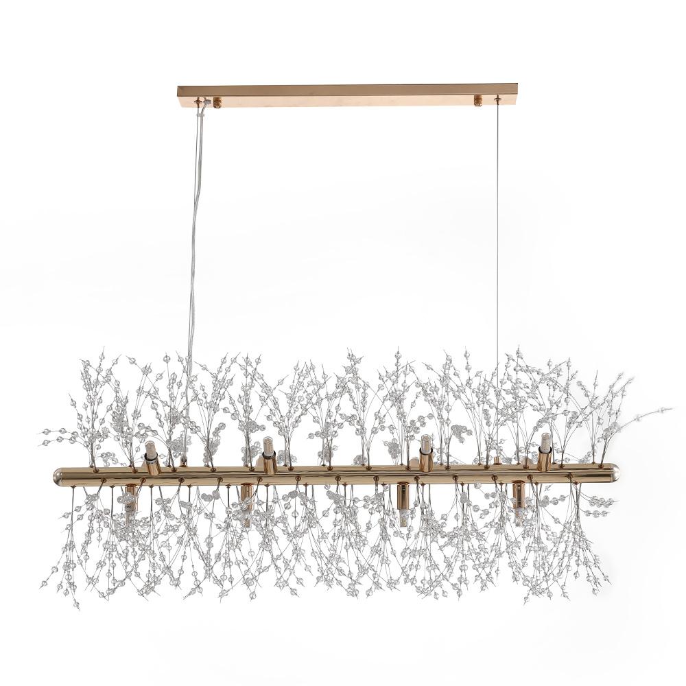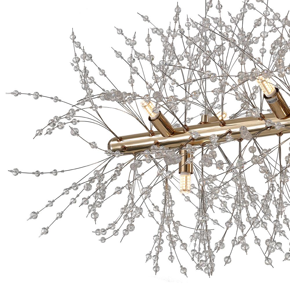 Moderni lineaarinen kattokruunu, jossa on inspiraatiota voikukan vaikutuksesta ja tyylikkäistä kristallielementeistä, herättää mielenkiintoisen keskustelun keittiön saarella, ruokapöydässä, olohuoneessa, eteisessä tai eteisessä. Tämä voikukkakruunu on ripustettu yhteensopivaan suorakaiteen muotoiseen katteeseen ja kahdelle ohuelle kaapelille, ja siinä on oikea määrä oksia, jotka on koristeltu kauniilla kristallihelmillä, jotka istuvat ohuen vaakasuoran tangon päällä yhtä aikaa ylös ja alas. Yhdeksän/kaksitoista G9-polttimoa (ei sisälly) sijaitsevat tangon kohdalla tasaisesti kristallin oksien välissä. Kytkettäessä tämä lineaarinen kristallikruunu antaa upean ja romanttisen hehkun, joka heijastuu kristallihelmien läpi. Lisää järjestelyösi fantastisia ja eteeristä tunnelmaa tällä suloisella lineaarisella kattokruunulla.Detail