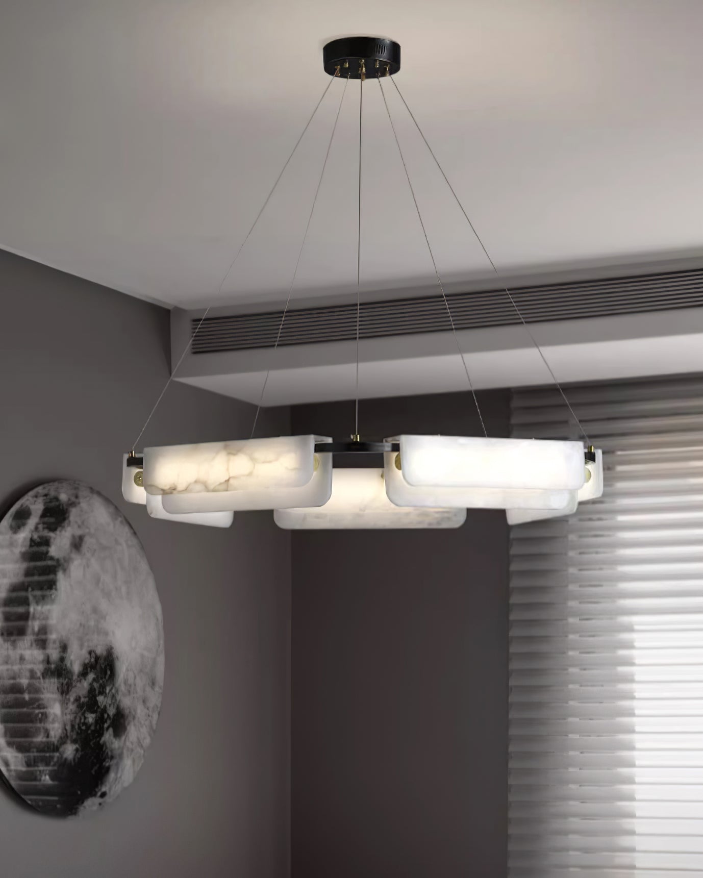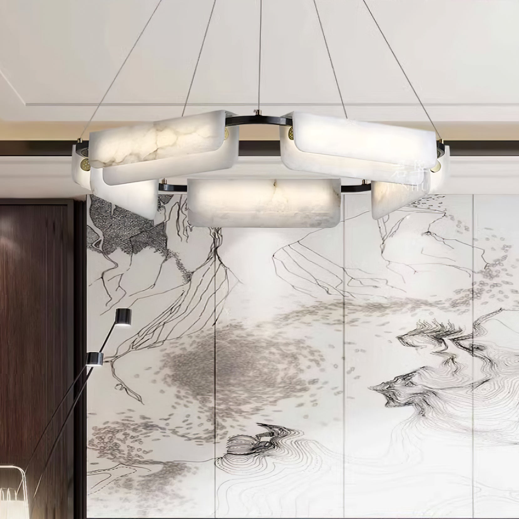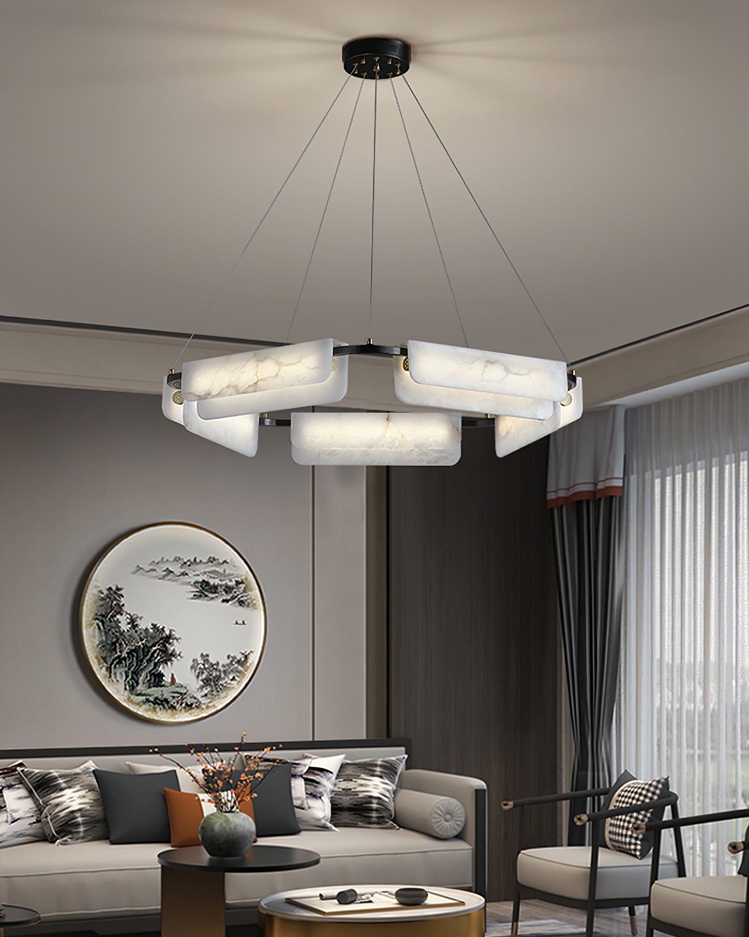 Tämä kattokruunu on valmistettu hienosti tarkasti, käyttämällä ensiluokkaista kuparia ja koristeltu ylellisillä alabasterikoristeilla, ja se yhdistää saumattomasti modernin estetiikan ajattoman eleganssin kanssa.