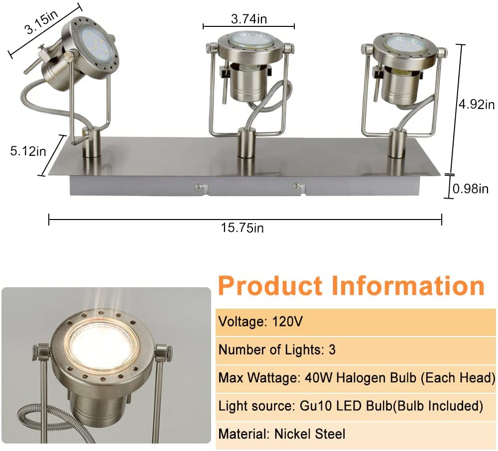 4. Energiansäästö: 3*3W pehmeä lämmin valo GU10 LED-lamppu (sisältää polttimo) tuottaa 720 lumenin kokonaisvalotehon, se voi kestää 50 000 tuntia, mikä säästää yli 80 % sähkölaskusta. Ja auttaa säästämään polttimoiden säännöllisen vaihdon kustannuksia. Tämä valoratasarja tukee 1-40 W lamppuja.