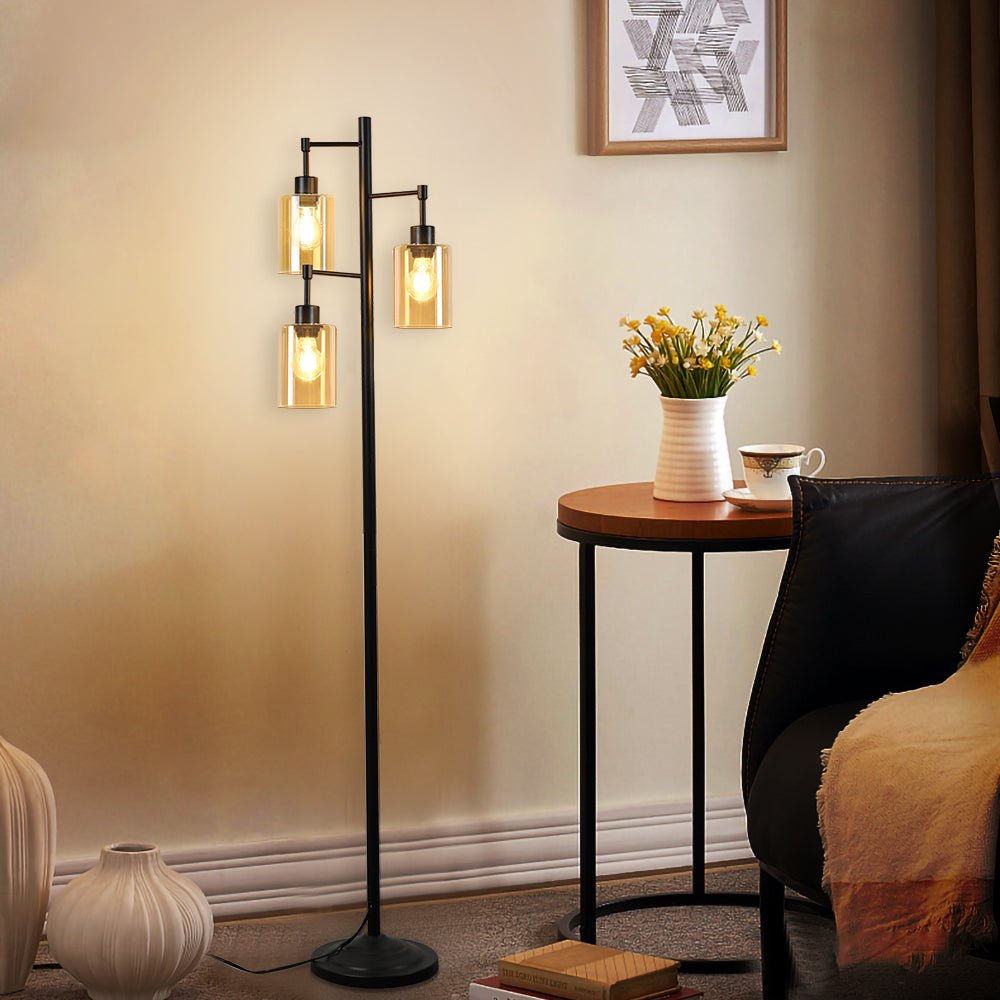 Depuley Industrial -lattiavalaisin olohuoneeseen, 3-valoinen maalaistalon puulattiavalaisin, maalaismainen seisova LED-lamppu meripihkanvärisellä lasivarjostimella, musta napainen korkea lattiavalaisi