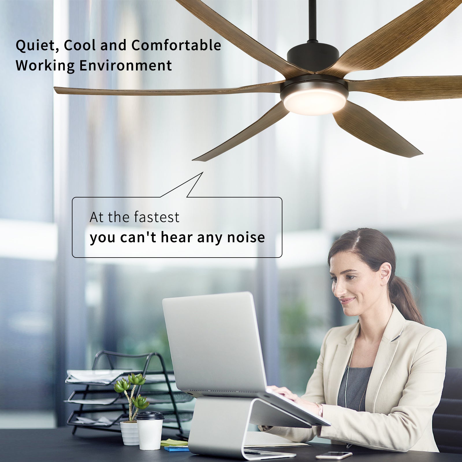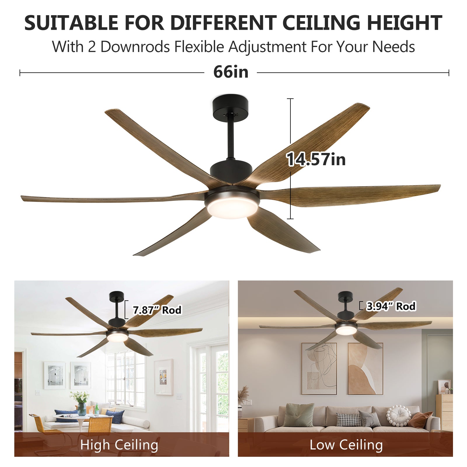 - 66 tuuman terät on valmistettu paksunnetusta ABS:stä, mikä tekee niistä kestäviä ja pitkäikäisiä. Tämä tuuletin on ihanteellinen huoneisiin, jotka ovat kooltaan 200-500 neliöjalkaa, kuten ruokasaleihin, makuuhuoneisiin, olohuoneisiin, kokoushuoneisiin ja katettuihin ulkotiloihin. Se lisää ripauksen nykyaikaista muotoilua mihin tahansa moderniin tilaan.