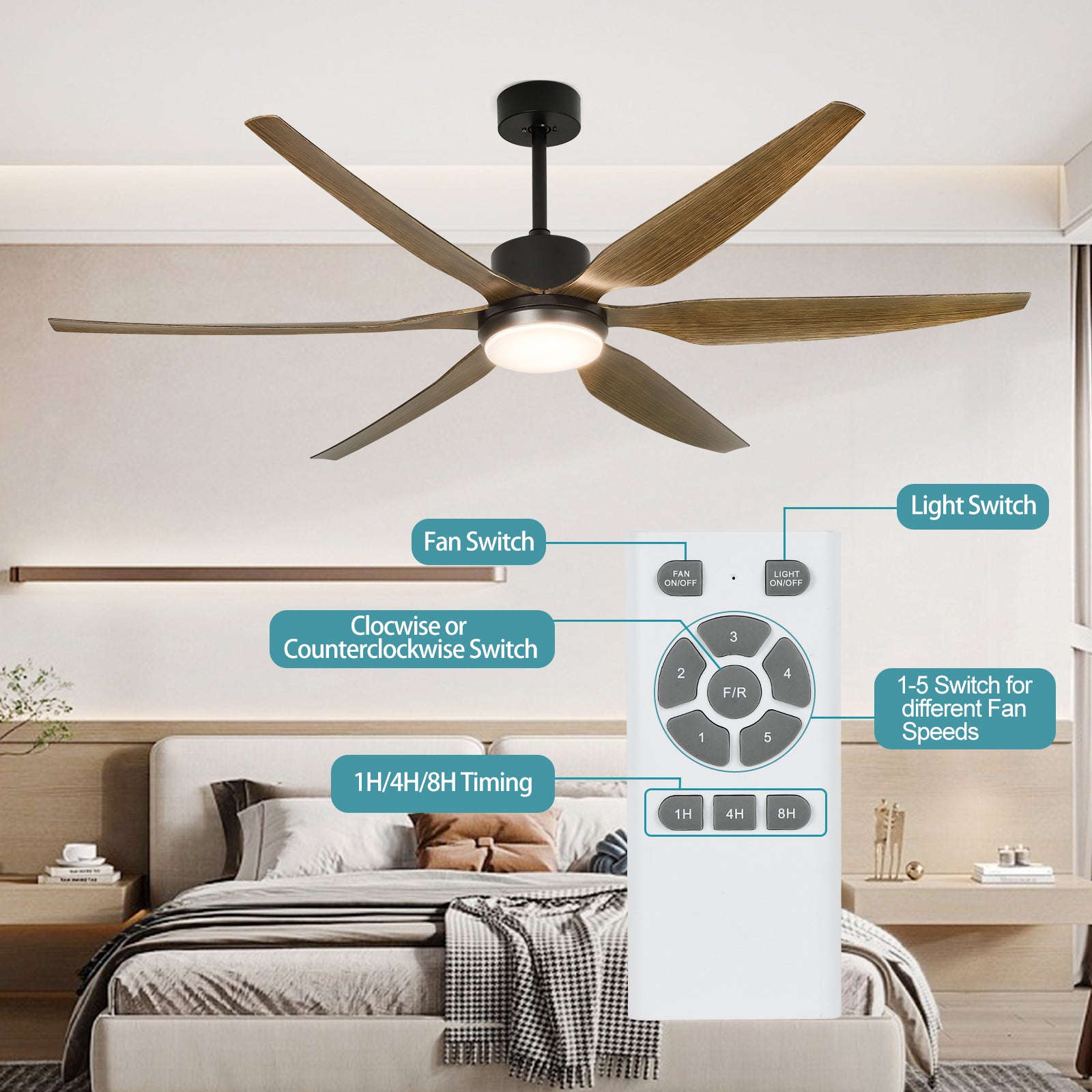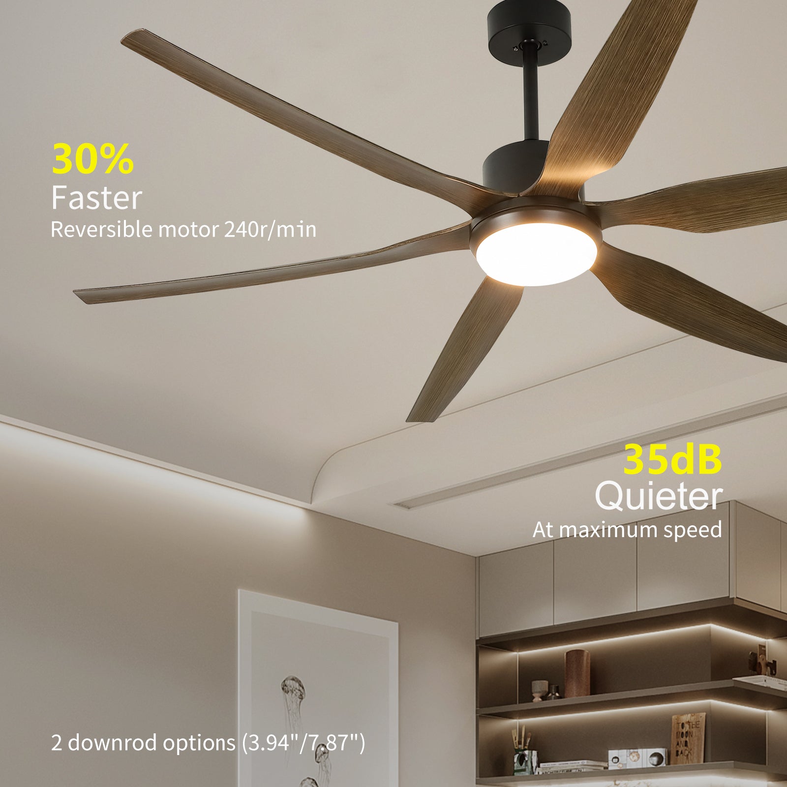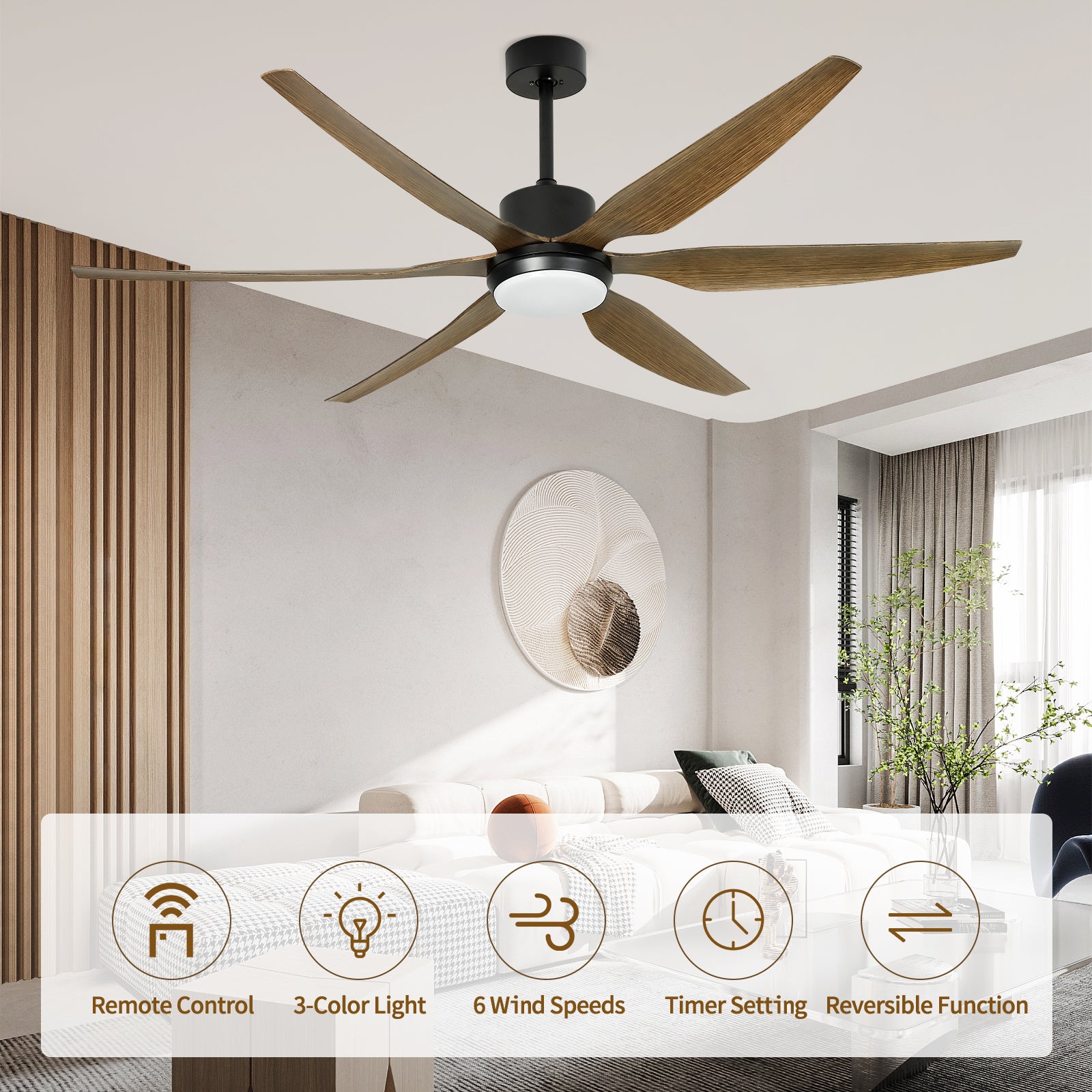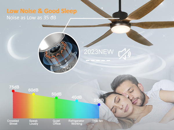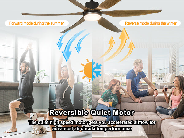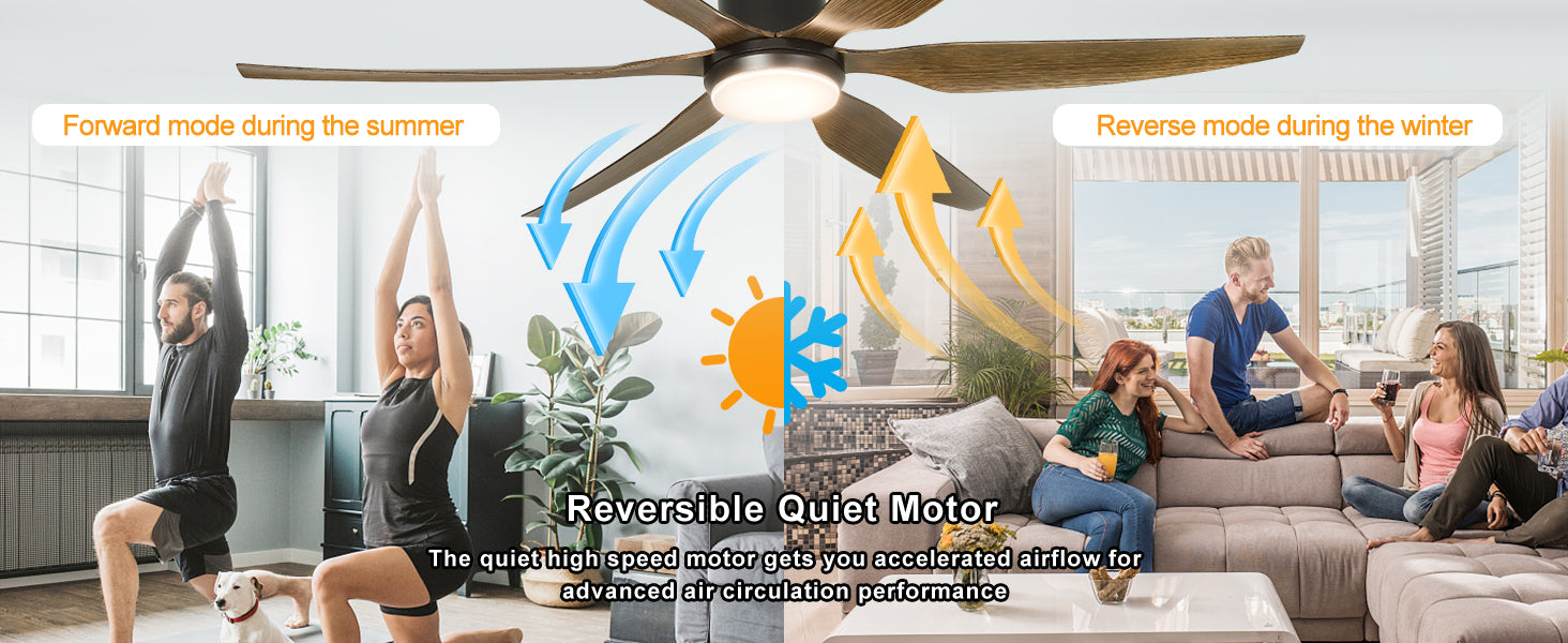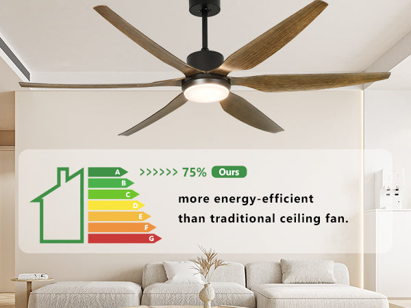 - Käännettävä ja tehokas huonetuuletin: Kiinteät mustat puusyvyiset siivet puhaltavat viileää ilmaa kesällä ja kierrättävät sisäilmaa talvella. DC-moottori on 75 % energiatehokkaampi kuin perinteinen AC-moottori. Se voi tarjota laajan alueen ilmankierron.