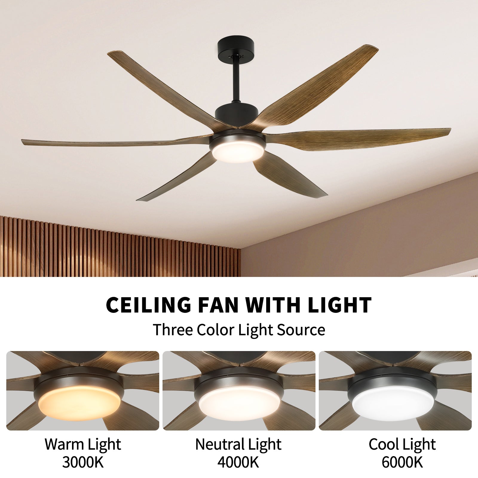 - Tässä modernissa kattotuulettimessa on 12 W himmennettävät LED-valot, jotka mahdollistavat säädettävän kirkkauden (0%-100%) ja kolme valon värivaihtoehtoa: lämmin, luonnollinen ja viileä. Voit helposti muuttaa huoneesi tunnelmaa tarpeidesi mukaan.