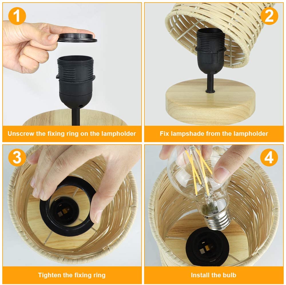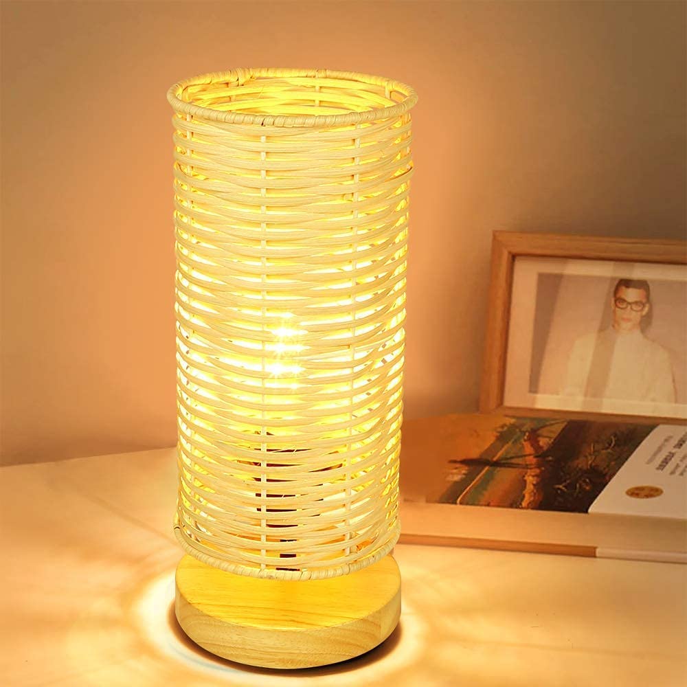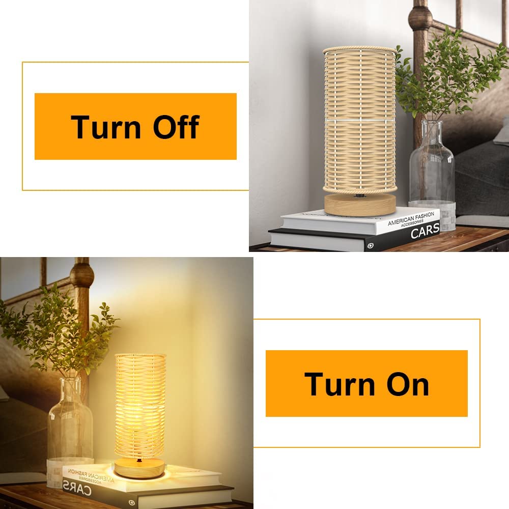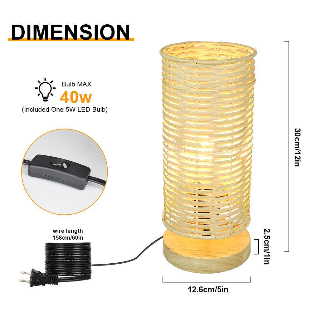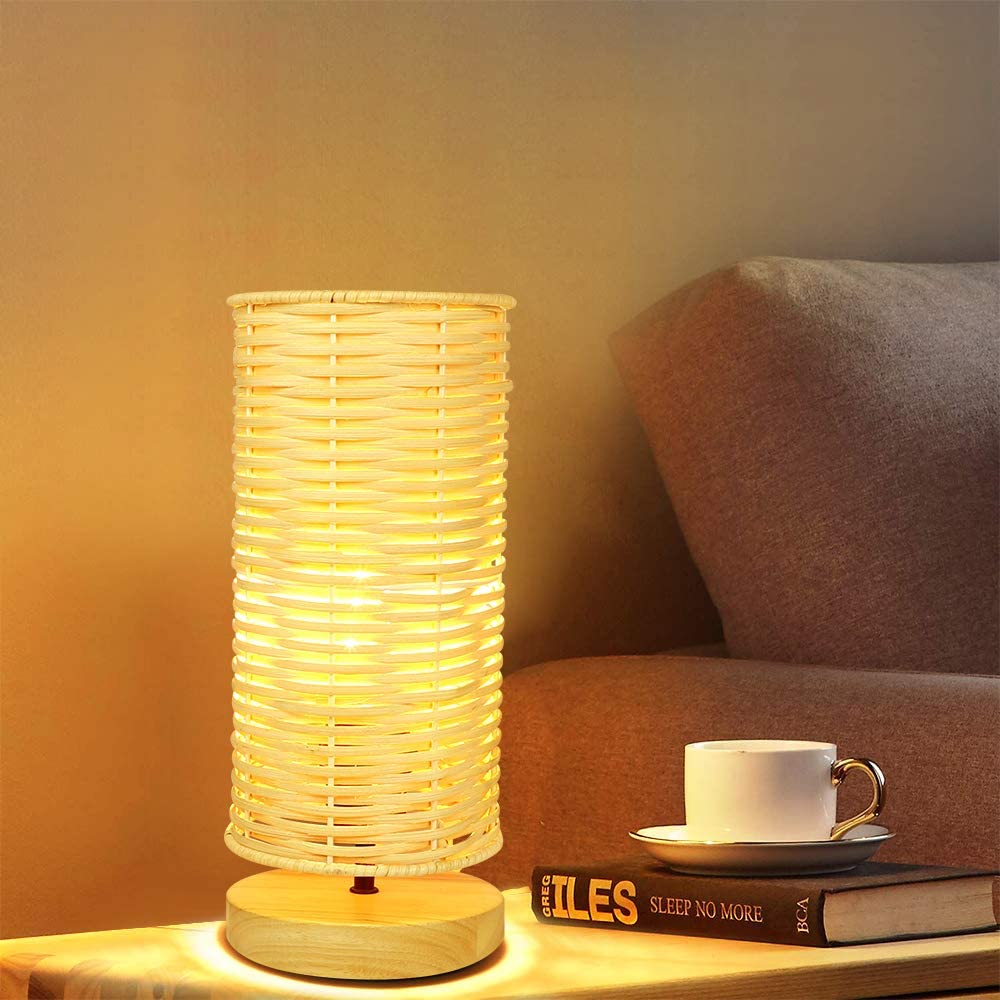 DLLT Yöpöytälamppu, Yksinkertainen LED-pöytälamppu, kumipuuinen yöpöytälamppu pyöreällä rottinkivarjostimella lastenhuoneeseen, korkeakoulun asuntola, olohuone, makuuhuone, sohvapöytä, kirjahylly, työ