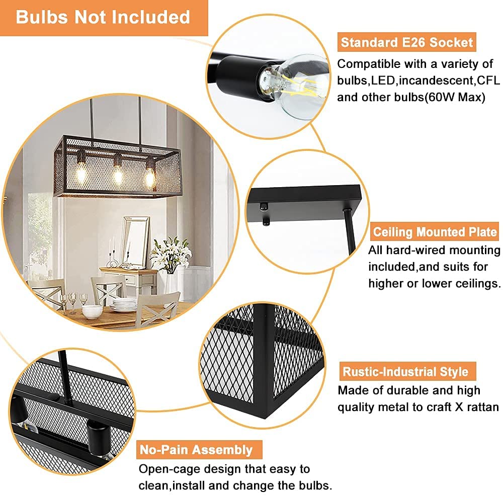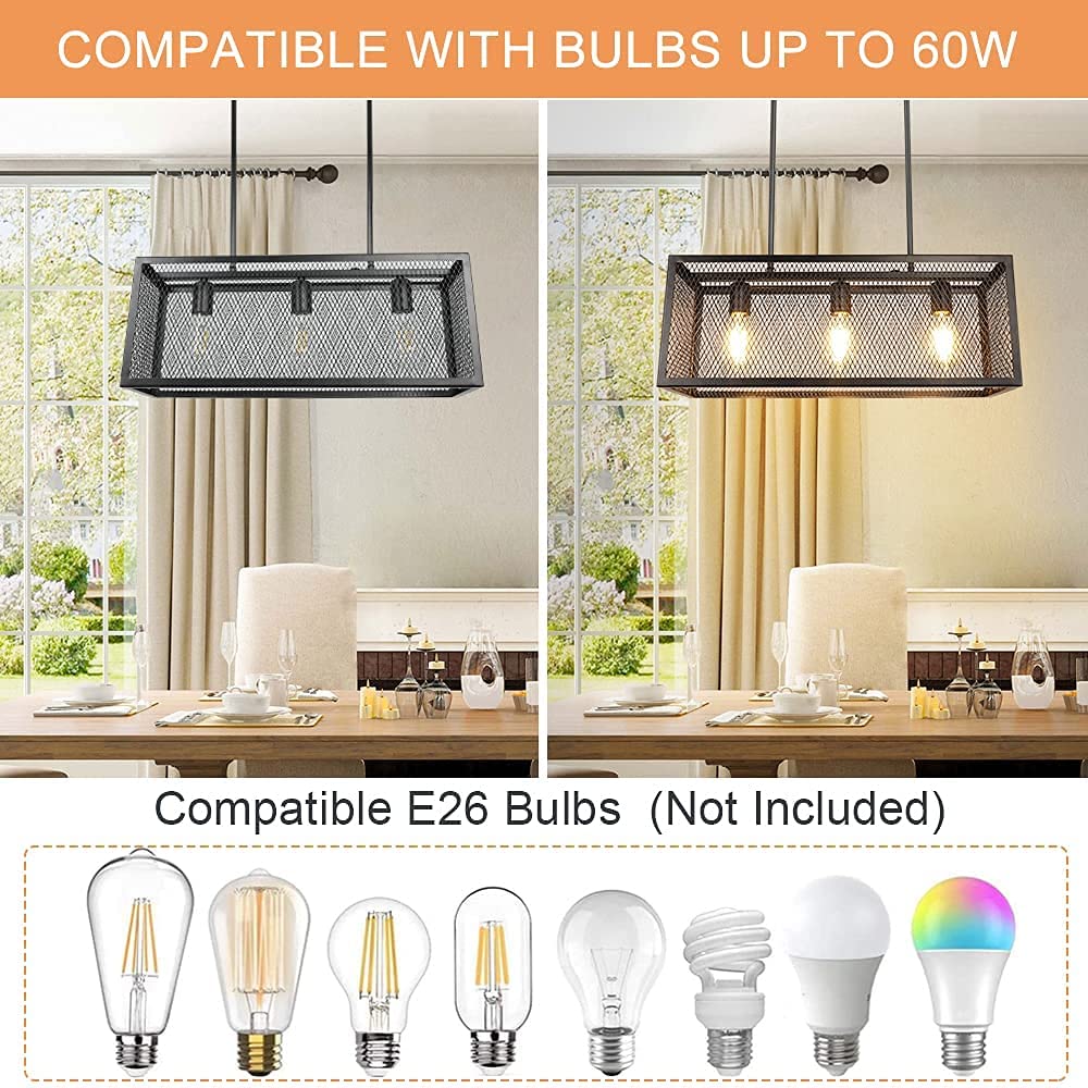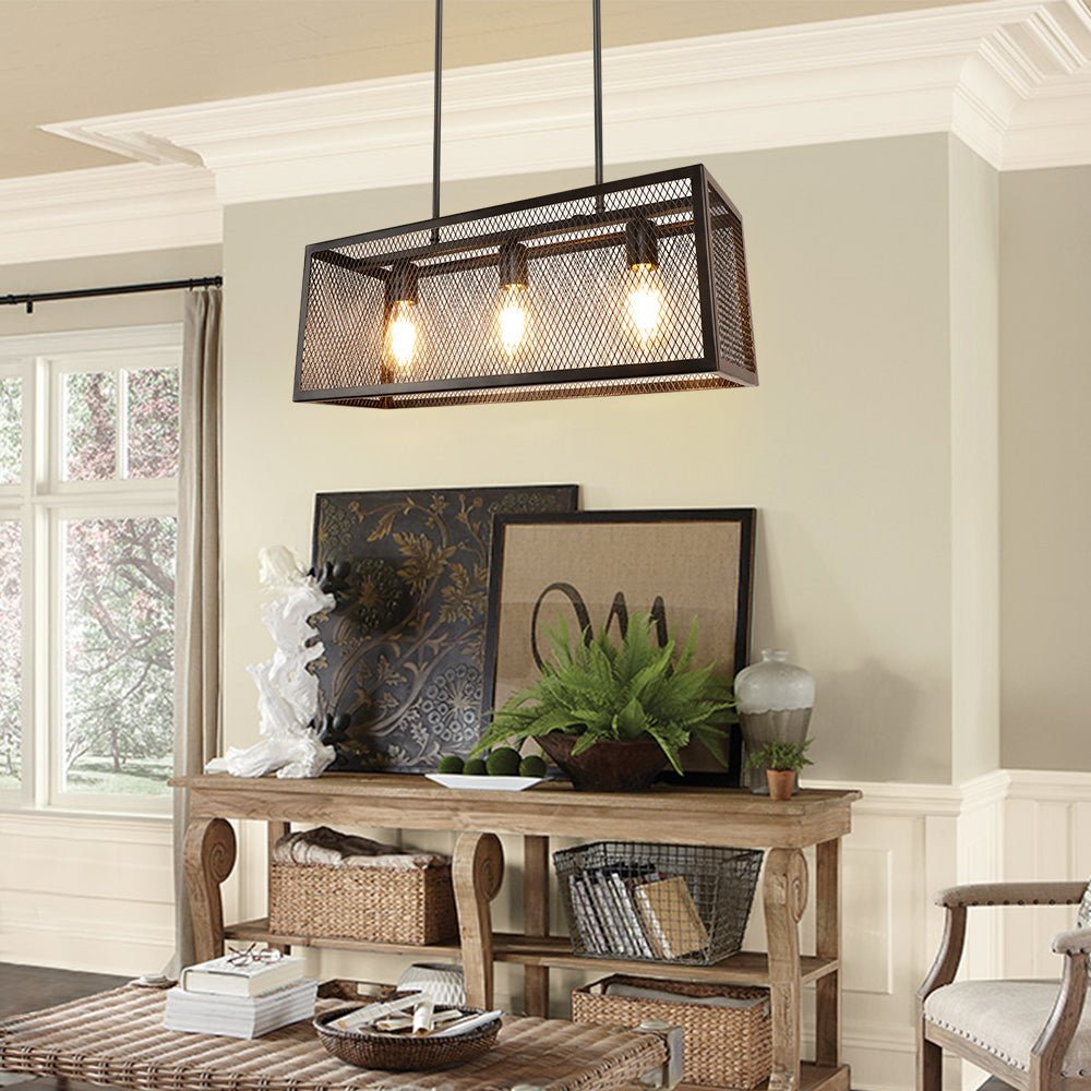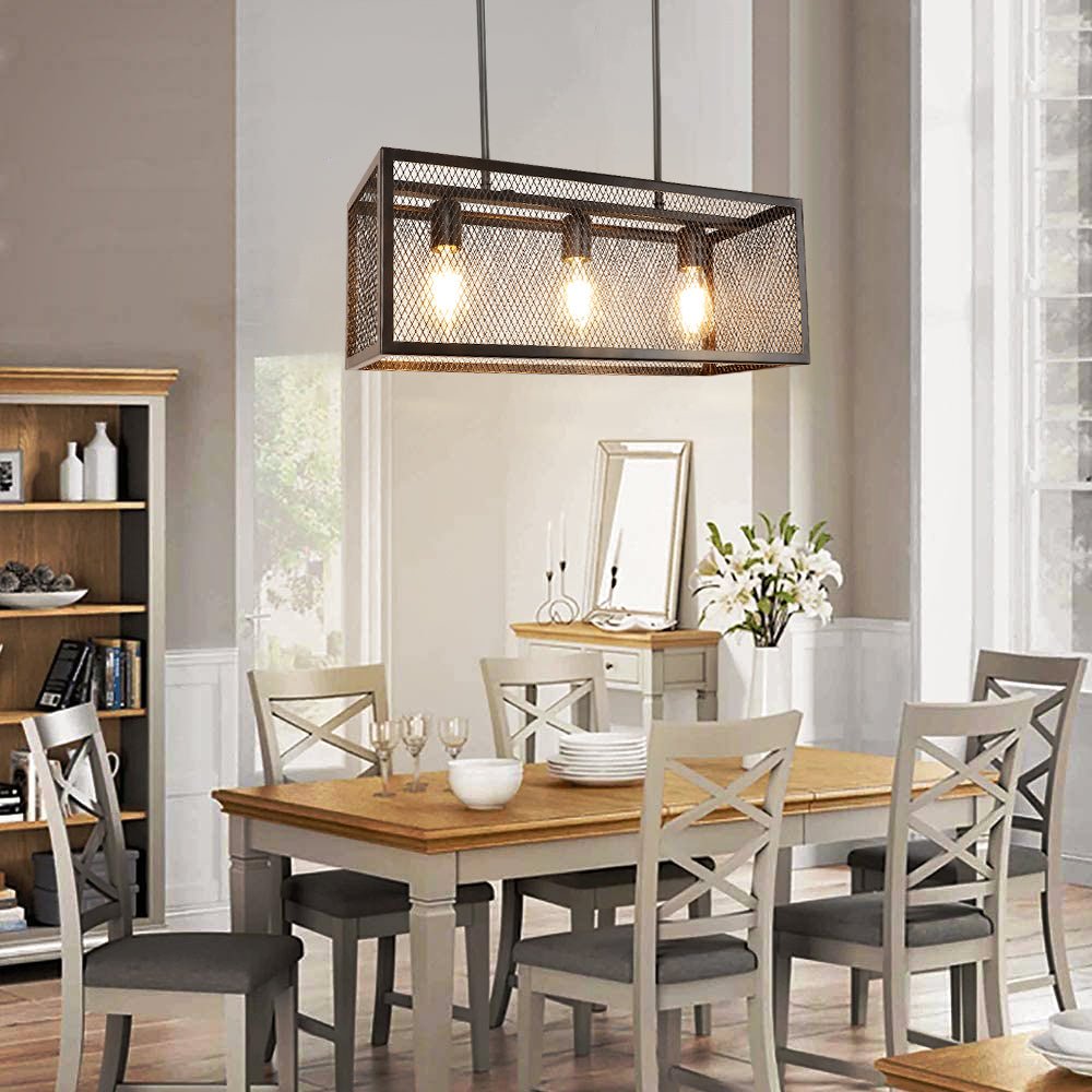 Depuley Industrial Kitchen Island -valaisin, 3-valoa säädettävä metalliverkkoriippuvalaisin, suorakaiteen muotoinen lineaarinen kattokruunu
