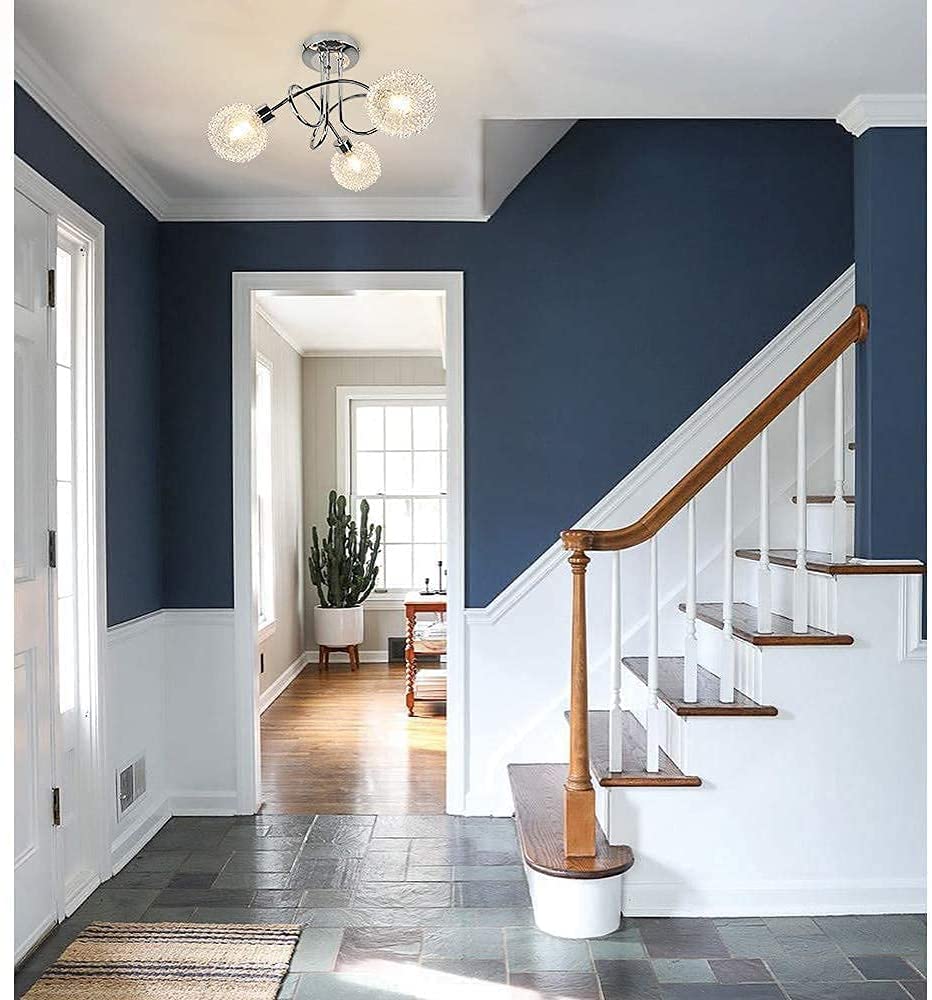 Moderni ja minimalistinen: Tämä puolitasossa asennettava kattovalaisin alumiiniseoksella valmistettu valojalusta, moderni kaareva ristikkäinen valopylväsrakenne ja tyylikkäät kaksoislamppuvarjostimet (lasi- ja verkkolanka) valaisevat kotisi lämmöllä ja korostaa tyyliäsi. Mukauta asuintilasi ja luo mukava tunnelma. Täydellinen keittiöön, olohuoneeseen, makuuhuoneeseen, hotelleihin, vaateliikkeisiin, eteiseen, eteiseen ja niin edelleen.