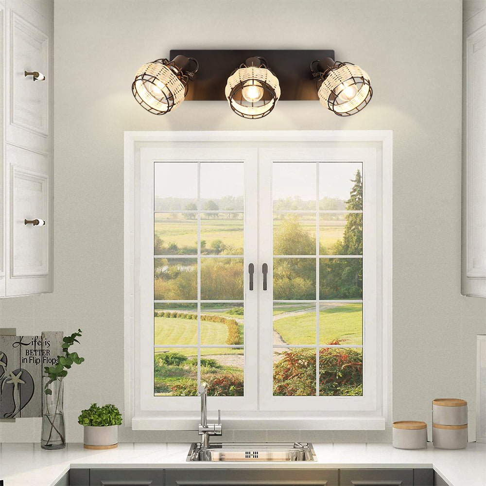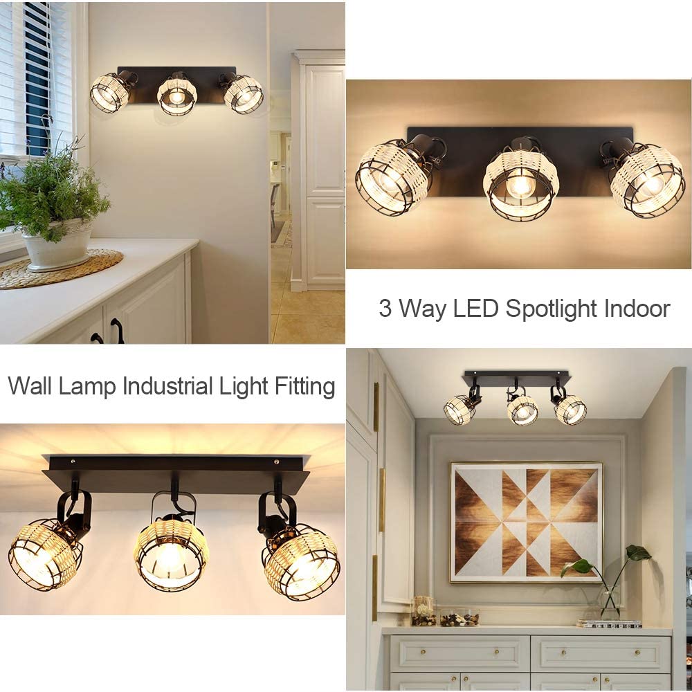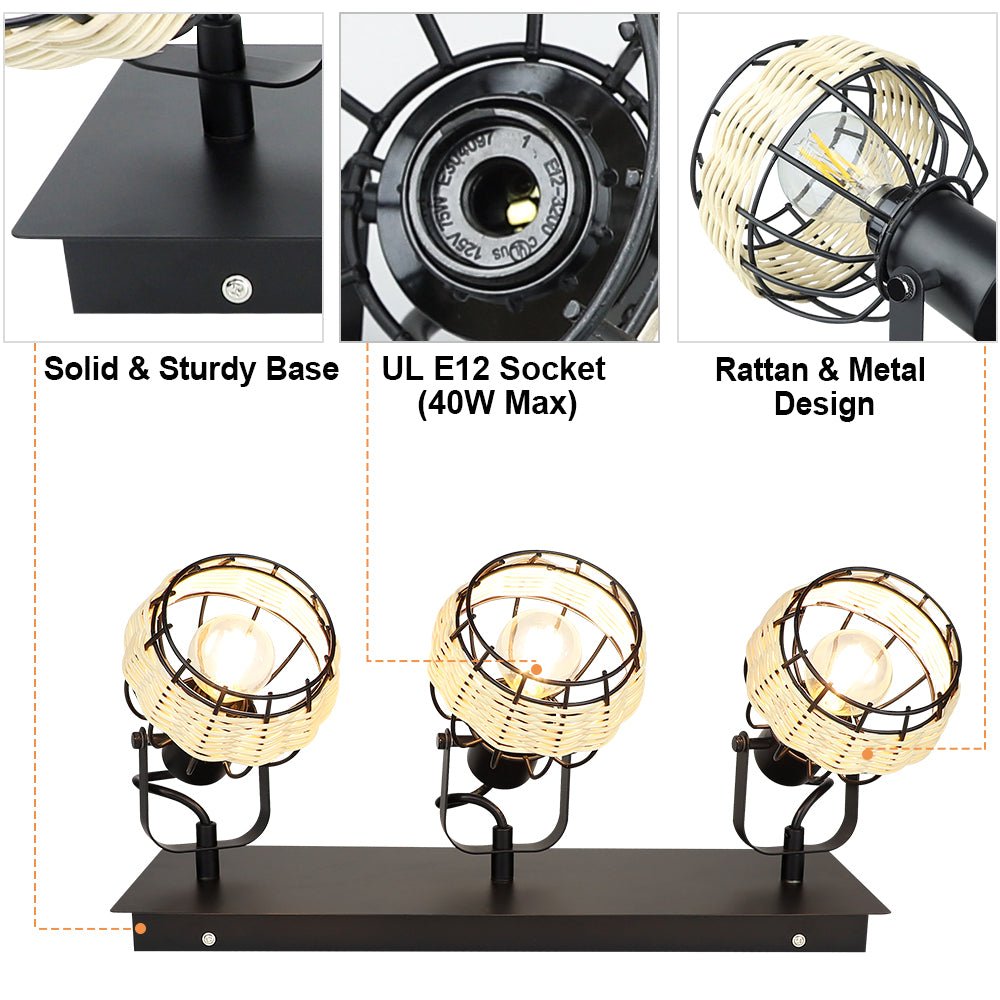 Depuley Rustic Metal and Rattan 3-Light seinävalaisin, säädettävällä suuntaisella lampunvarjostimella