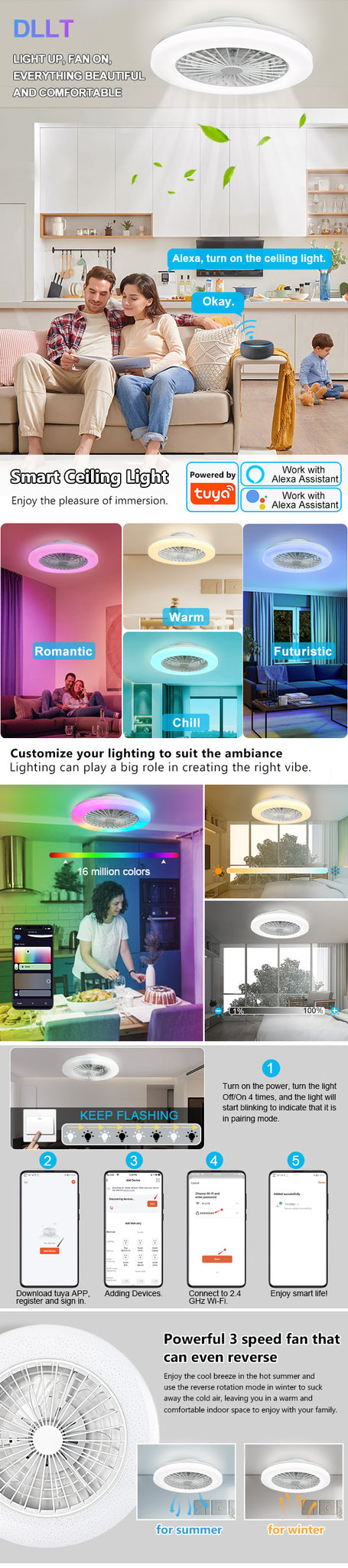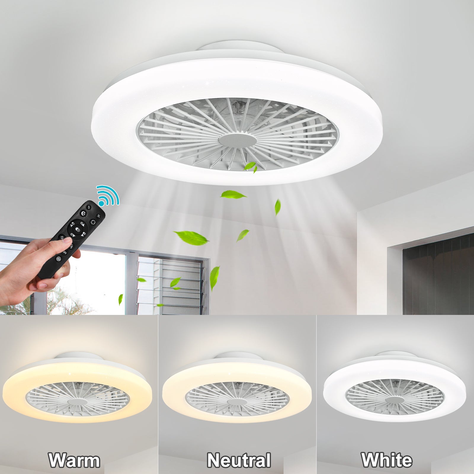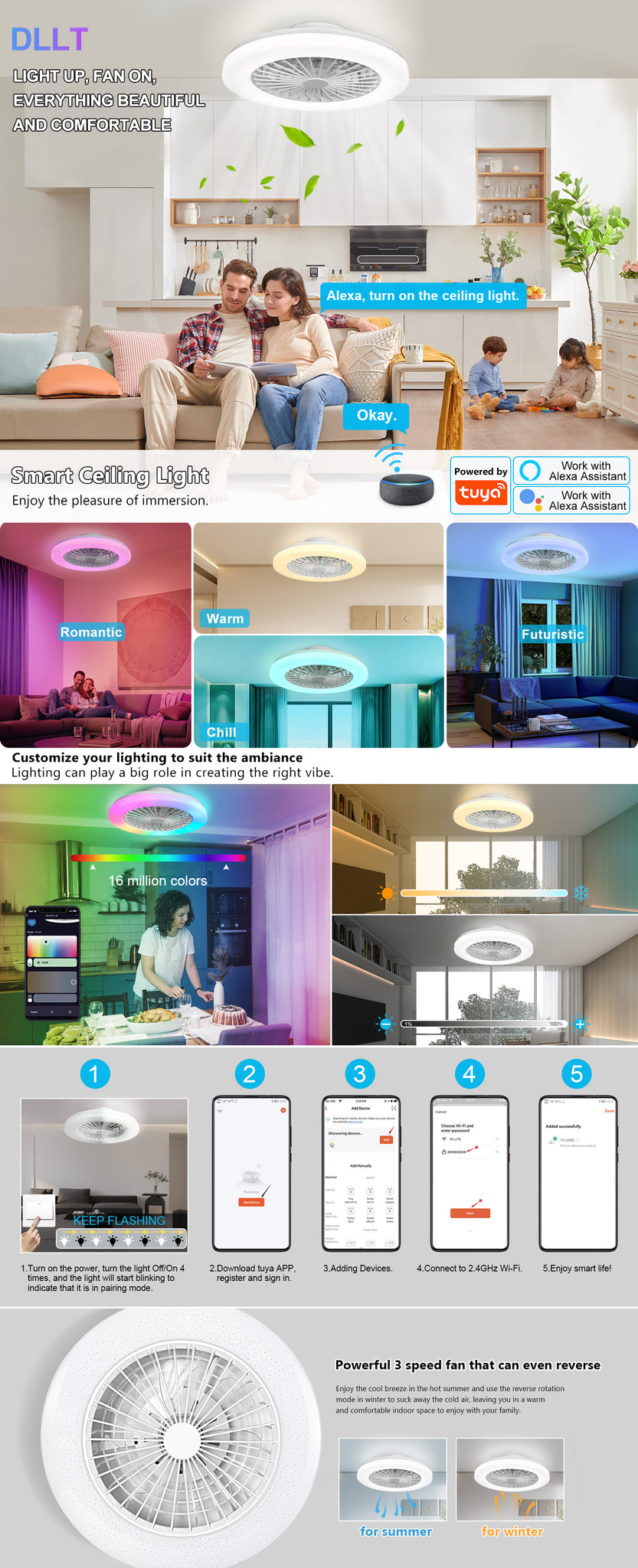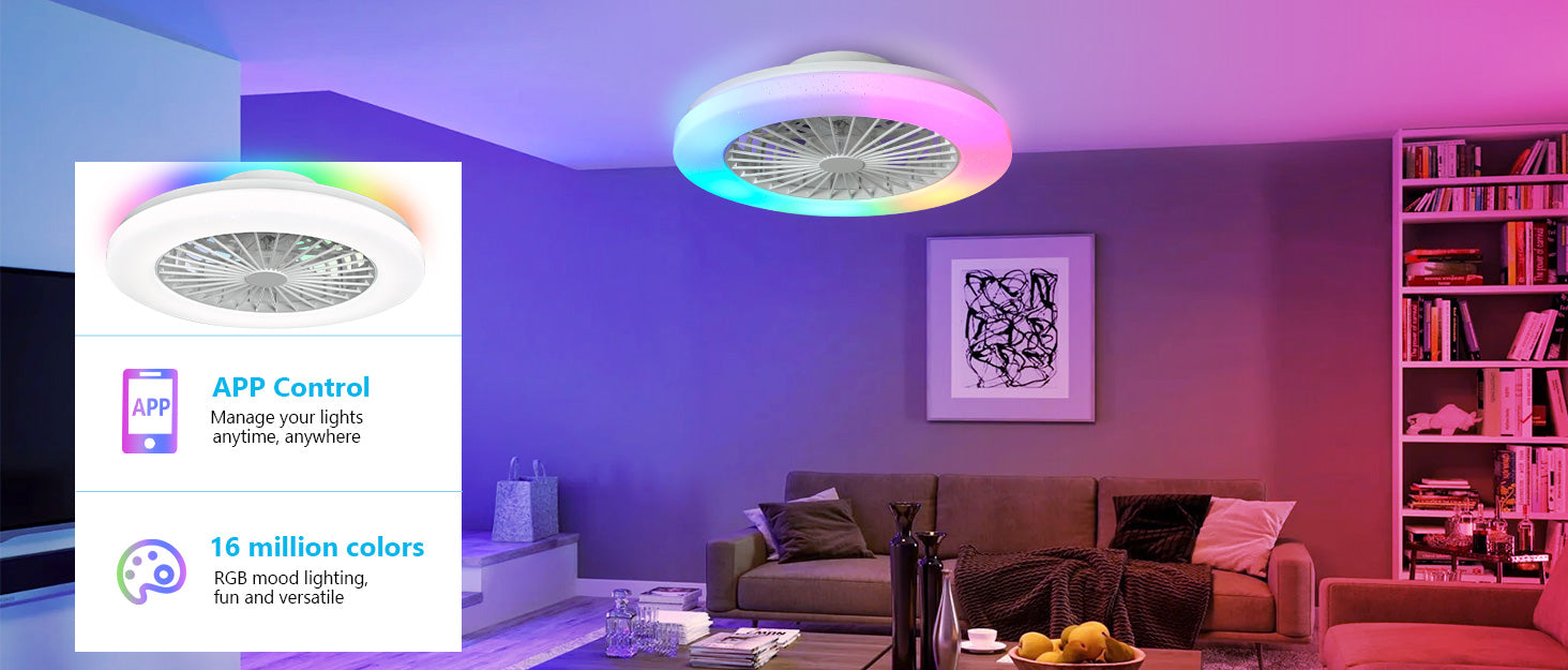 - Himmennettävä RGB-tuulettimen valo - Himmentää tai kirkastaa etuvalon valkoista valoa ALEXA- tai Smartphone APP TUYA -sovelluksella Smart Lifen iOS:lle ja Androidille. Älykäs LED-valolähde tukee 2700K lämpimän valon säätöä 6500K päivänvaloon. Älykäs matalaprofiilinen kattotuuletin valolla voi tarjota upean ympäristön rgb-valon mitä haluat. Ryhmä- tai yksittäinen ohjaus, ajastin ja aikataulu ovat käytettävissä.