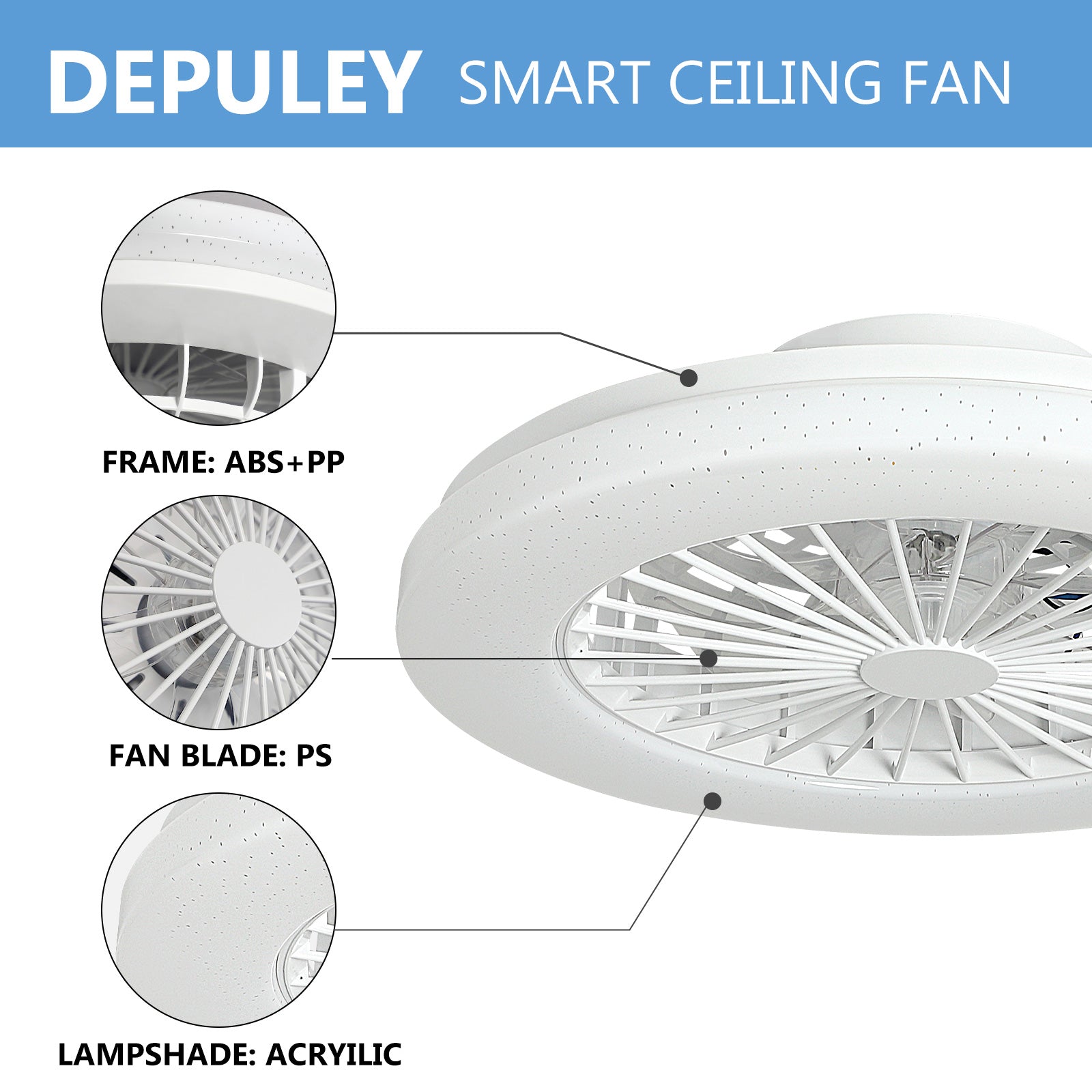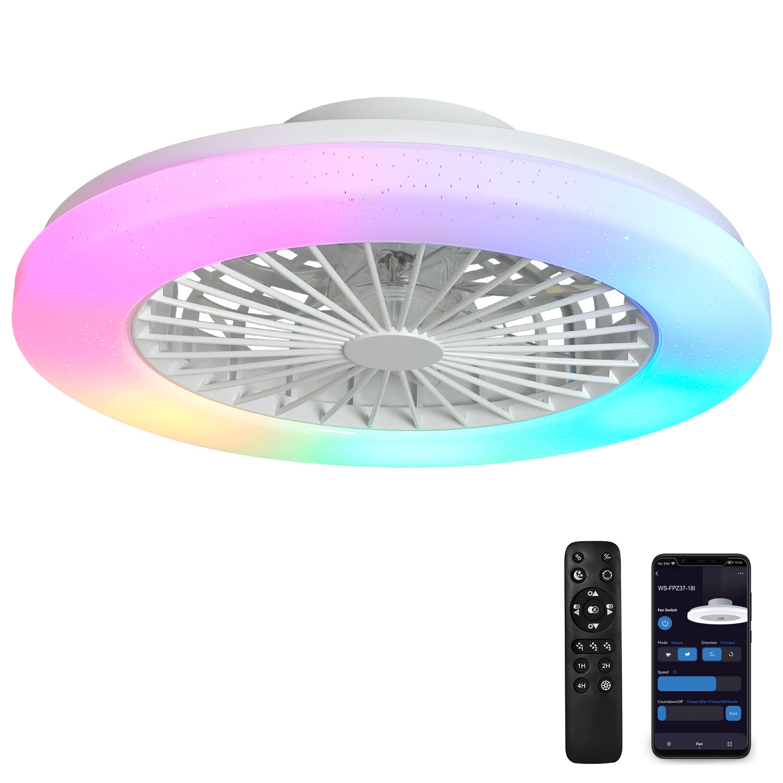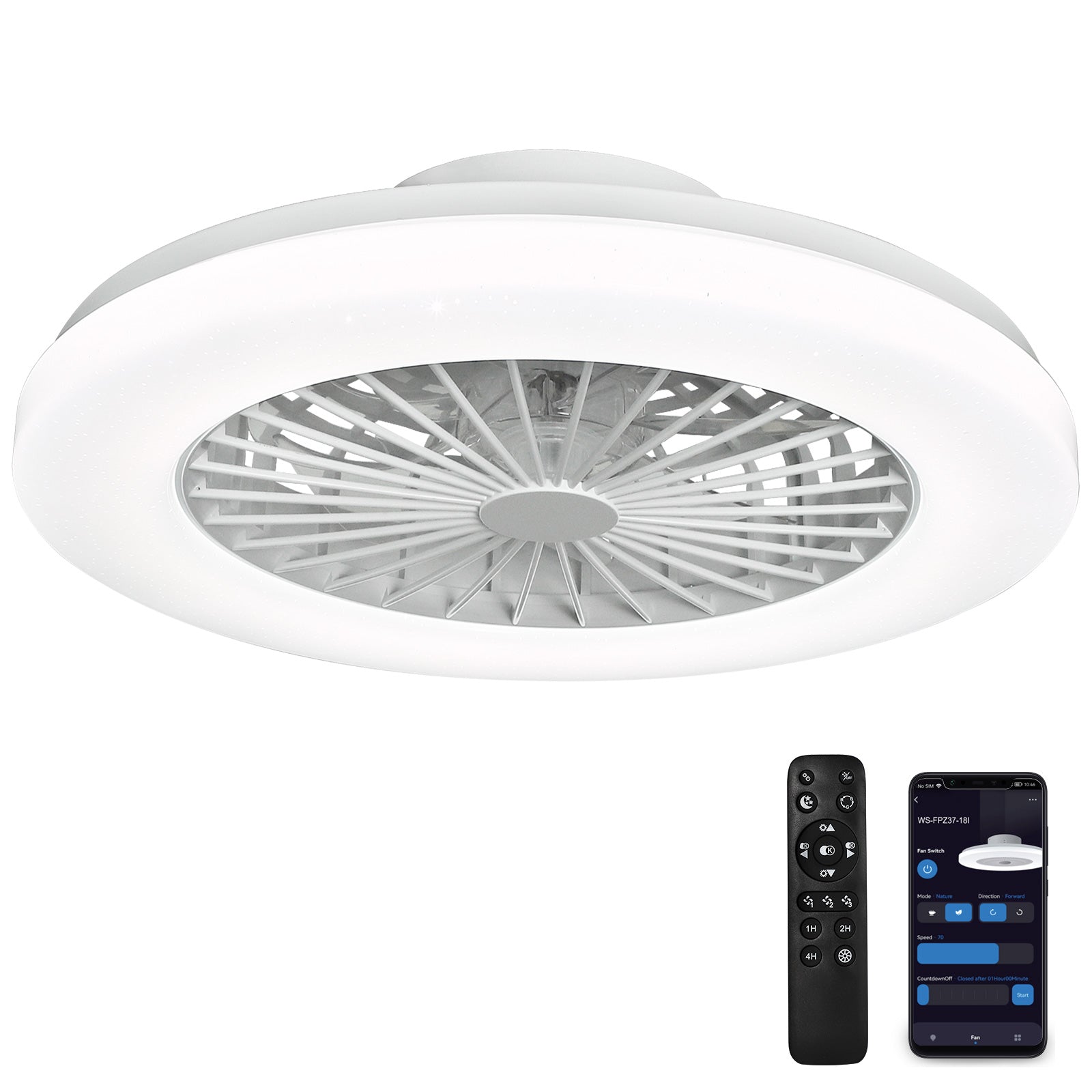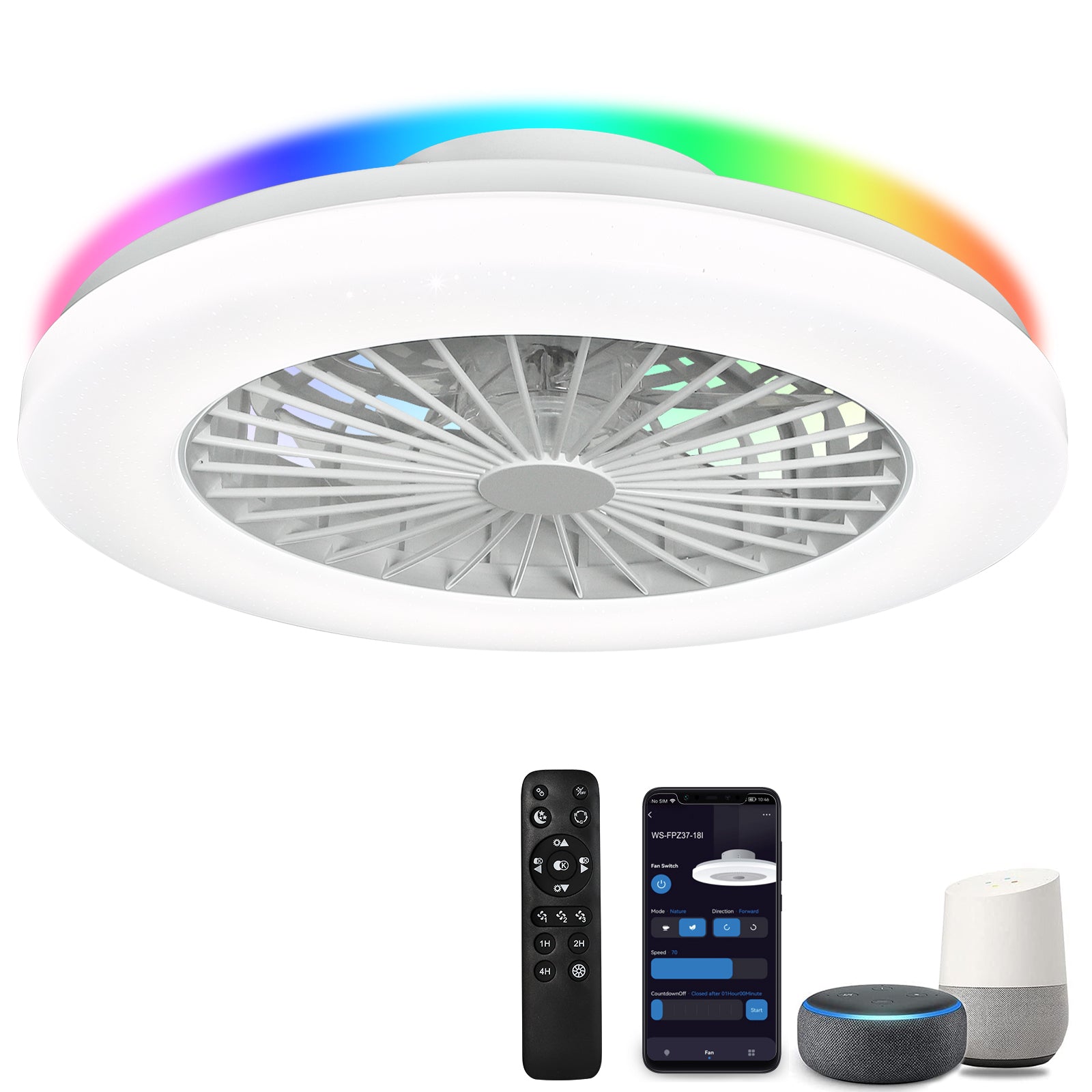 - Himmennettävä RGB-tuulettimen valo - Himmentää tai kirkastaa etuvalon valkoista valoa ALEXA- tai Smartphone APP TUYA -sovelluksella Smart Lifen iOS:lle ja Androidille. Älykäs LED-valolähde tukee 2700K lämpimän valon säätöä 6500K päivänvaloon. Älykäs matalaprofiilinen kattotuuletin valolla voi tarjota upean ympäristön rgb-valon mitä haluat. Ryhmä- tai yksittäinen ohjaus, ajastin ja aikataulu ovat käytettävissä.