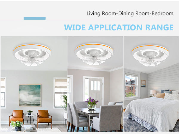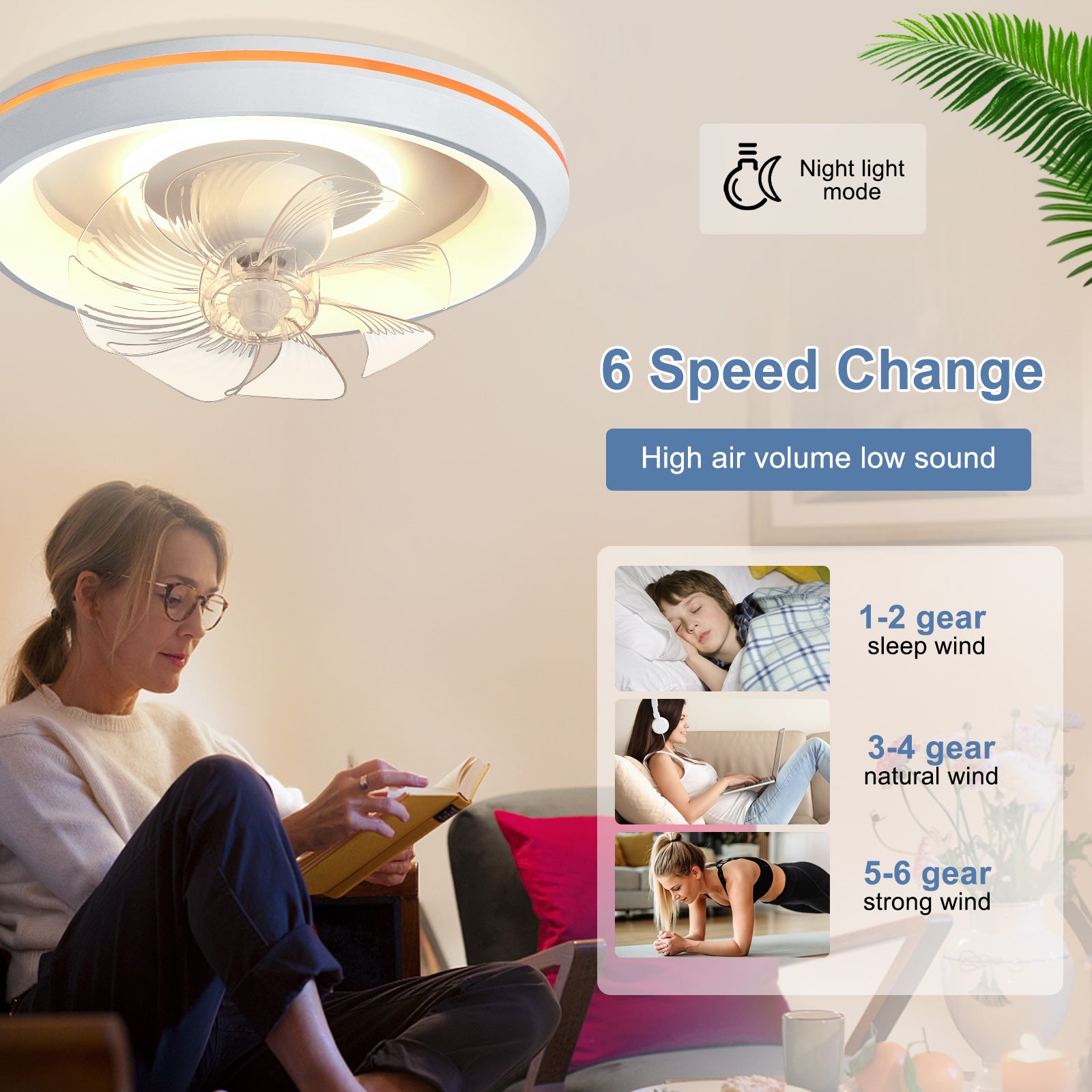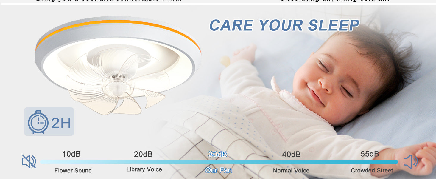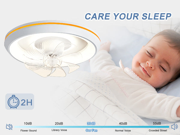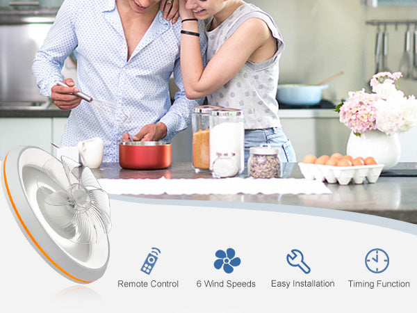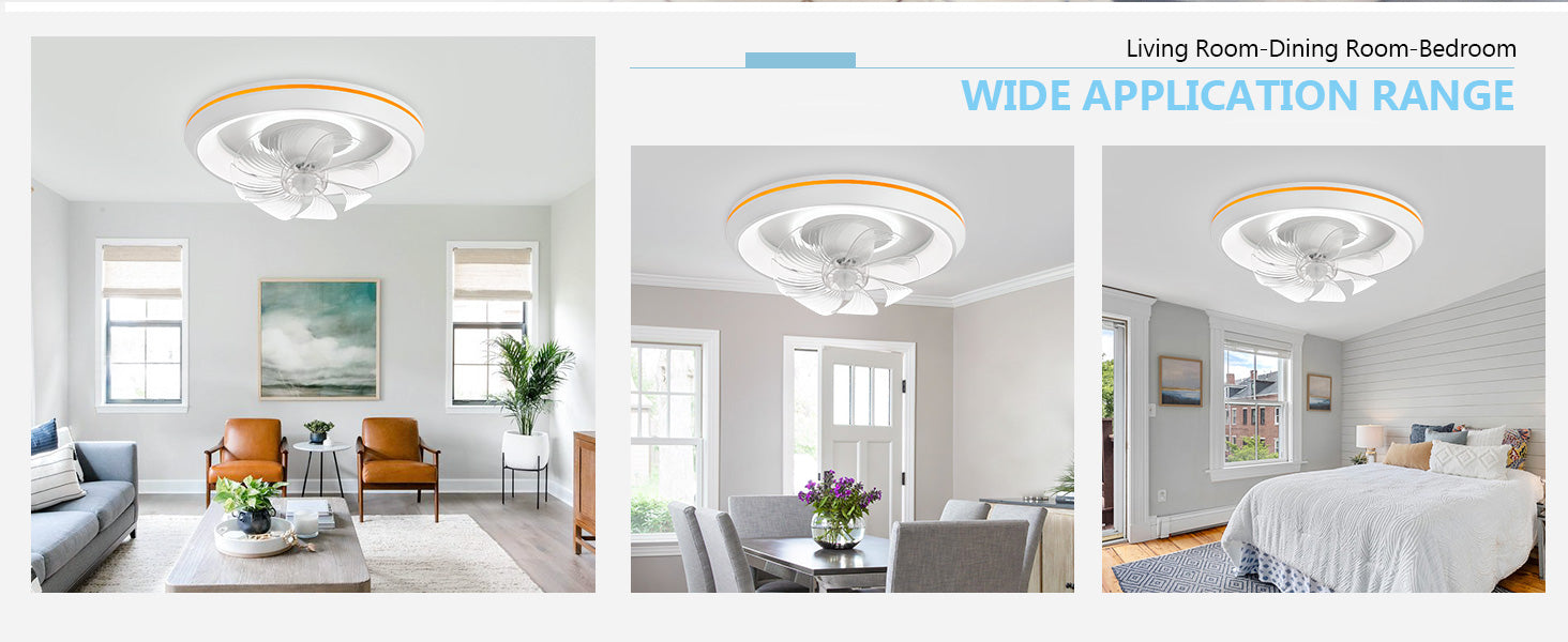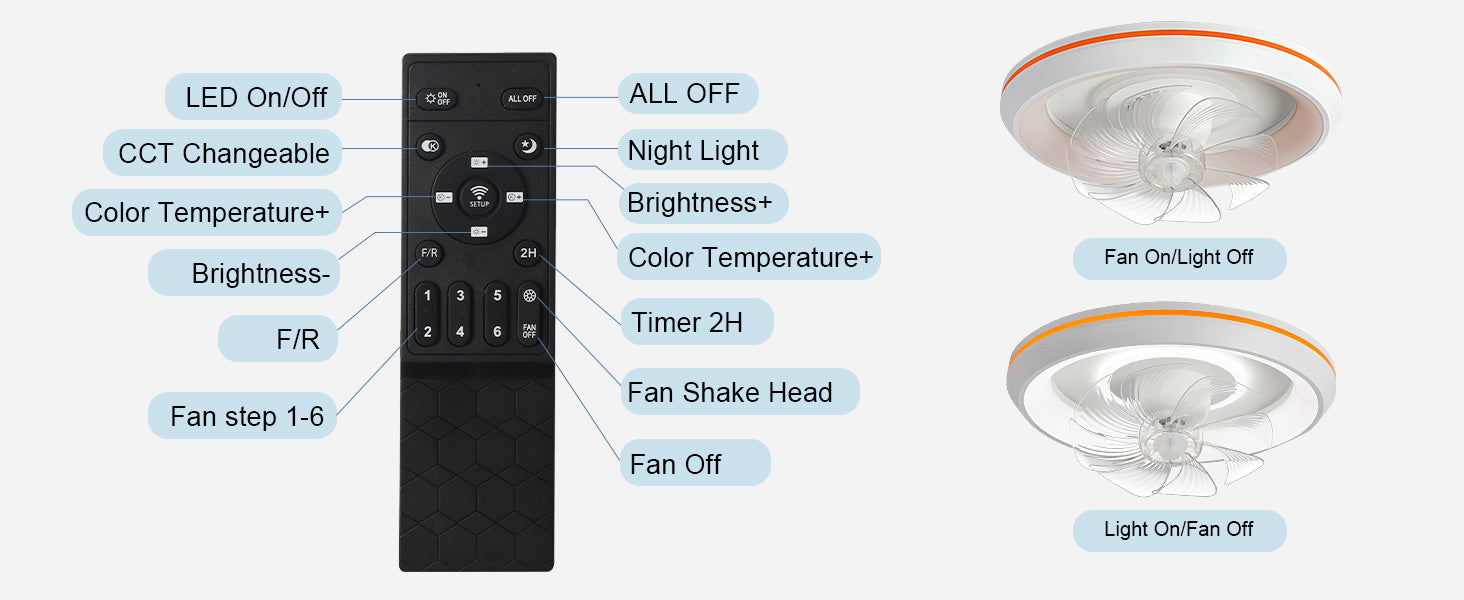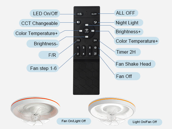 - �Uusi muotoilu: Tämä matalaprofiilinen kattotuuletin voi pyöriä 360° varmistaakseen, että ilma ohjautuu huoneen jokaiseen nurkkaan. Tuulen nopeudet voivat olla 1-6. Siinä on myös 6 säädettävää värivaloa. / lämpötiloissa, mikä voi auttaa säästämään energiaa. Lisäksi siinä on ajastusominaisuus, jonka avulla voit asettaa sen 2 tunniksi, sekä yövalotila, joka varmistaa mukavat yöunet.