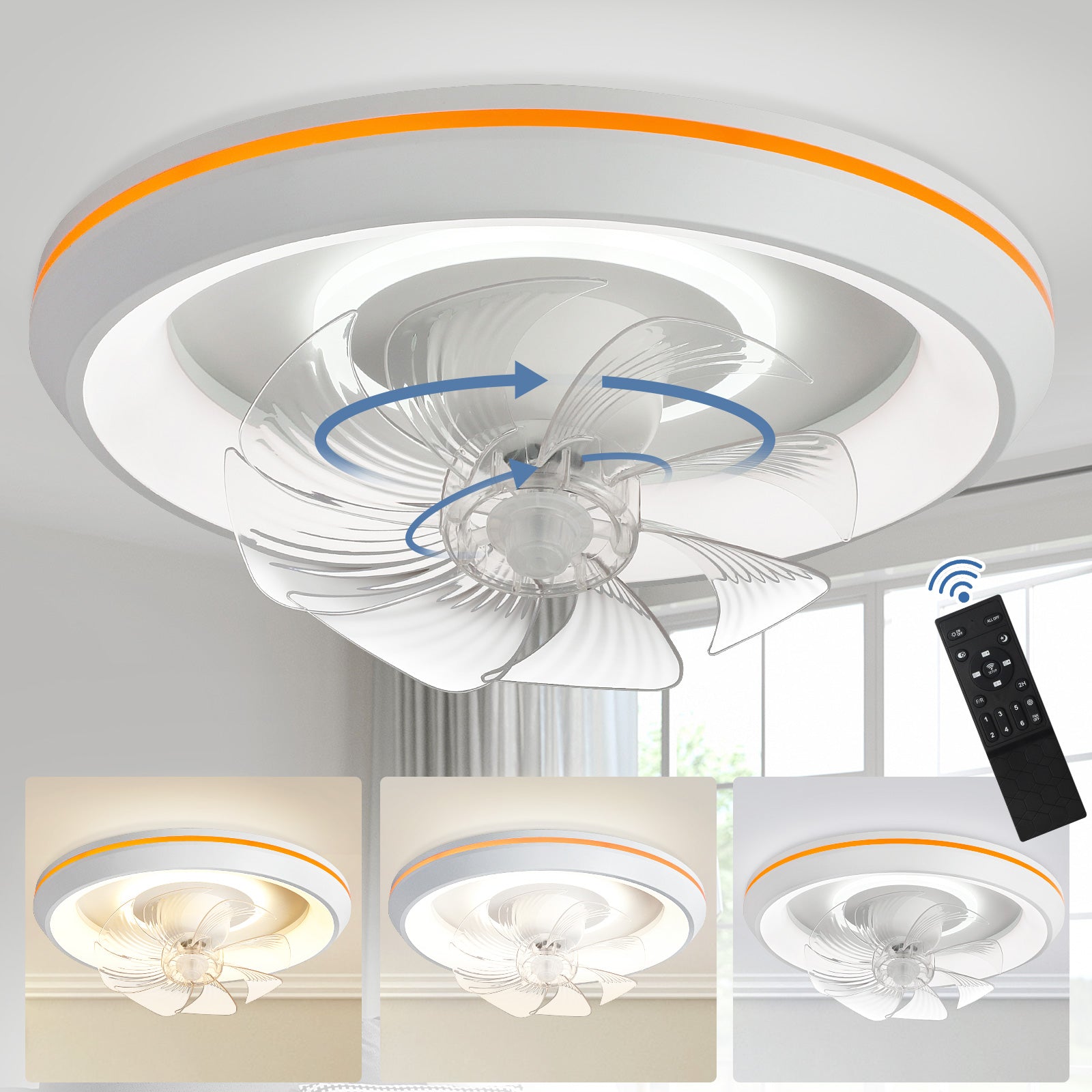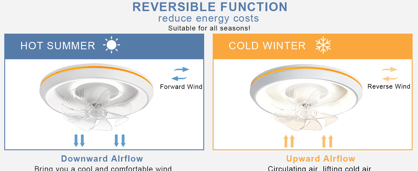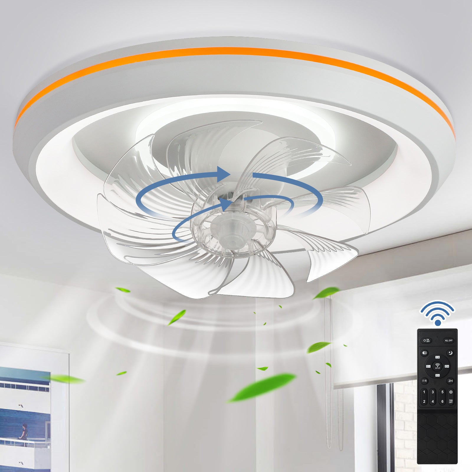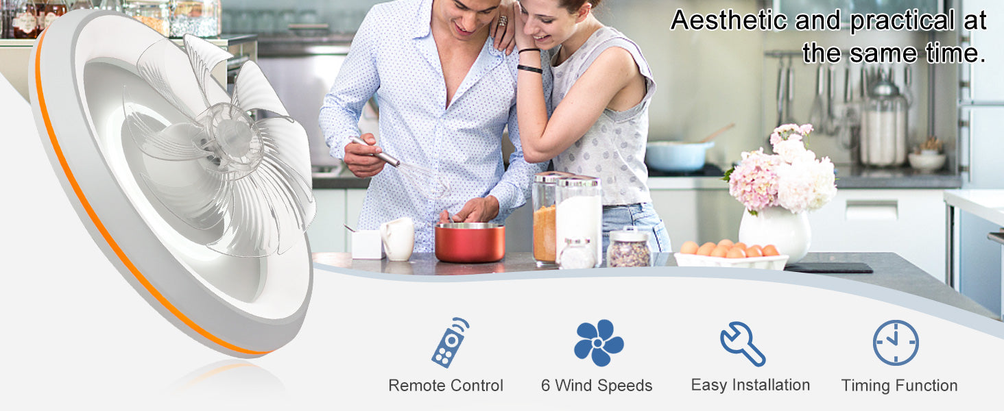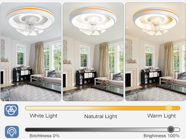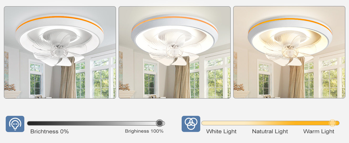- �Uusi muotoilu: Tämä matalaprofiilinen kattotuuletin voi pyöriä 360° varmistaakseen, että ilma ohjautuu huoneen jokaiseen nurkkaan. Tuulen nopeudet voivat olla 1-6. Siinä on myös 6 säädettävää värivaloa. / lämpötiloissa, mikä voi auttaa säästämään energiaa. Lisäksi siinä on ajastusominaisuus, jonka avulla voit asettaa sen 2 tunniksi, sekä yövalotila, joka varmistaa mukavat yöunet.
