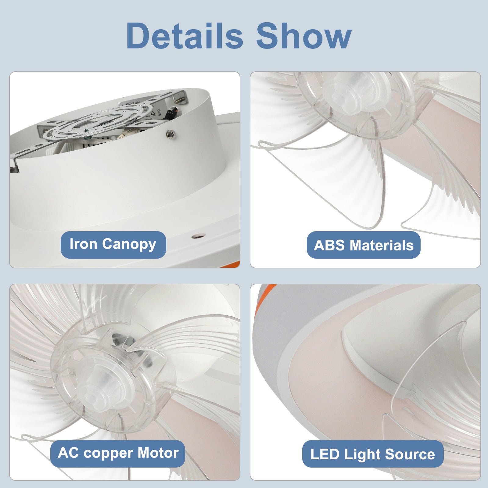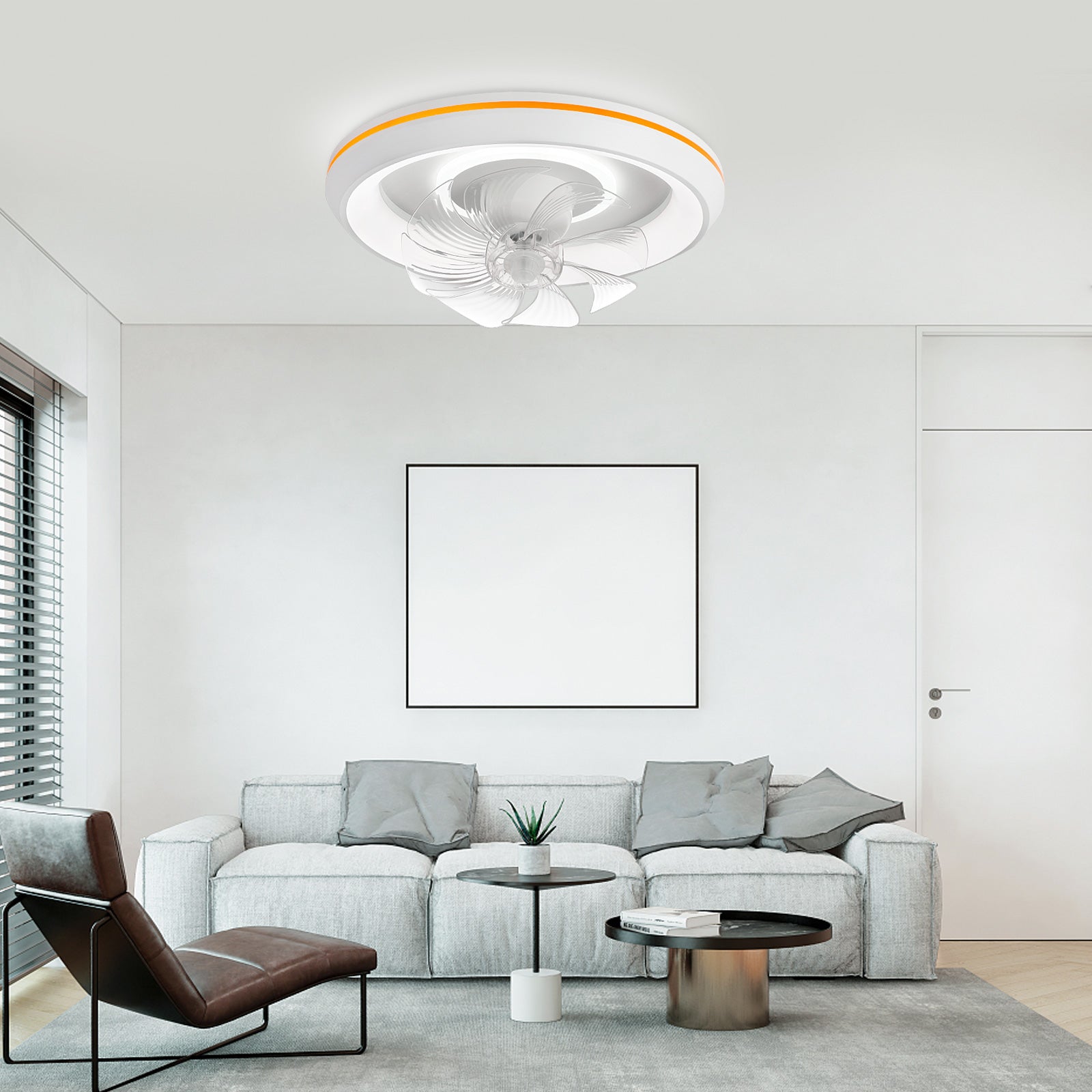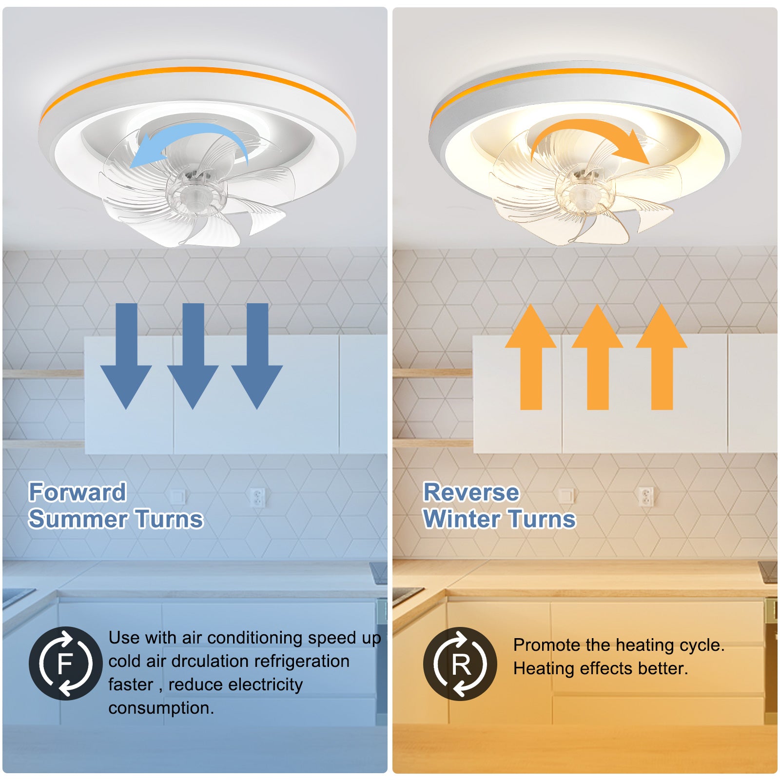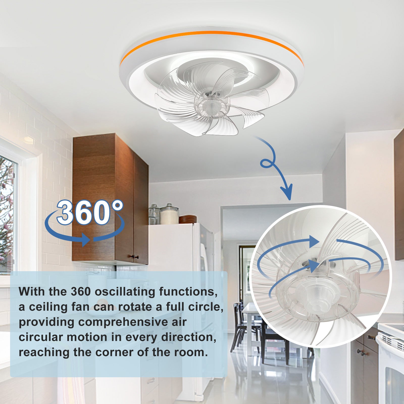 - �Uusi muotoilu: Tämä matalaprofiilinen kattotuuletin voi pyöriä 360° varmistaakseen, että ilma ohjautuu huoneen jokaiseen nurkkaan. Tuulen nopeudet voivat olla 1-6. Siinä on myös 6 säädettävää värivaloa. / lämpötiloissa, mikä voi auttaa säästämään energiaa. Lisäksi siinä on ajastusominaisuus, jonka avulla voit asettaa sen 2 tunniksi, sekä yövalotila, joka varmistaa mukavat yöunet.