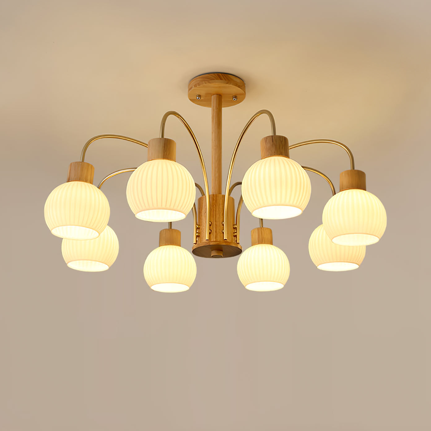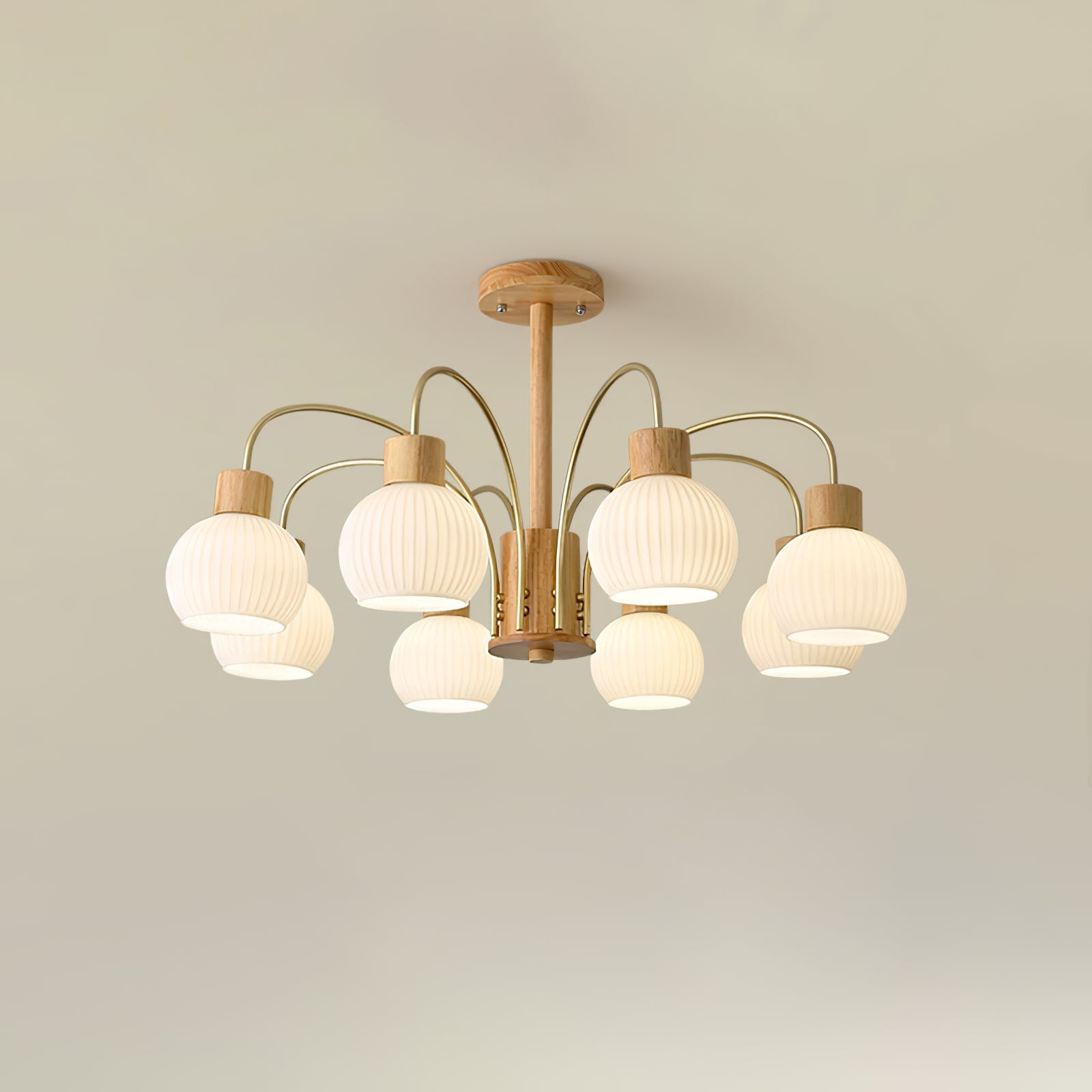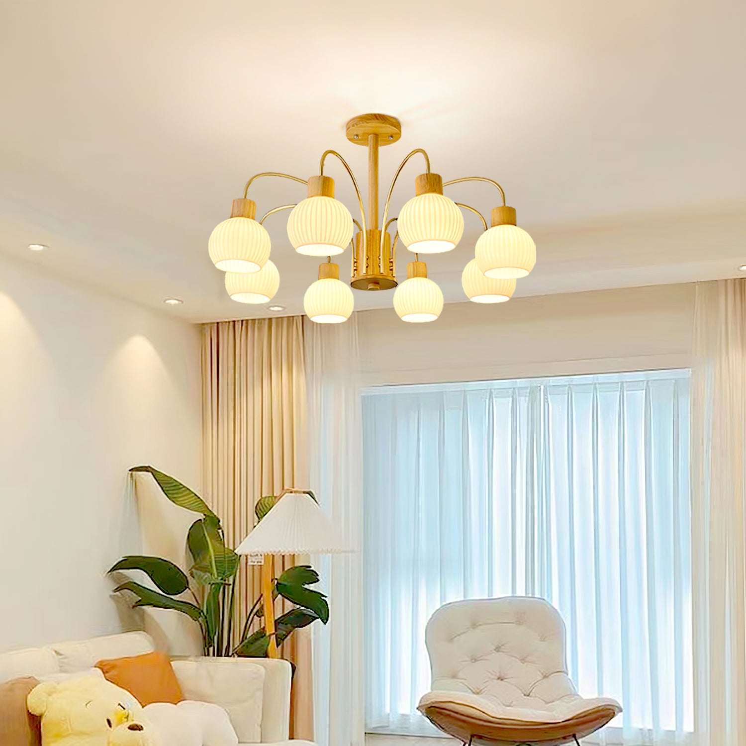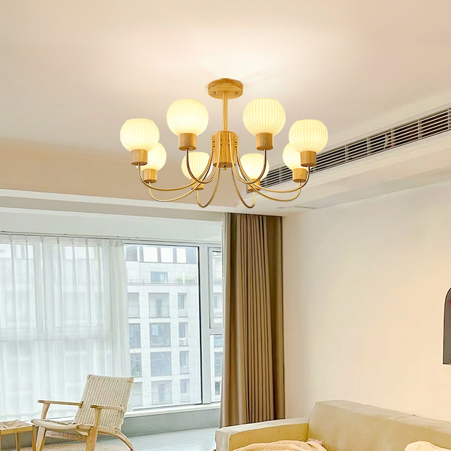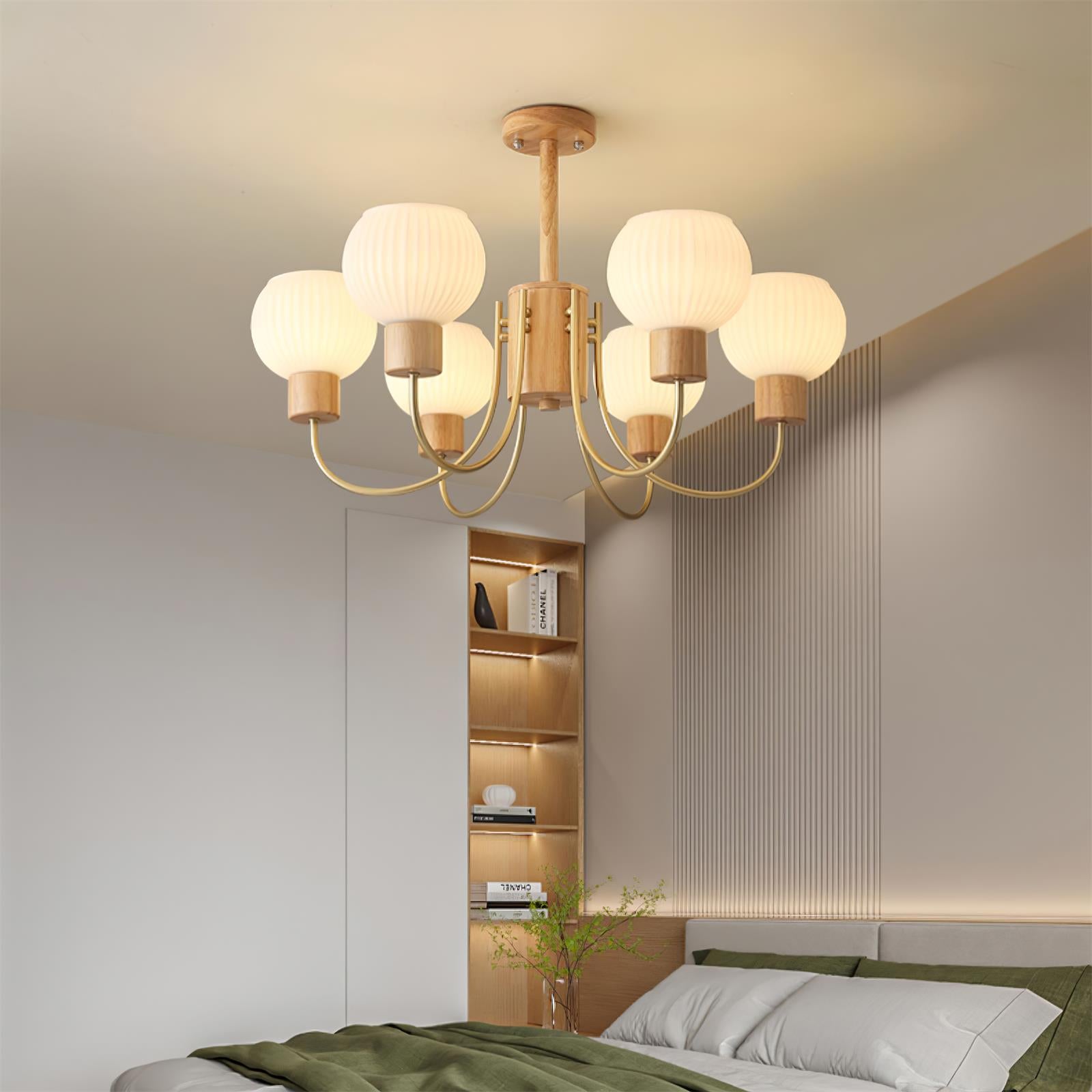 Tämä puinen kattokruunu, jossa on sirot lampunvarret, tyylikäs tyyli ja viimeistely, muuttaa tilasi kauniiksi tyyliksi ja on upea taideteos. Se on täydellinen kodin sisustusnäkymä mistä tahansa näkökulmasta. Tässä puisessa kattokruunussa on 6 hehkulamppua ja se täyttää valaistustarpeesi. Täydellinen teksturoidun puun ja lasin yhdistelmä takaa tämän kattokruunun pitkän käyttöiän.
