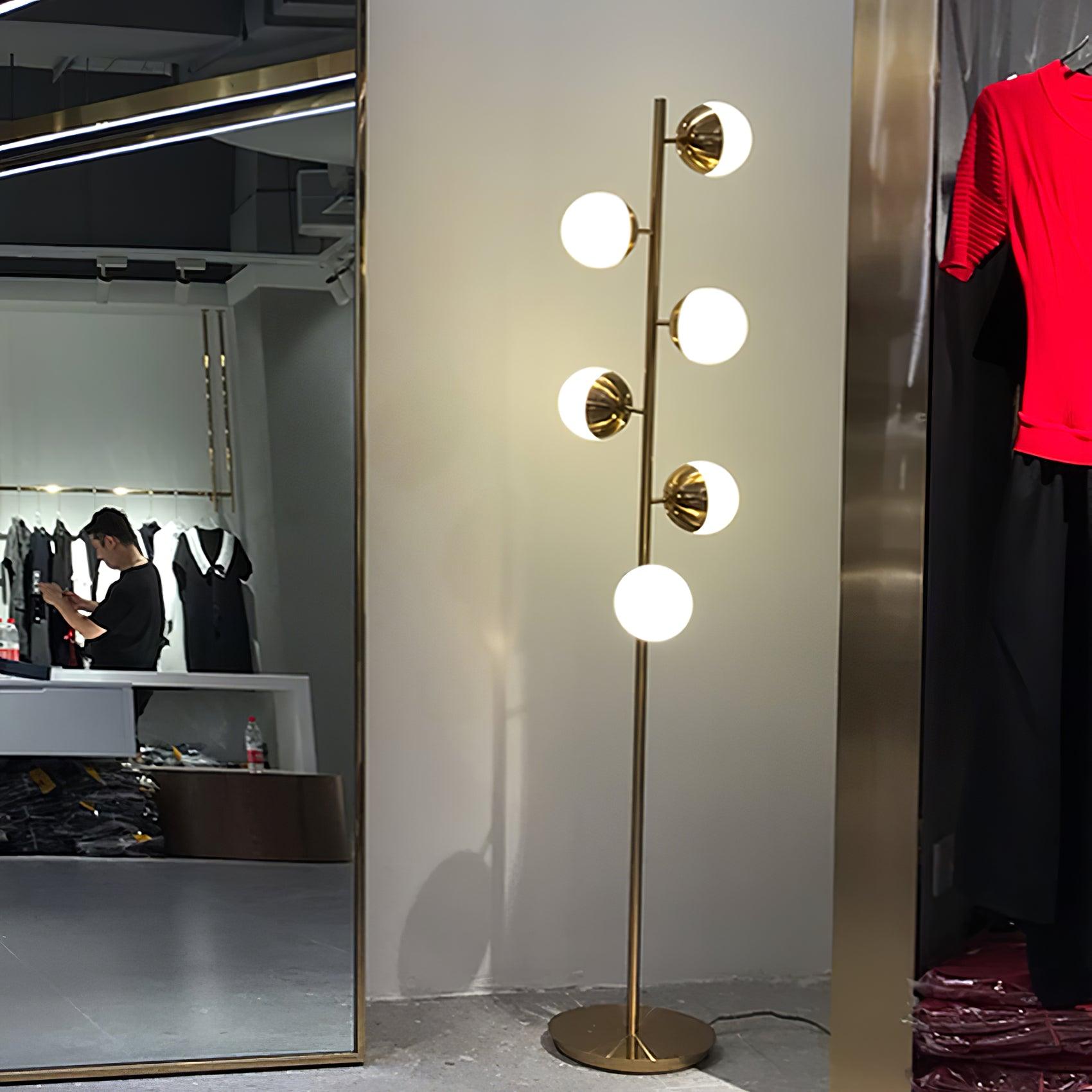 Doppler-LED-puuvalaisin on saanut inspiraationsa vuosisadan puolivälistä. useita valkoisia lasipallon sävyjä on hajallaan kultaa pitkin. Neliömäinen kullanvärinen pyöreä pohja toimii koristeena sekä painavana painona, jotta tämä lamppu pysyy tukevana ja turvallisena.