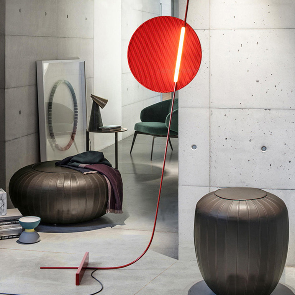 - Lampunvarjostimen pyöreä varjostin ja satunnaiset linjat muodostavat tämän lattiavalaisimen, joka voidaan nähdä nousevana kuuna tai taivaalle lentävänä ilmapallona.