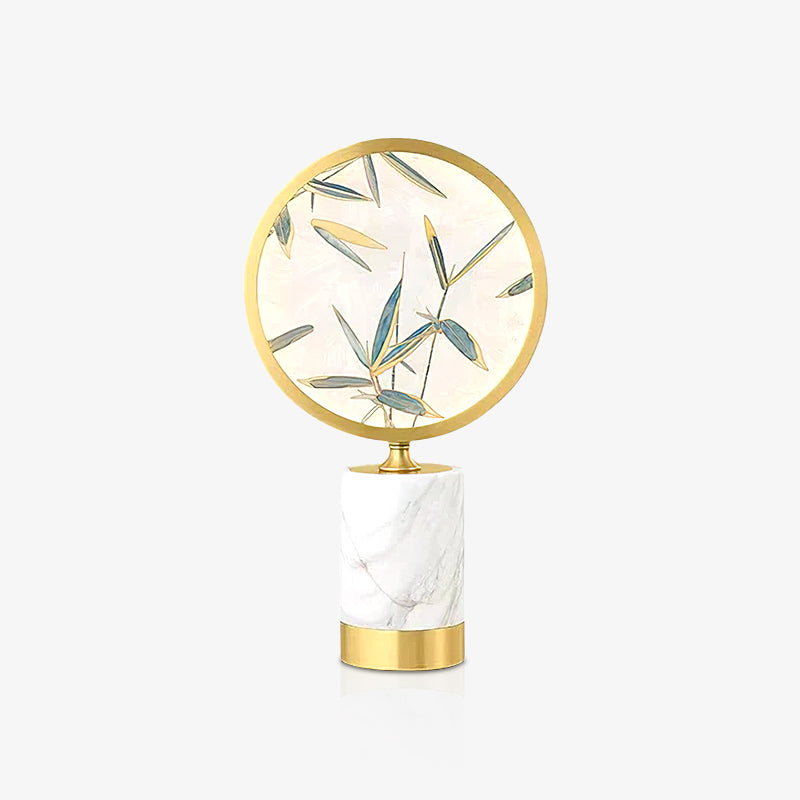 Mid-Century Modern Hollywood Regency -tyylinen marmorinen pöytävalaisin, jossa käsinmaalattu bambulehti tai kasvitieteellinen kuvio kirkkaassa lampunvarjostimessa.