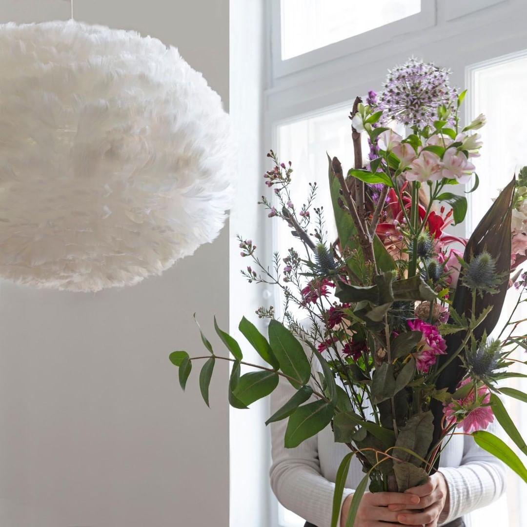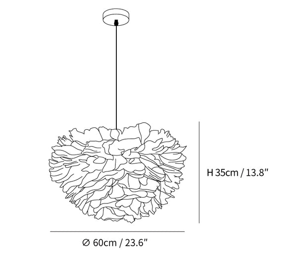 Tuhannet hanhenhöyhenet ympäröivät Eos White Pendantin kirkasta ydintä. Malli on osoitus inhimillisistä käytännöistä ja kestävästä tuotannosta. Höyhenet hankitaan vastuullisesti, desinfioidaan ja käytetään uudelleen telineeseen, minkä jälkeen ne kiinnitetään sisäpuolelta paperirakenteeseen. Eos on palonkestävä ja helppo huoltaa; voit puhdistaa ja elvyttää höyhenet hiustenkuivaajalla.
