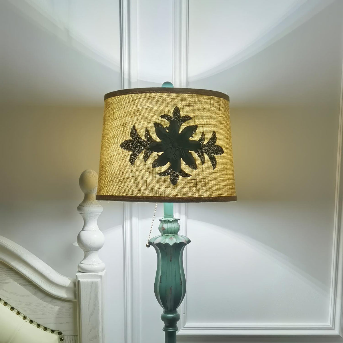 - Lattiavalaisimen runko on harmaanvihreä, vihreä iästä lähtien. Varjostin on puuvilla- ja pellavakuvioitu ruskea, toisin kuin useimmat valkoiset sävyt, tämä on väriltään vintage ja viehättävä.