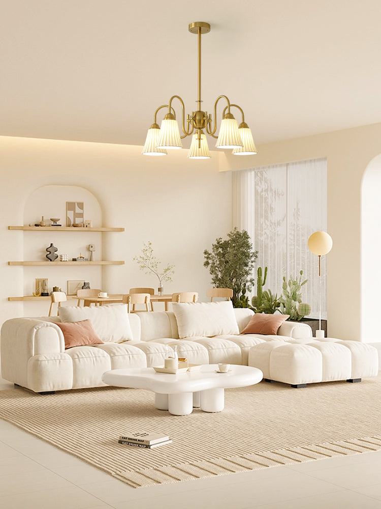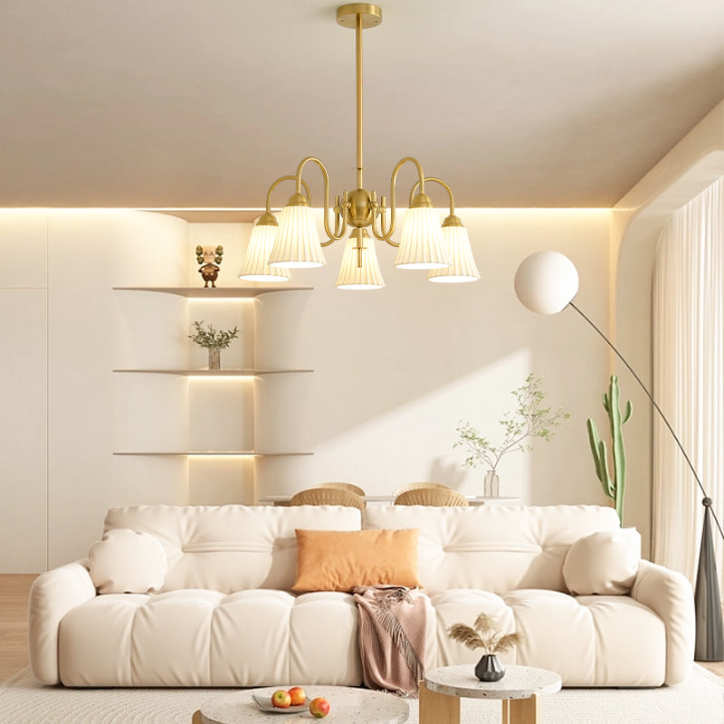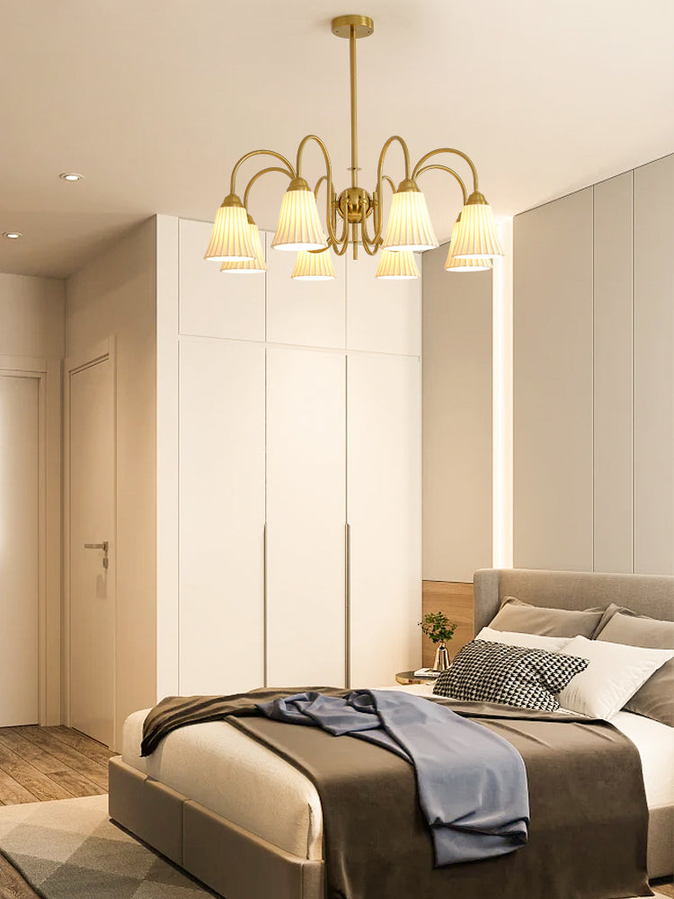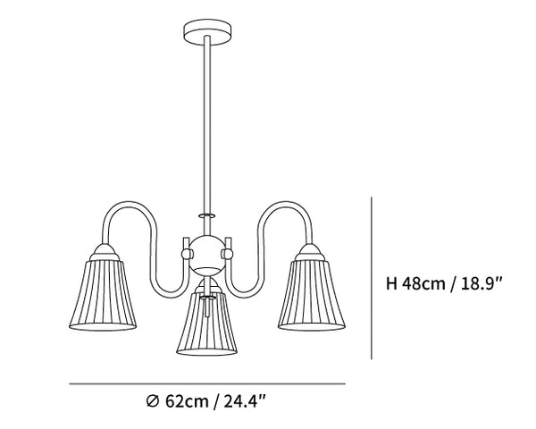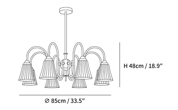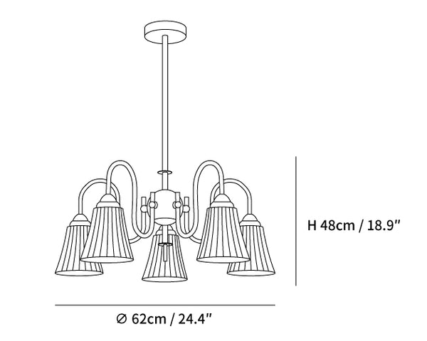 Monimutkaisesti laskostetut varjostimet kohtaavat yksinkertaisen kehyksen Esther Chandelierissa. Valkoinen keraaminen pehmeää valaistusta tilaan, tasapainoisessa kokoonpanossa. Suoraviivainen raudasta valmistettu rakenne tuo kauniin modernin elementin perinteiseen valaisimeen.