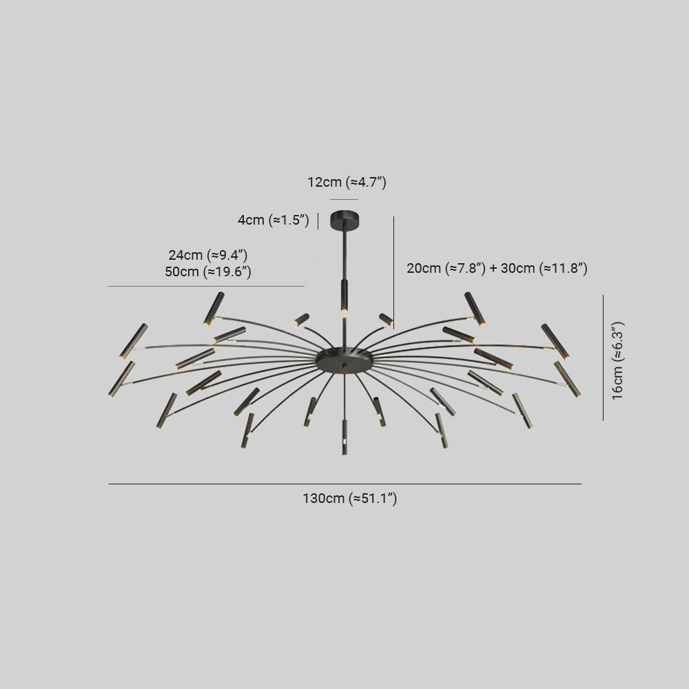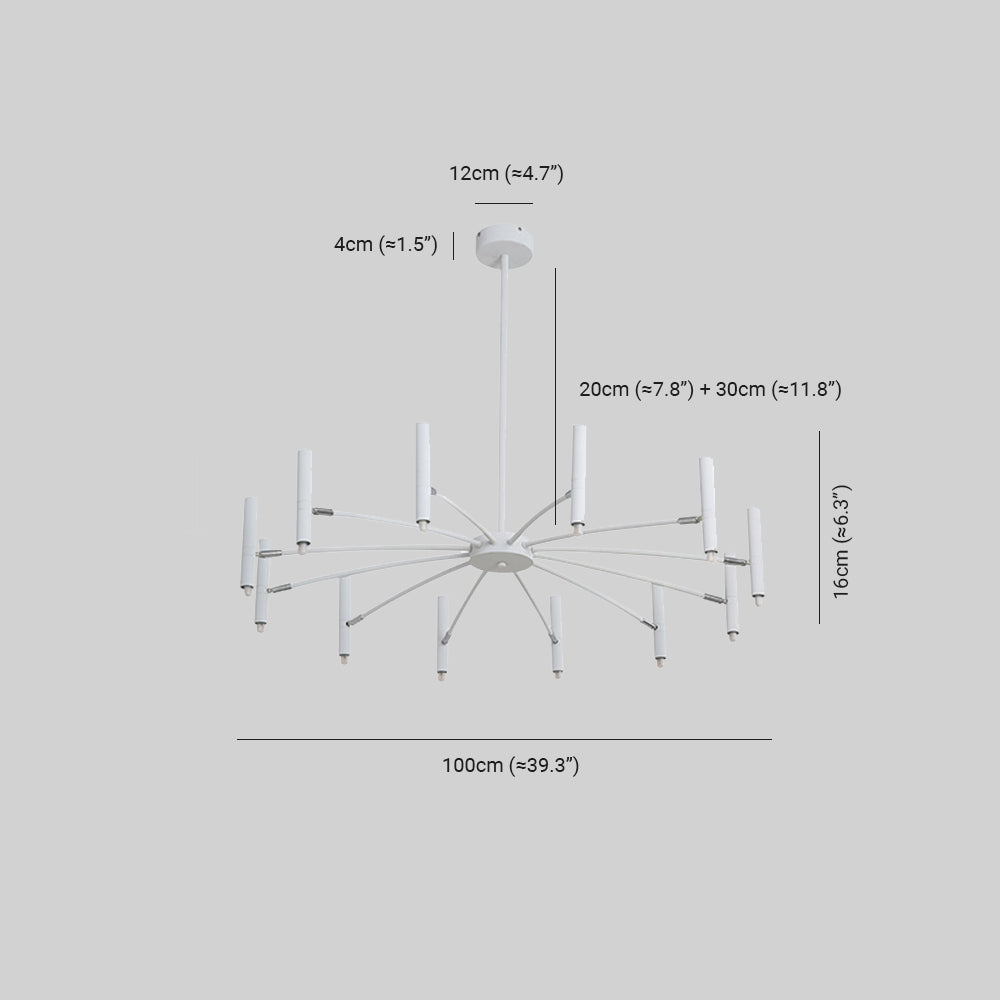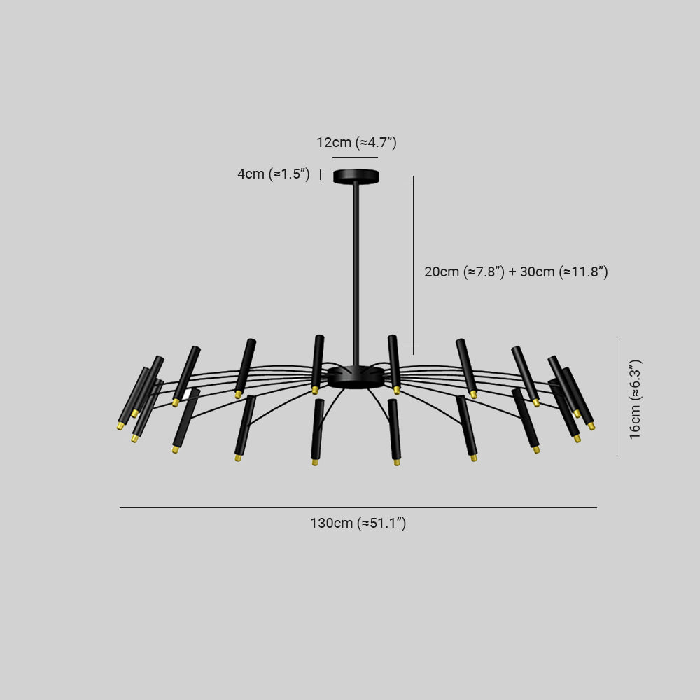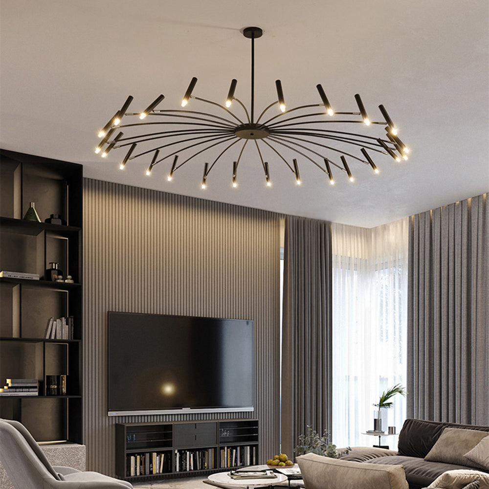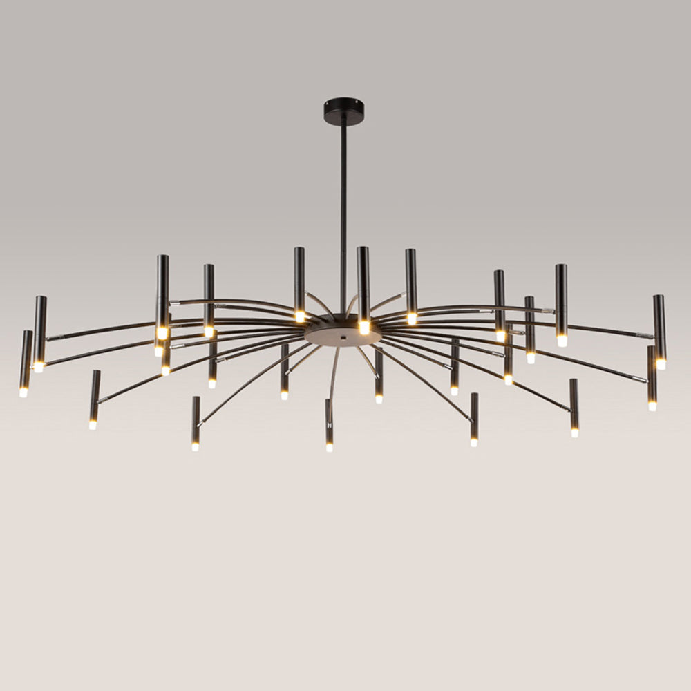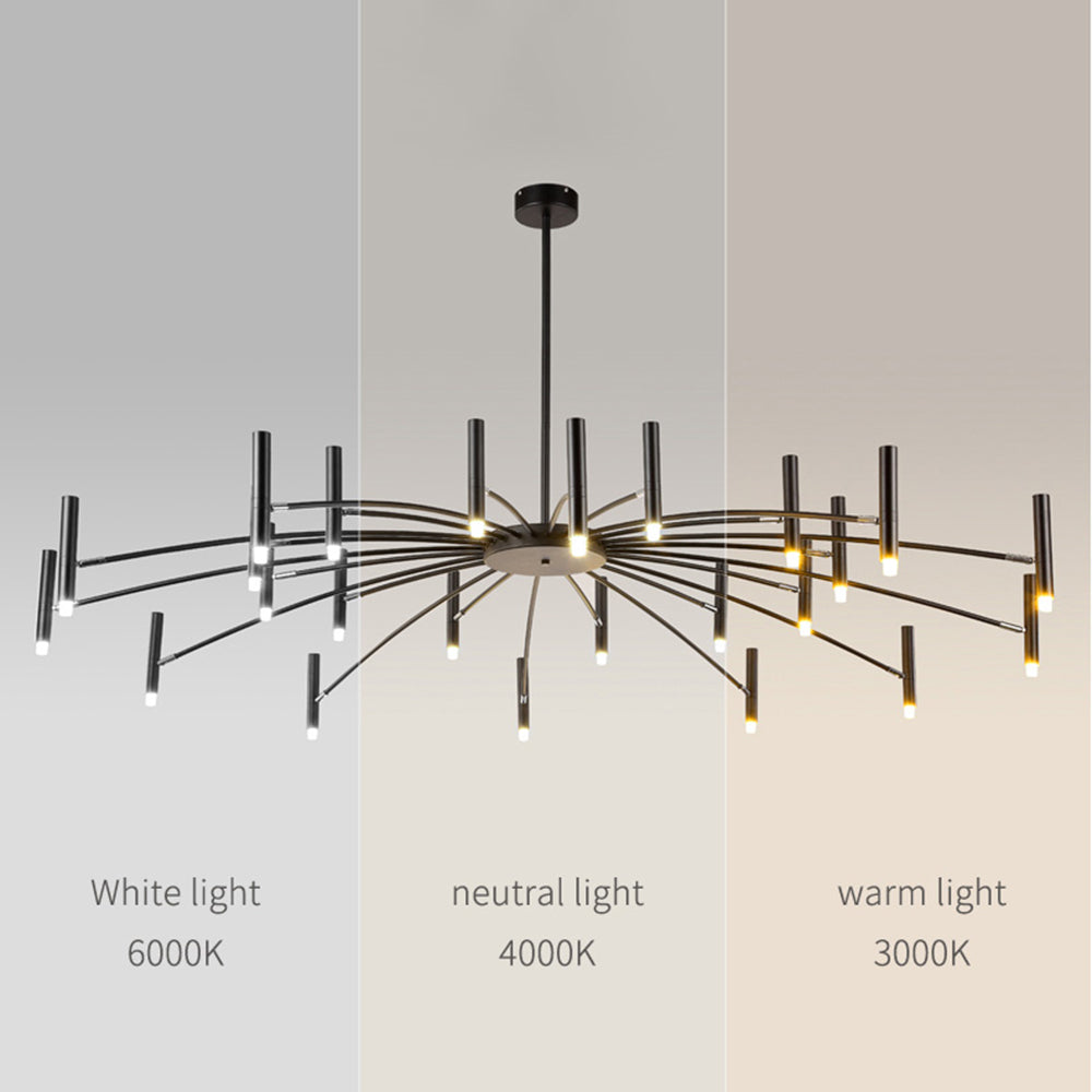 - Mustavalkoisessa kattokruunussa on useita haaroja, joista jokaisessa on kohdevalo, suurien tilojen valaistukseen.