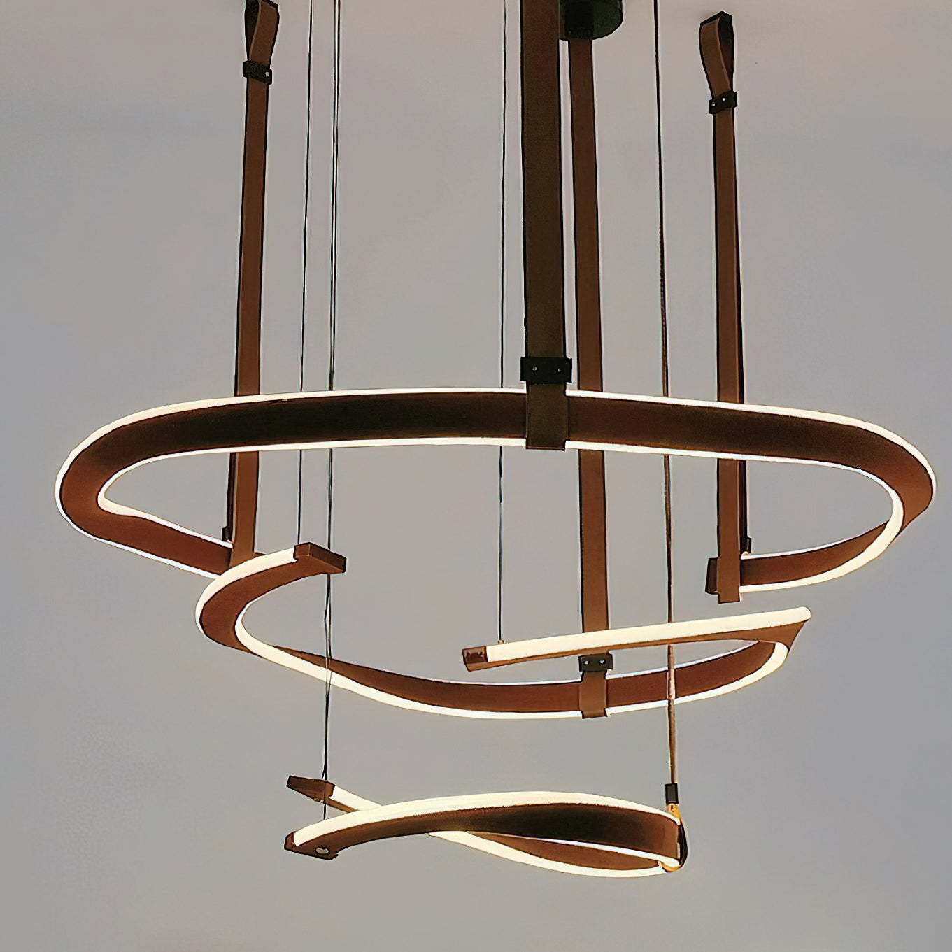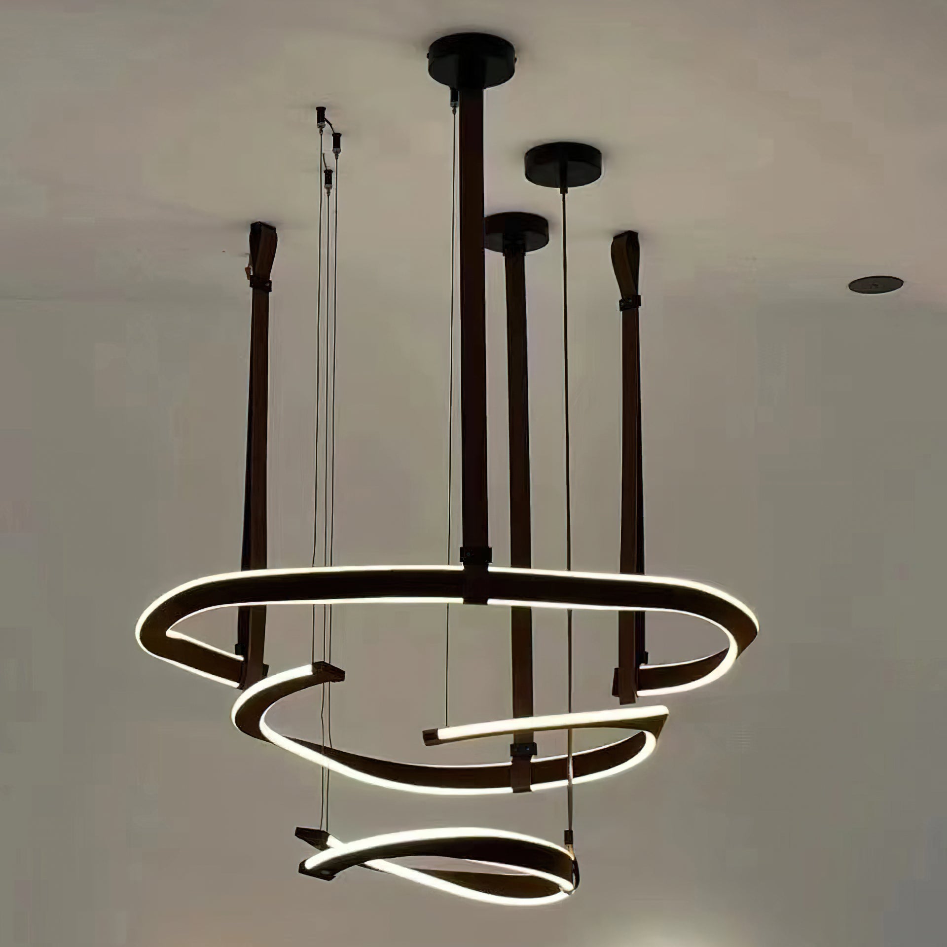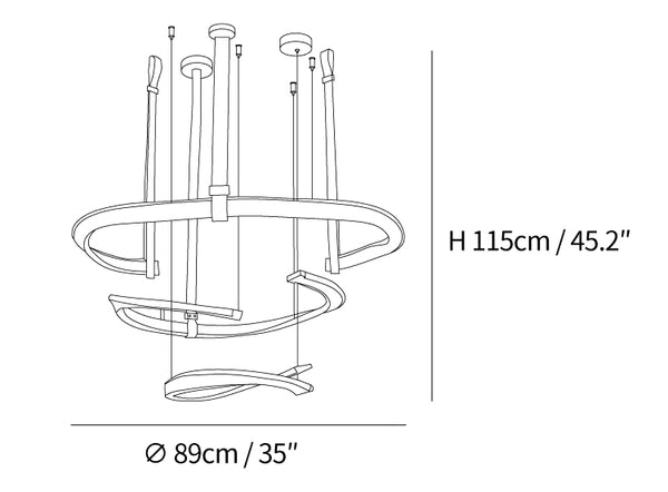 Upo tilasi moderniin eleganssiin Finopi-kattokruunulla. Tämä lineaarinen riippuva veistos on valmistettu sarjasta kierrettyjä renkaita, joita tuetaan ohuilla langoilla, mikä luo silmiinpistävän abstraktin kuvion. Jokaisella renkaalla on omat ainutlaatuiset puutteensa, joita valaisevat integroidut LEDit hienostuneen kosketuksen takaamiseksi. Tyylikkäillä viimeistelyllään ja geometrisilla siluetteillaan tämä moderni kappale sopii mihin tahansa sisustukseen.
