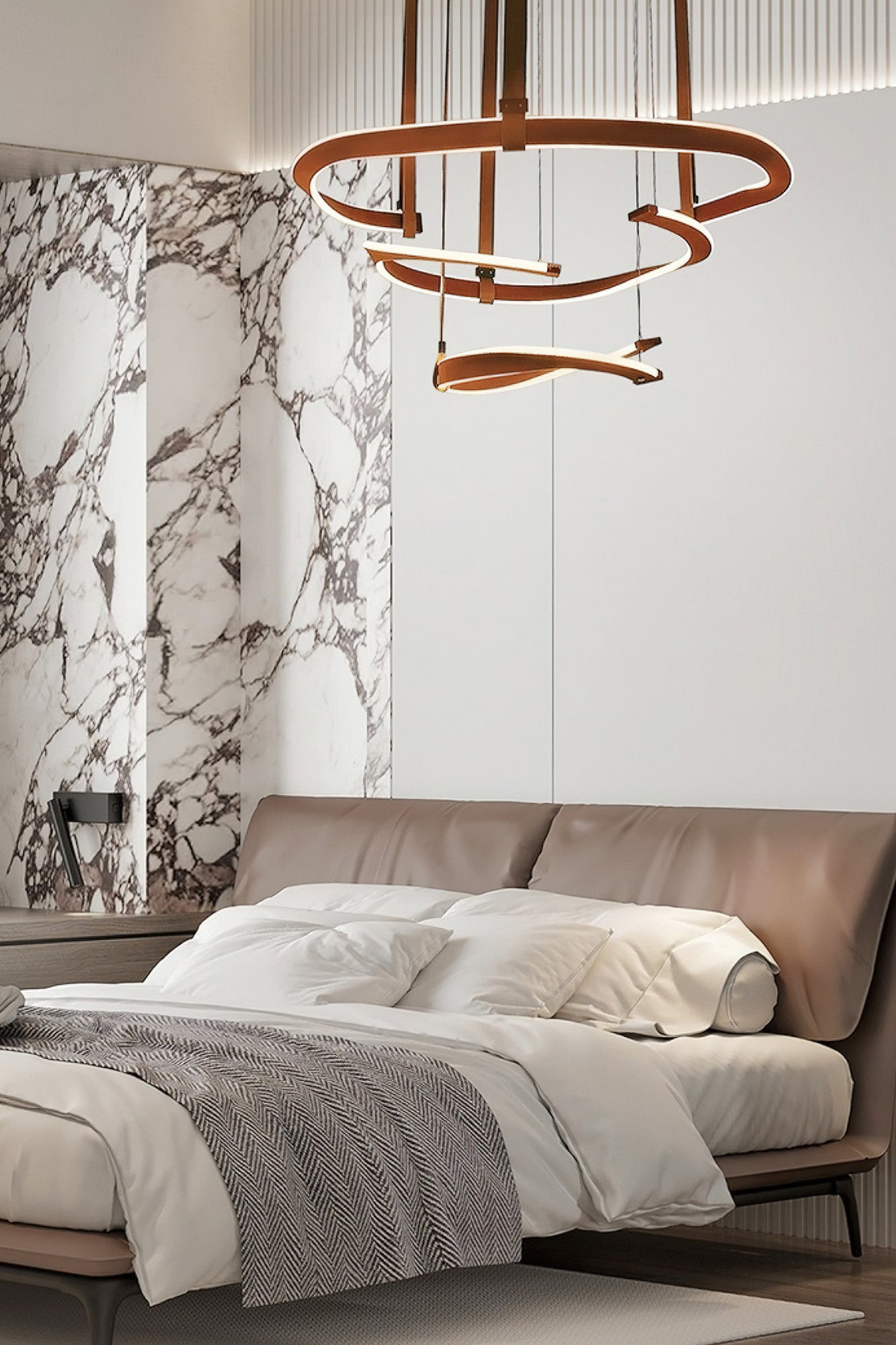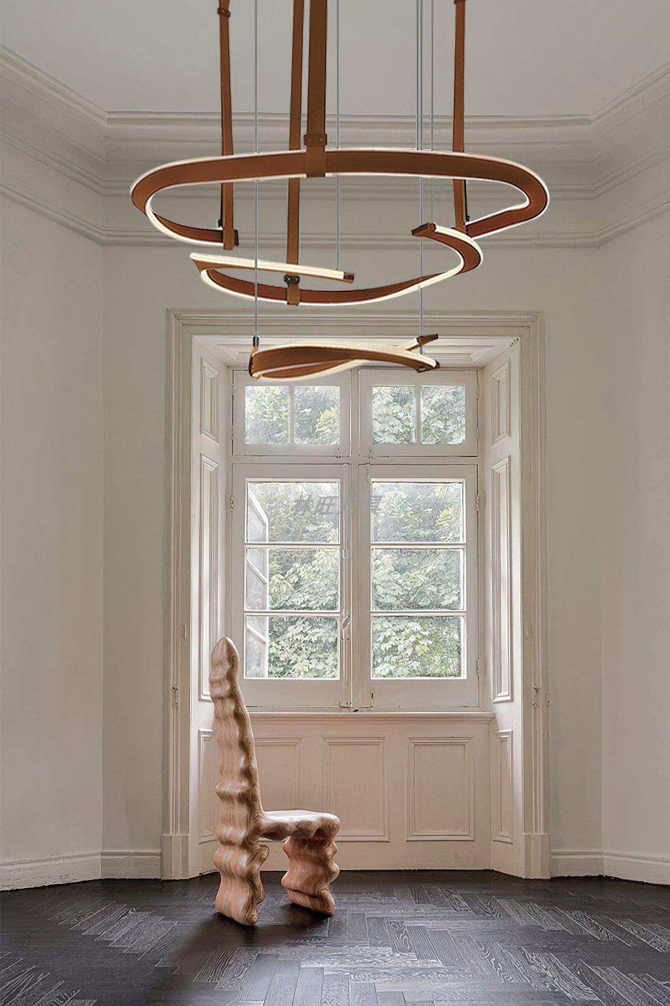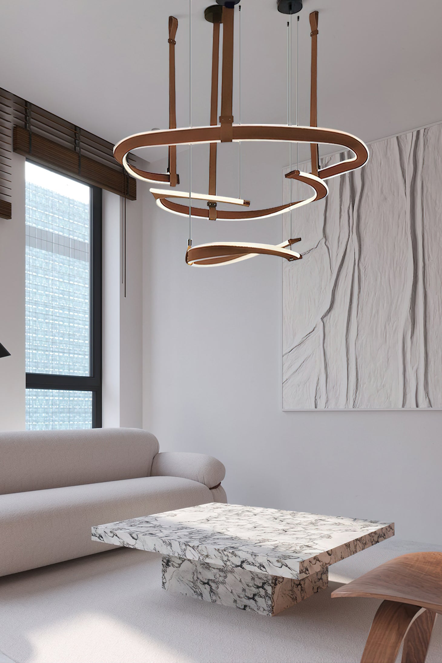 Upo tilasi moderniin eleganssiin Finopi-kattokruunulla. Tämä lineaarinen riippuva veistos on valmistettu sarjasta kierrettyjä renkaita, joita tuetaan ohuilla langoilla, mikä luo silmiinpistävän abstraktin kuvion. Jokaisella renkaalla on omat ainutlaatuiset puutteensa, joita valaisevat integroidut LEDit hienostuneen kosketuksen takaamiseksi. Tyylikkäillä viimeistelyllään ja geometrisilla siluetteillaan tämä moderni kappale sopii mihin tahansa sisustukseen.