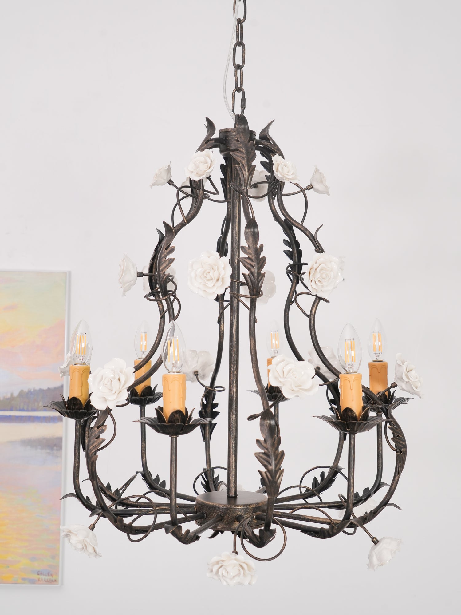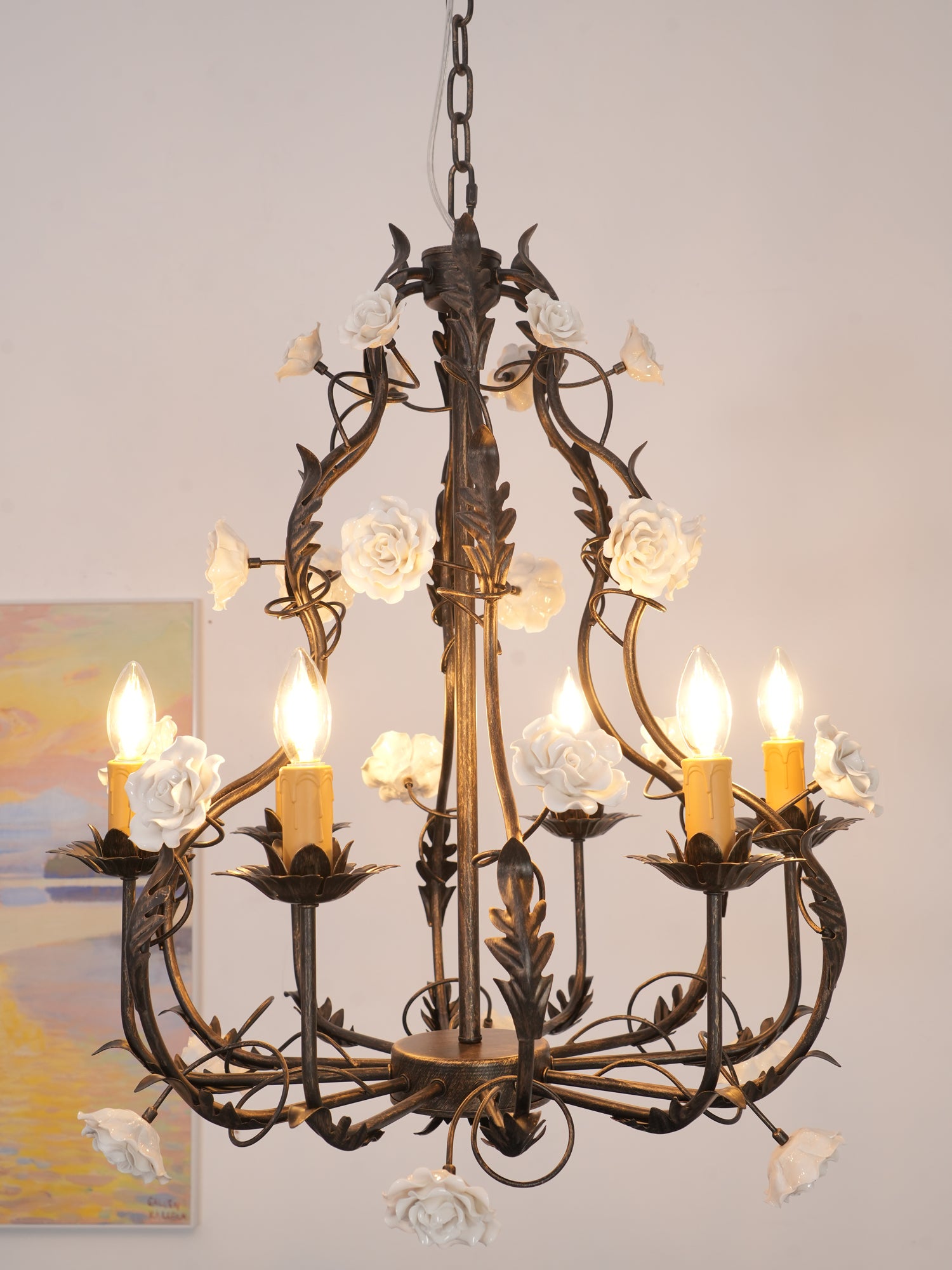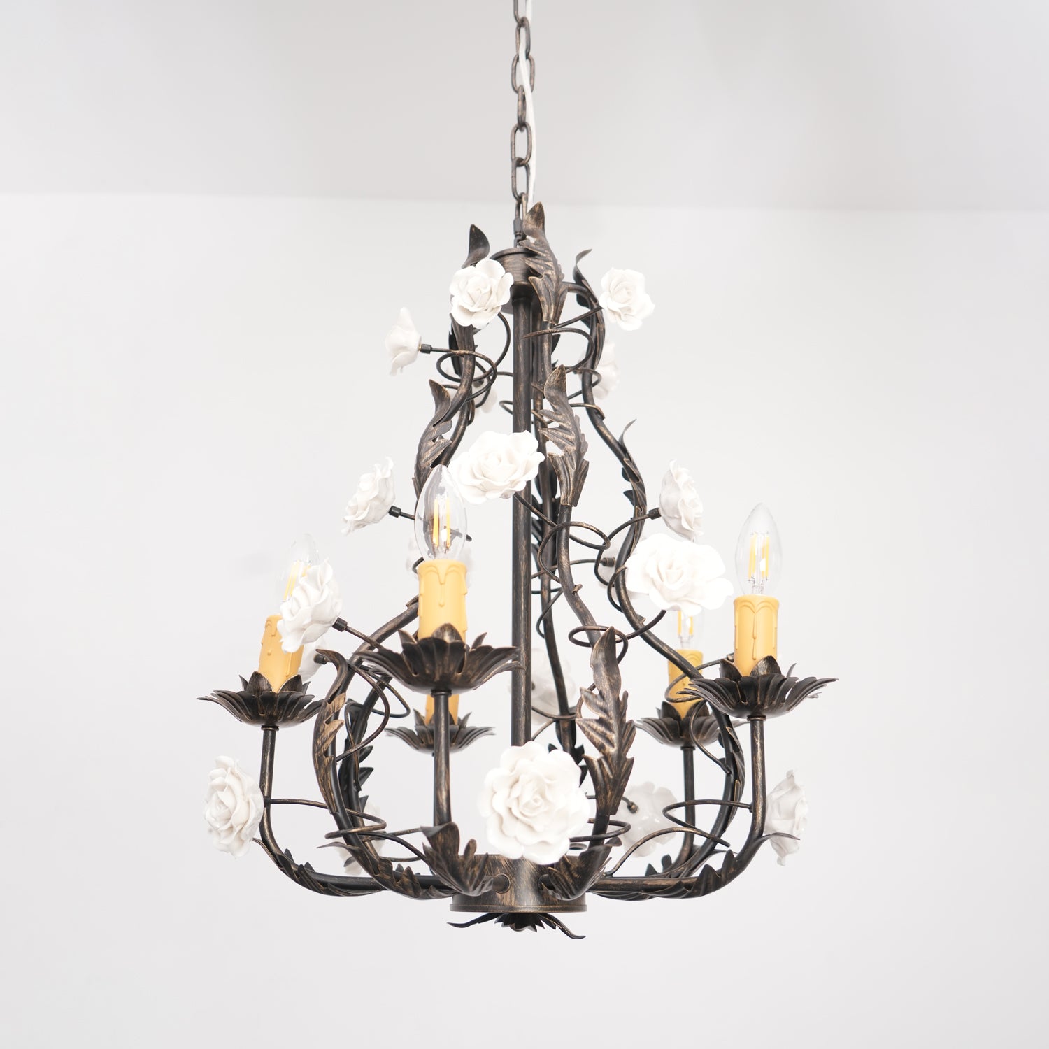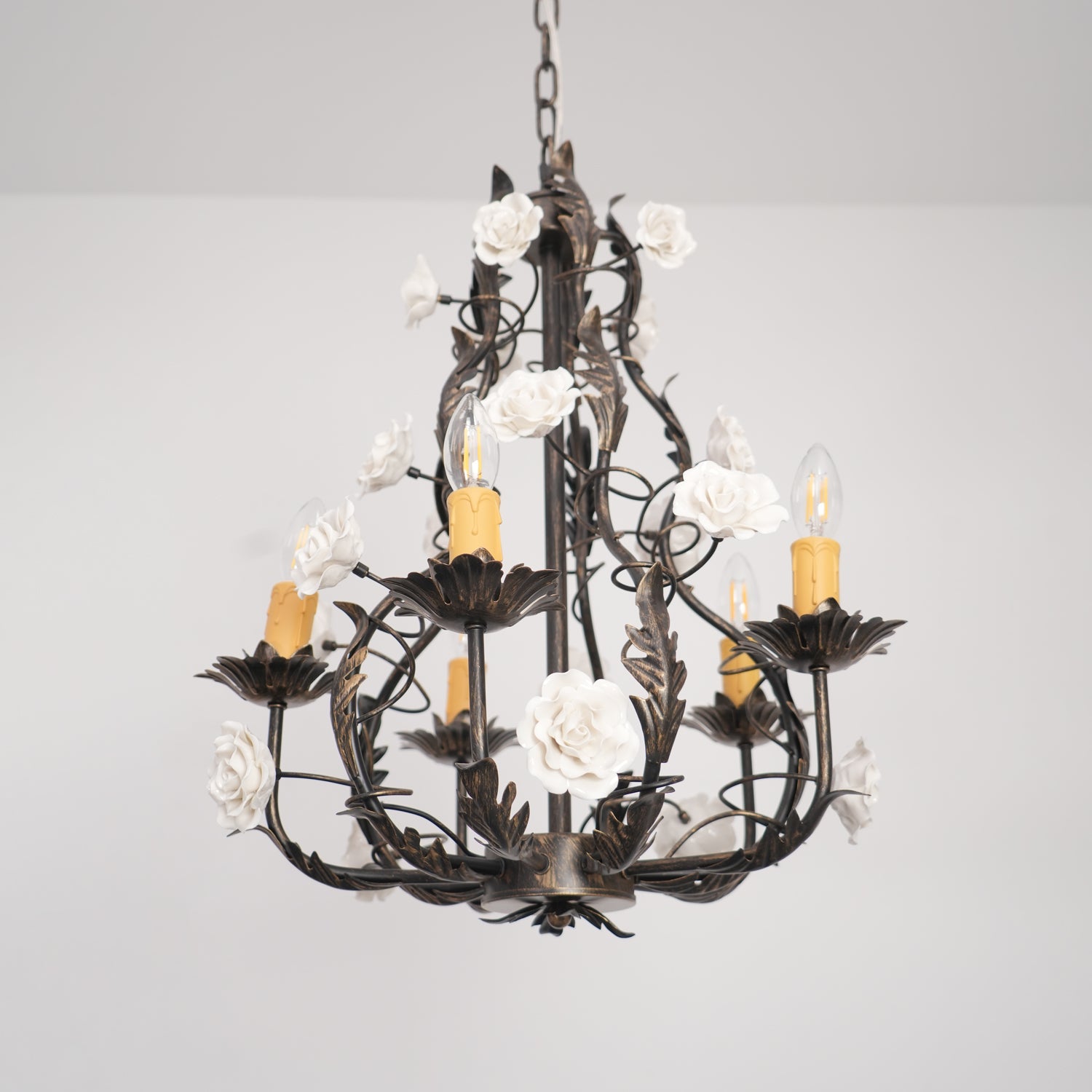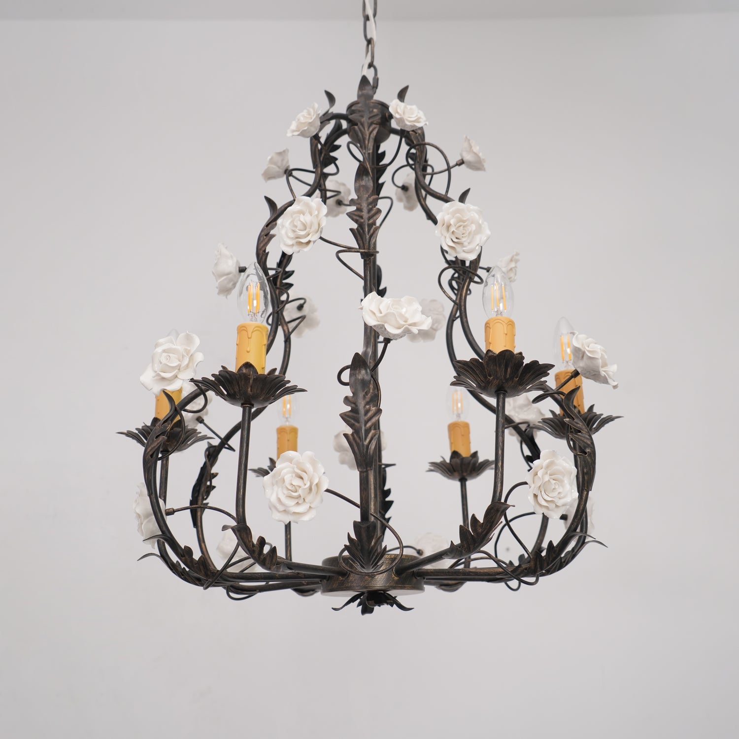 Tumma metallirakenne muodostaa tyylikkään pohjan kattokruunulle, ja viiniköynnökset ja lehdet kierrevät kauniisti tukemassa keraamisia ruusuja täydessä kukassa. Jokainen ruusu on veistetty ja maalattu käsin, mikä korostaa jokaisen kappaleen yksilöllistä kauneutta ja ainutlaatuista luonnetta. Hehkulamppujen pehmeä hehku, joka muistuttaa kynttilänvaloa, täydentää keramiikan kermanvalkoista sävyä luoden lämpimän, kutsuvan valon, joka korostaa kukkakuvion monimutkaisia yksityiskohtia.