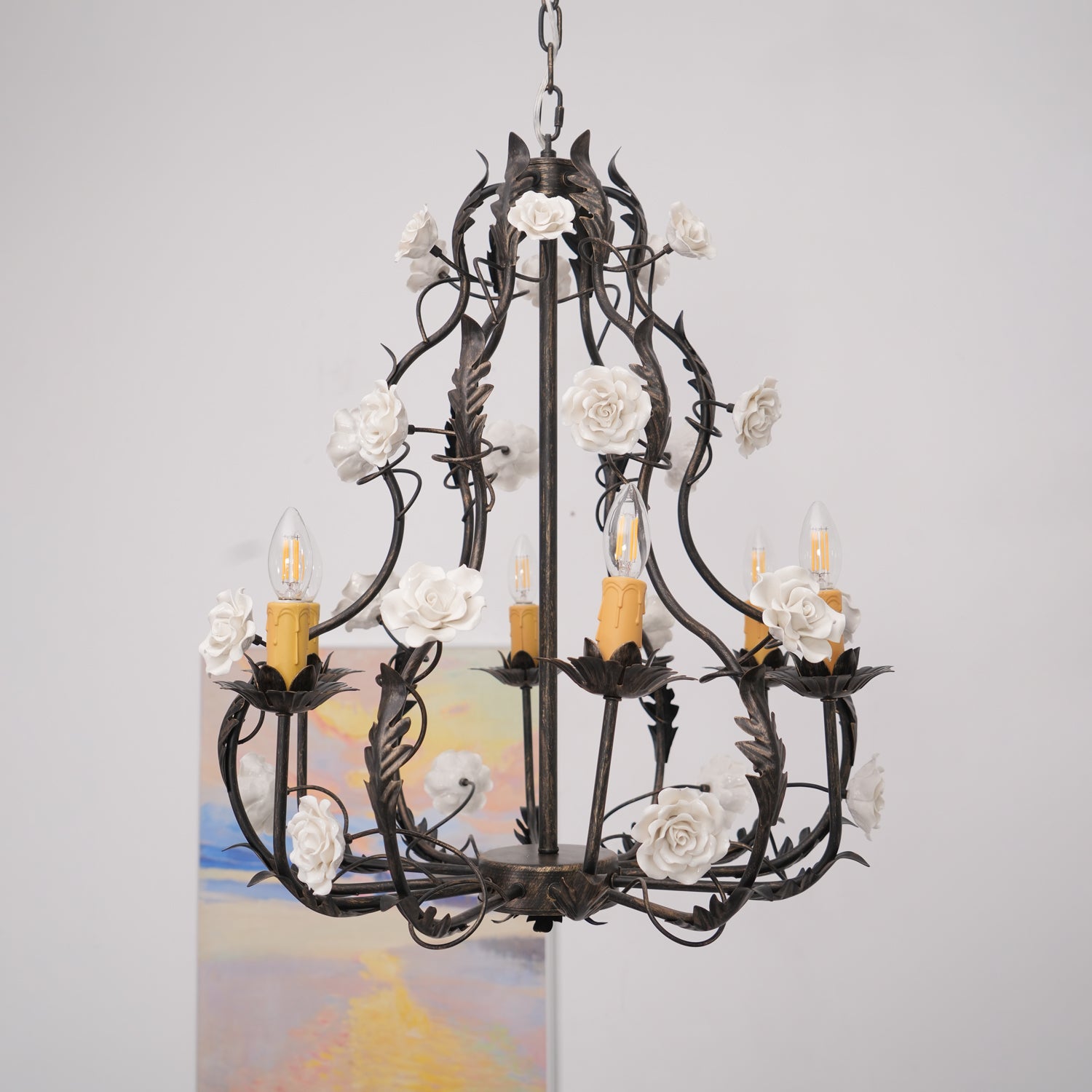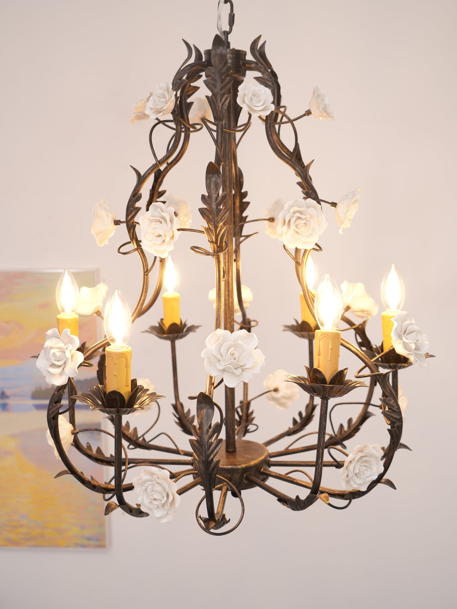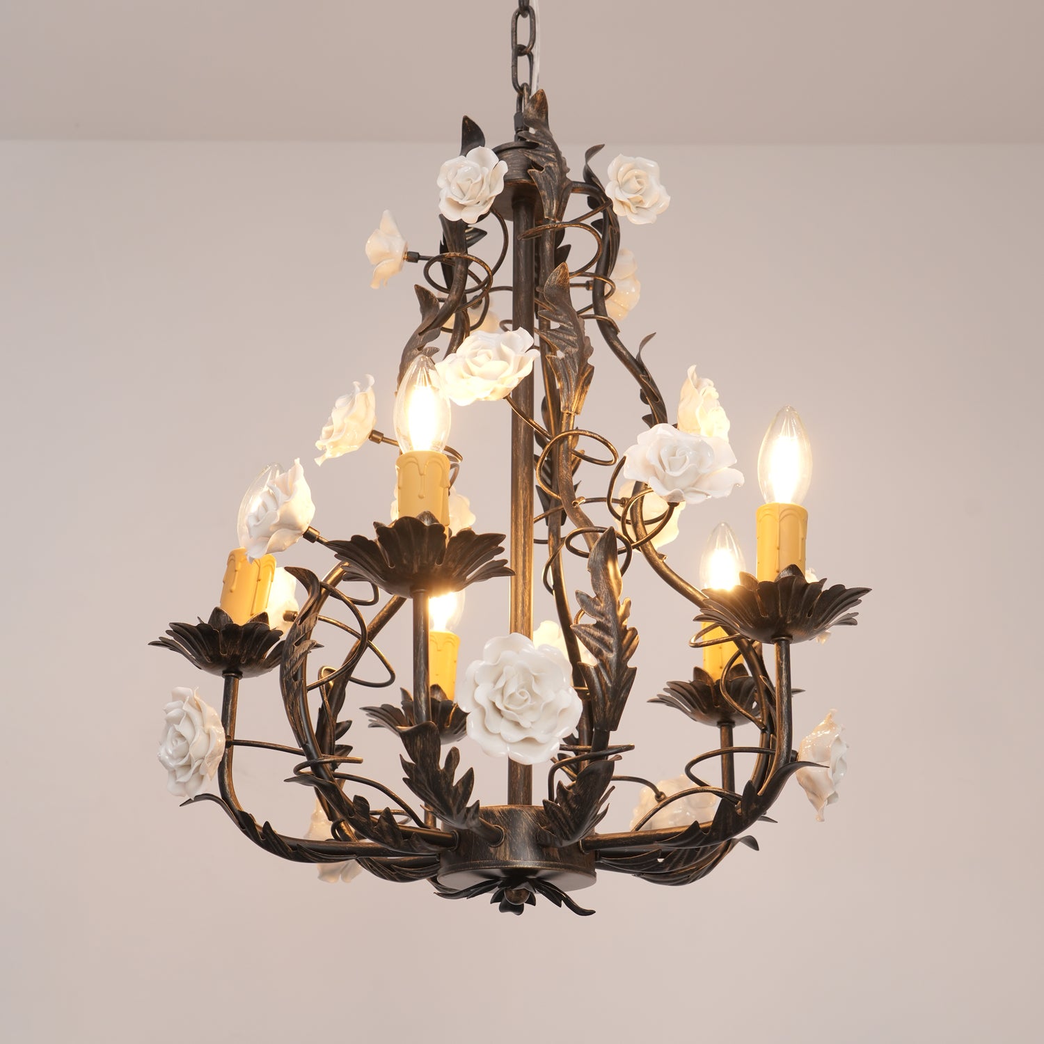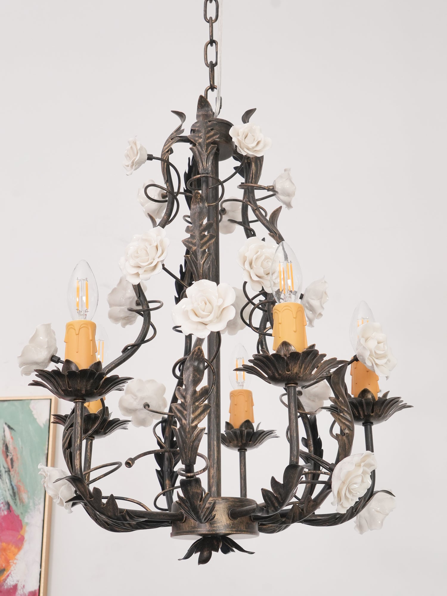 Tumma metallirakenne muodostaa tyylikkään pohjan kattokruunulle, ja viiniköynnökset ja lehdet kierrevät kauniisti tukemassa keraamisia ruusuja täydessä kukassa. Jokainen ruusu on veistetty ja maalattu käsin, mikä korostaa jokaisen kappaleen yksilöllistä kauneutta ja ainutlaatuista luonnetta. Hehkulamppujen pehmeä hehku, joka muistuttaa kynttilänvaloa, täydentää keramiikan kermanvalkoista sävyä luoden lämpimän, kutsuvan valon, joka korostaa kukkakuvion monimutkaisia yksityiskohtia.