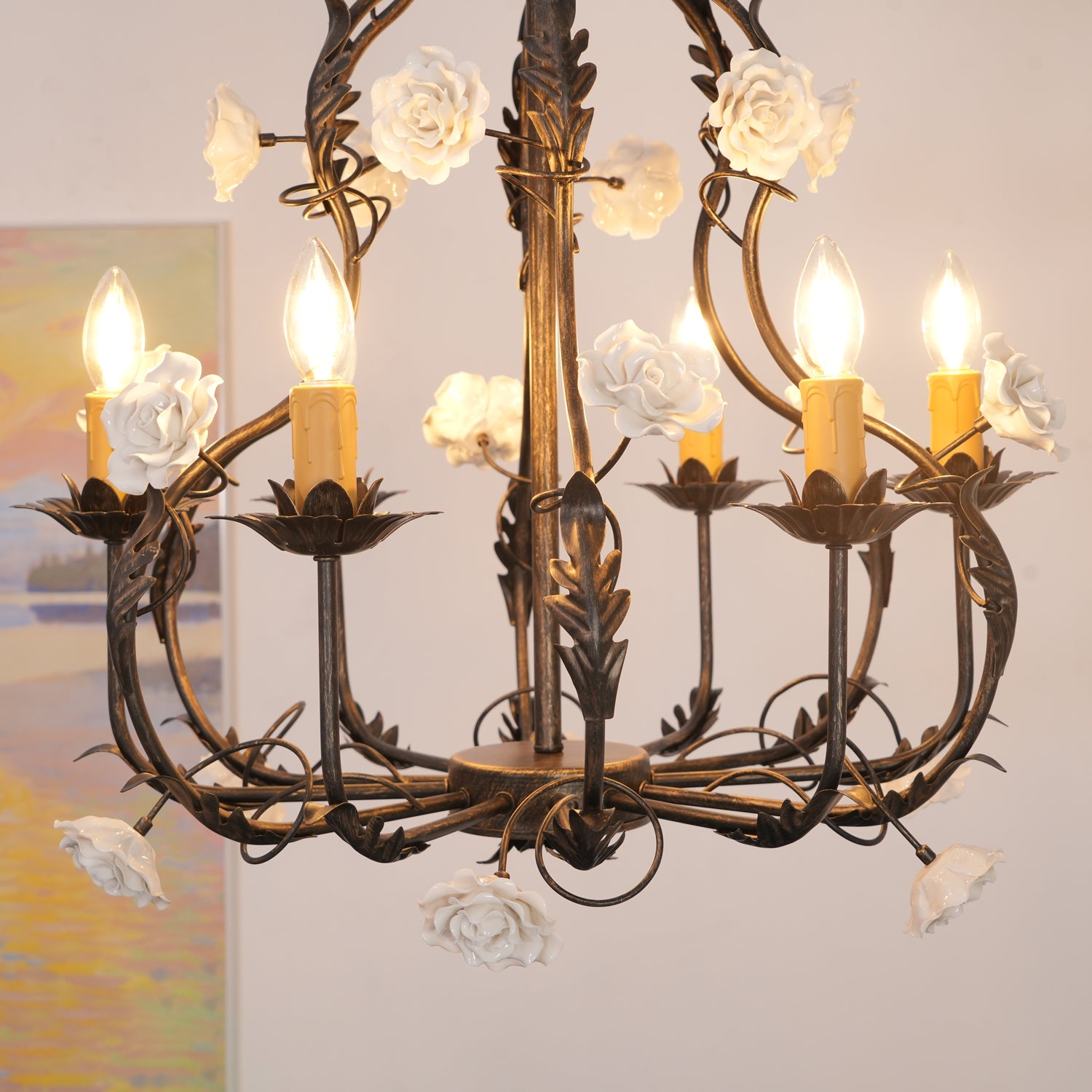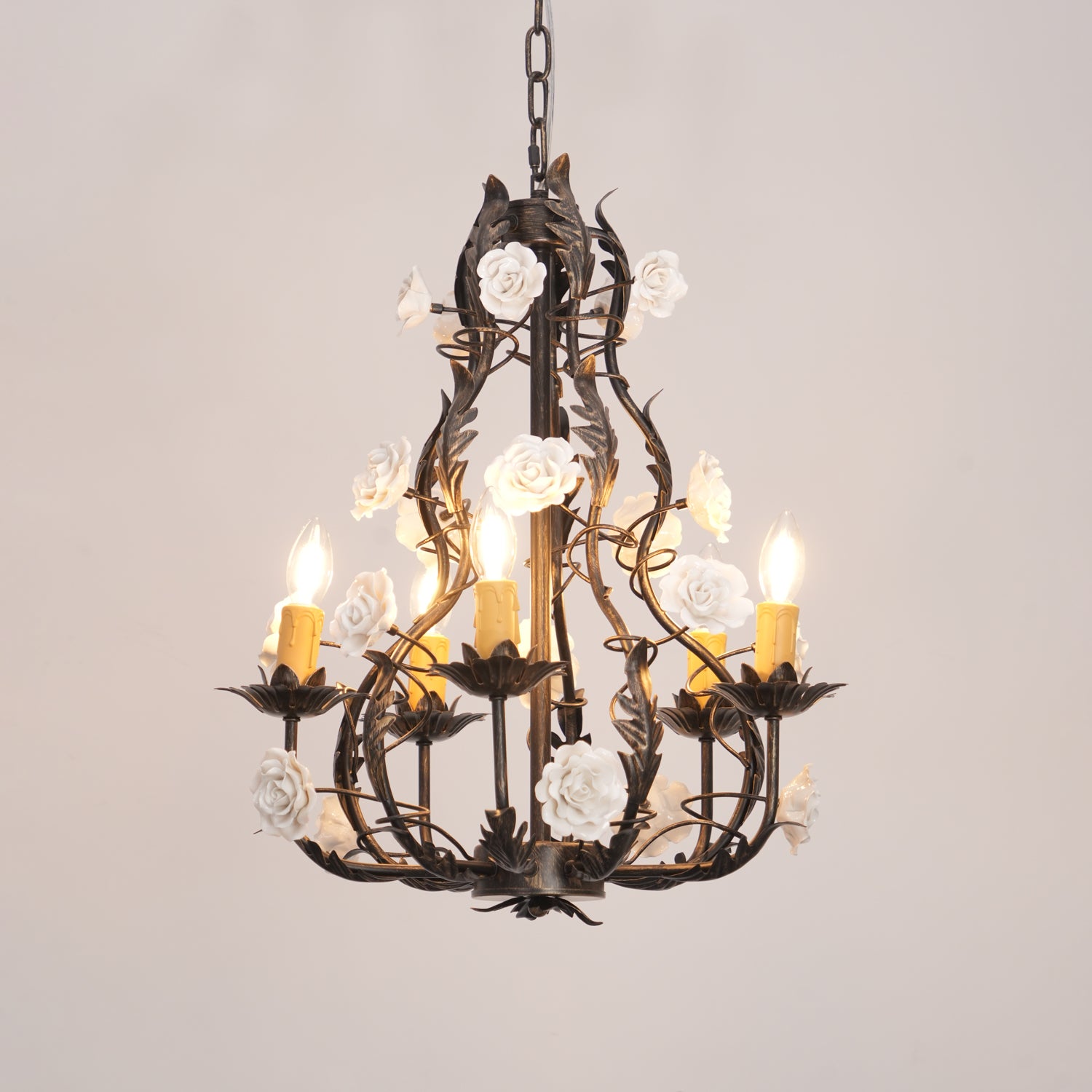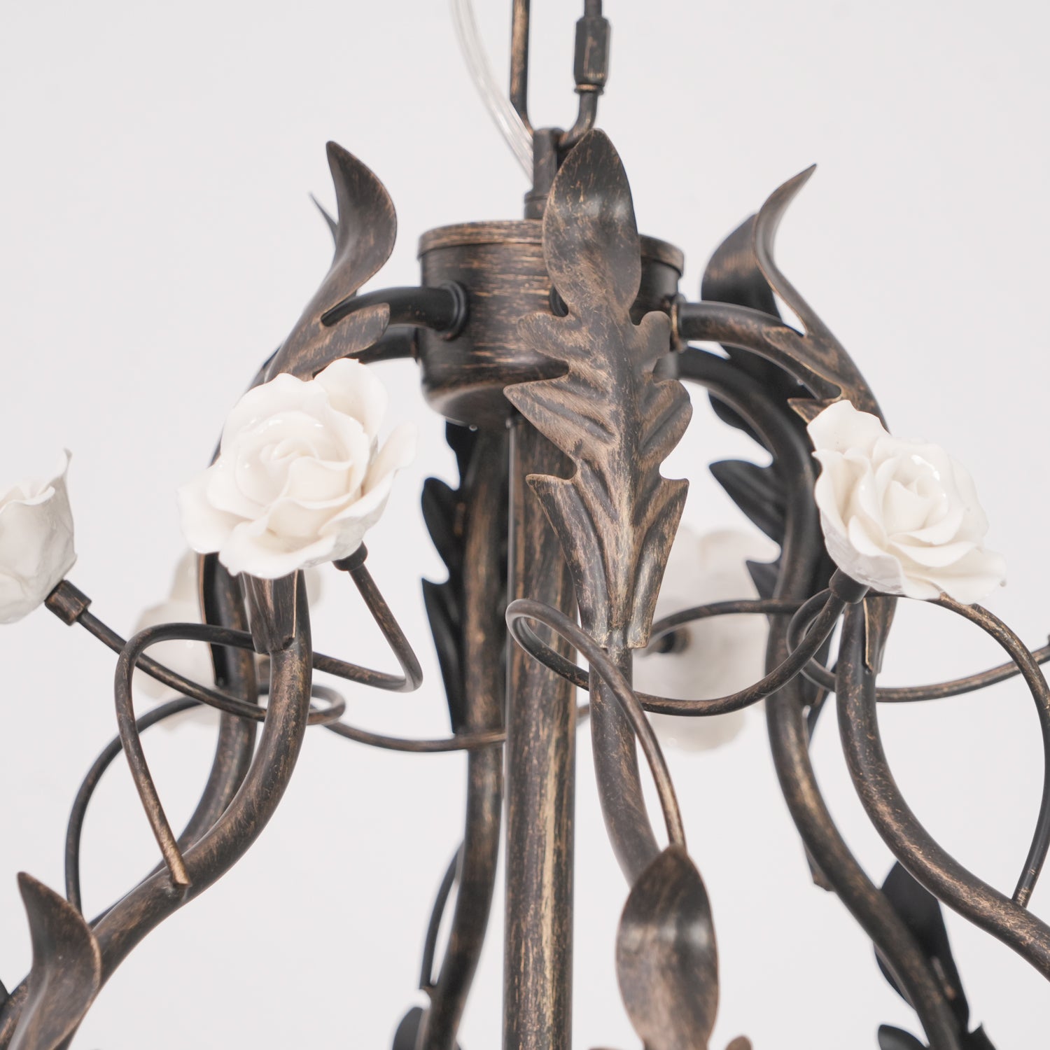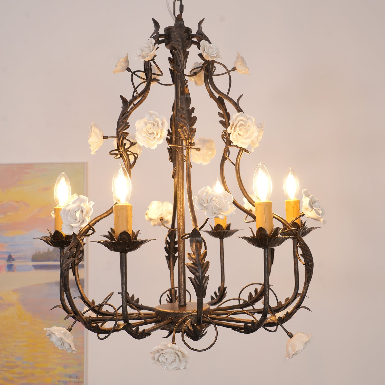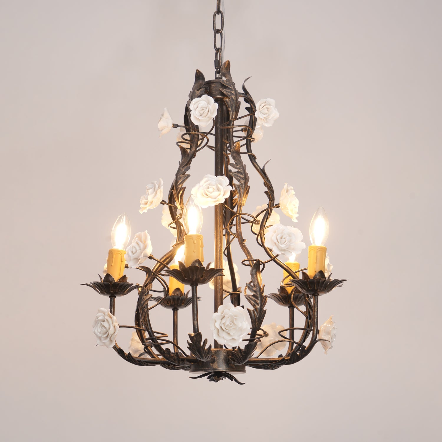 Tumma metallirakenne muodostaa tyylikkään pohjan kattokruunulle, ja viiniköynnökset ja lehdet kierrevät kauniisti tukemassa keraamisia ruusuja täydessä kukassa. Jokainen ruusu on veistetty ja maalattu käsin, mikä korostaa jokaisen kappaleen yksilöllistä kauneutta ja ainutlaatuista luonnetta. Hehkulamppujen pehmeä hehku, joka muistuttaa kynttilänvaloa, täydentää keramiikan kermanvalkoista sävyä luoden lämpimän, kutsuvan valon, joka korostaa kukkakuvion monimutkaisia yksityiskohtia.