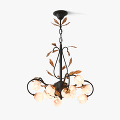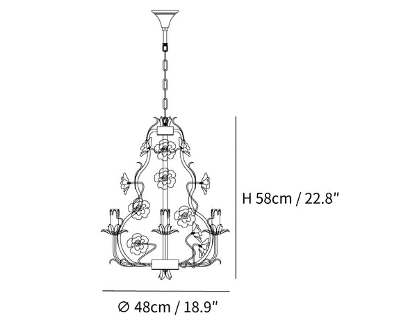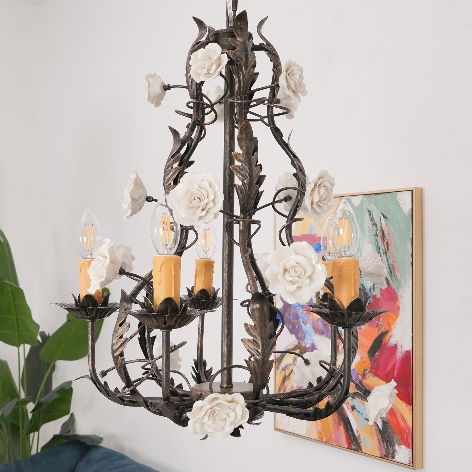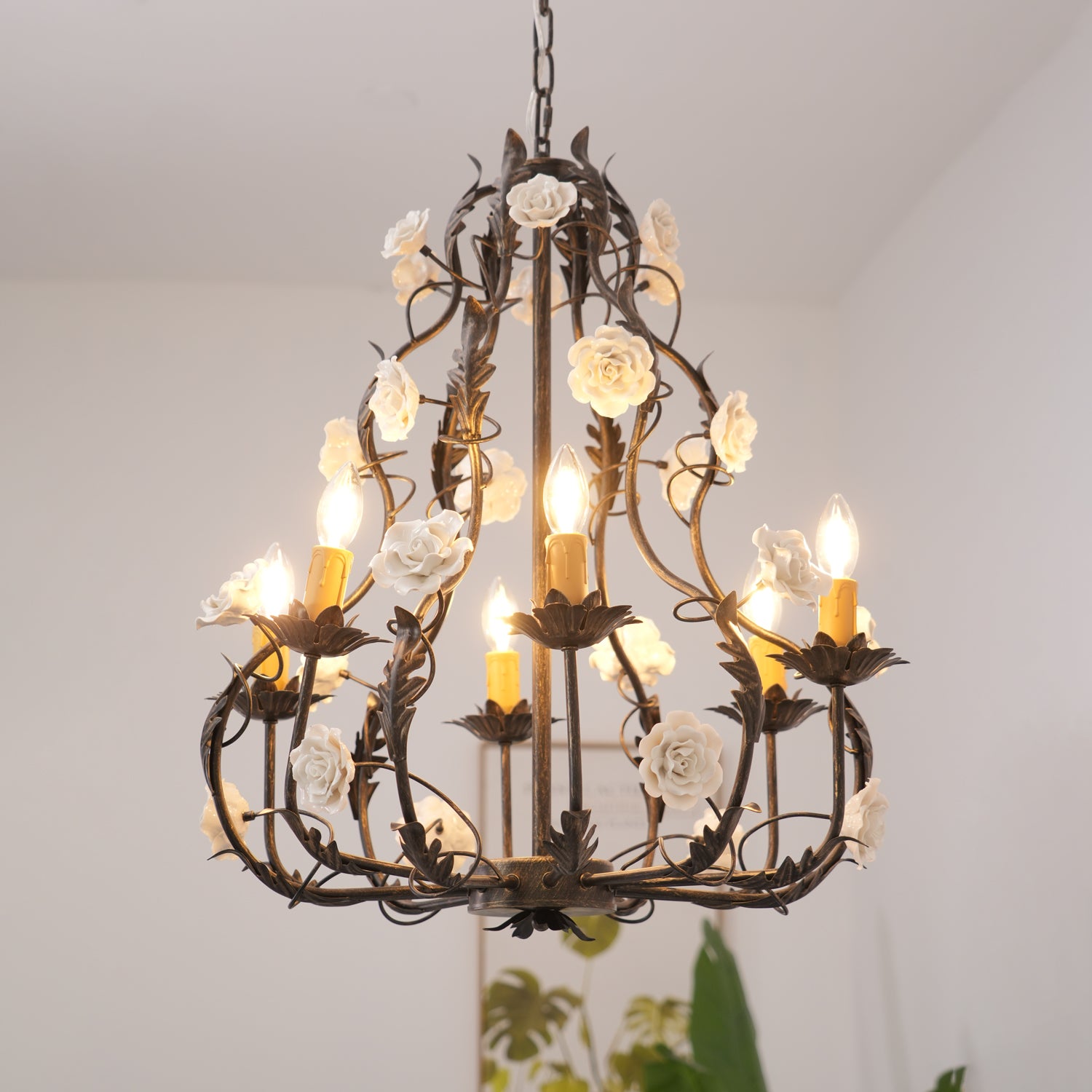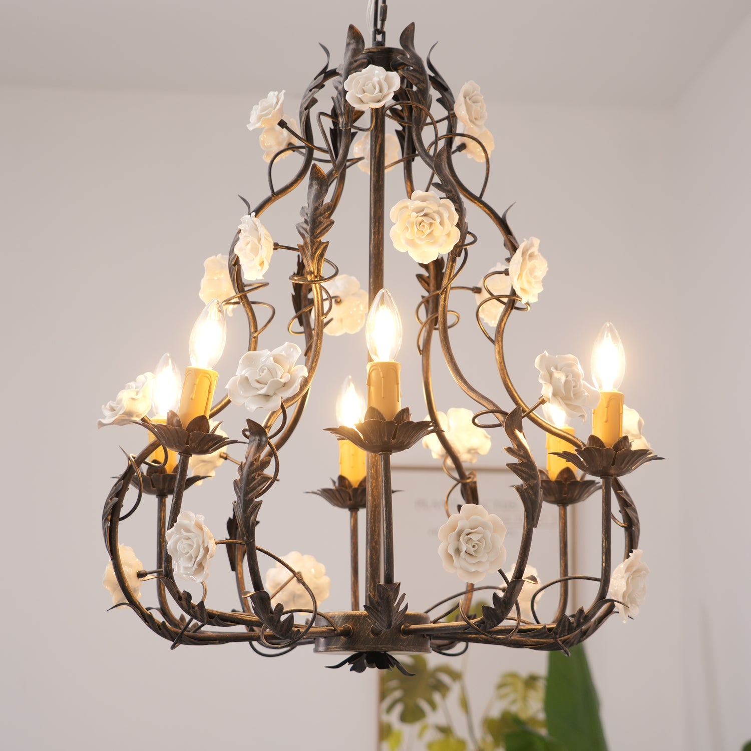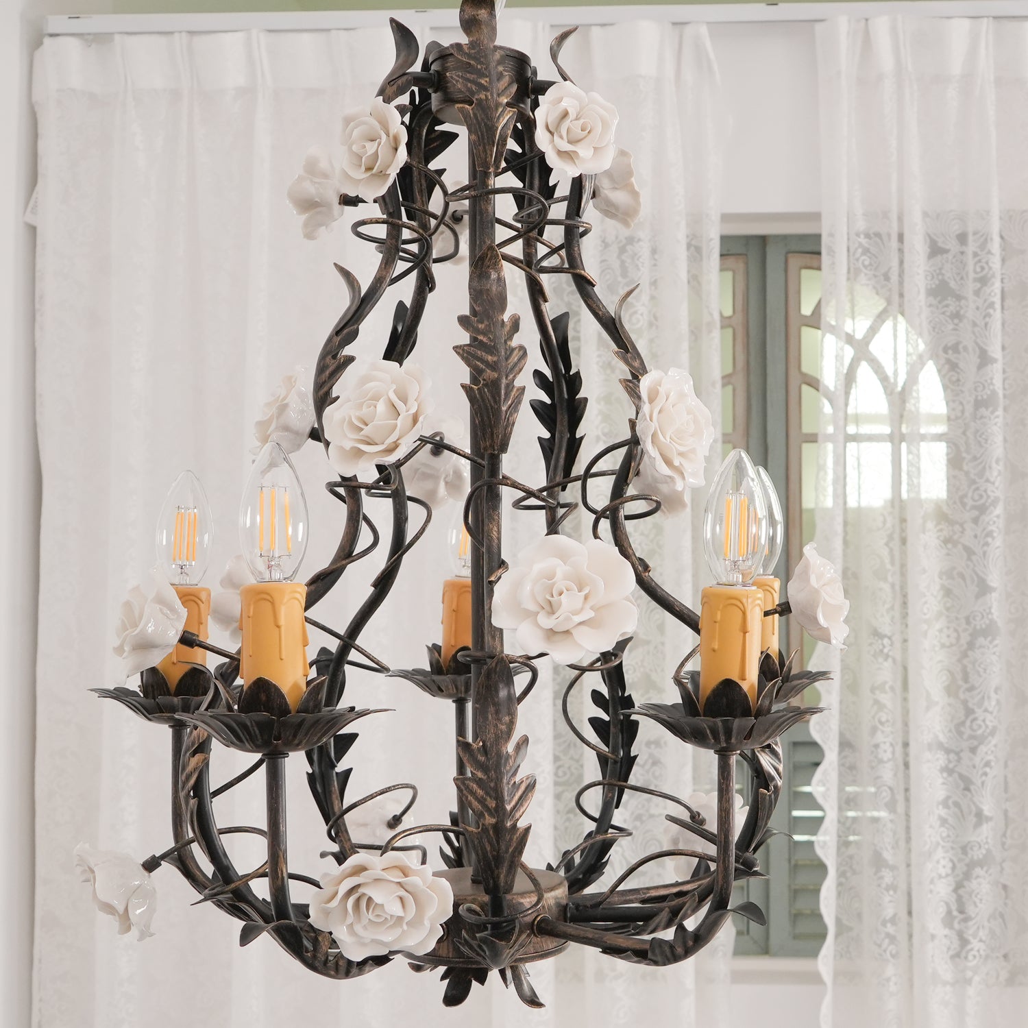 Tumma metallirakenne muodostaa tyylikkään pohjan kattokruunulle, ja viiniköynnökset ja lehdet kierrevät kauniisti tukemassa keraamisia ruusuja täydessä kukassa. Jokainen ruusu on veistetty ja maalattu käsin, mikä korostaa jokaisen kappaleen yksilöllistä kauneutta ja ainutlaatuista luonnetta. Hehkulamppujen pehmeä hehku, joka muistuttaa kynttilänvaloa, täydentää keramiikan kermanvalkoista sävyä luoden lämpimän, kutsuvan valon, joka korostaa kukkakuvion monimutkaisia yksityiskohtia.
