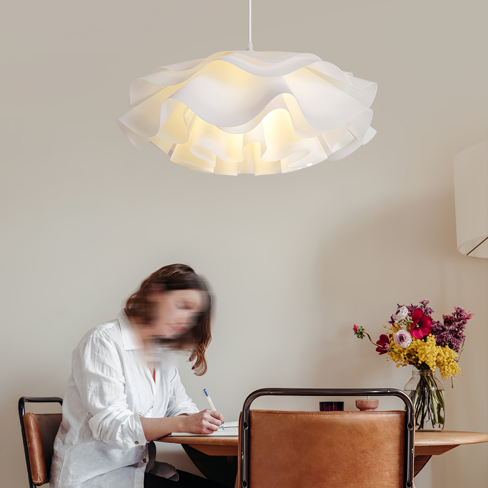 Tämä kukkamuotoinen valkoinen riippuvalaisin valaisee minkä tahansa huoneen ainutlaatuisella muotoilullaan ja akryylivarjostimellaan, mikä tarjoaa kirkkaan ja mukavan valaistuksen. Tässä valkoisen akryylikukkamuodossa valmistettu riippuvalaisin on myös silmiinpistävää estetiikkaa. Ainutlaatuisen suunnittelunsa ansiosta kukkamuotoinen valkoinen riippuvalaisin tarjoaa sinulle ainutlaatuisen visuaalisen kokemuksen.