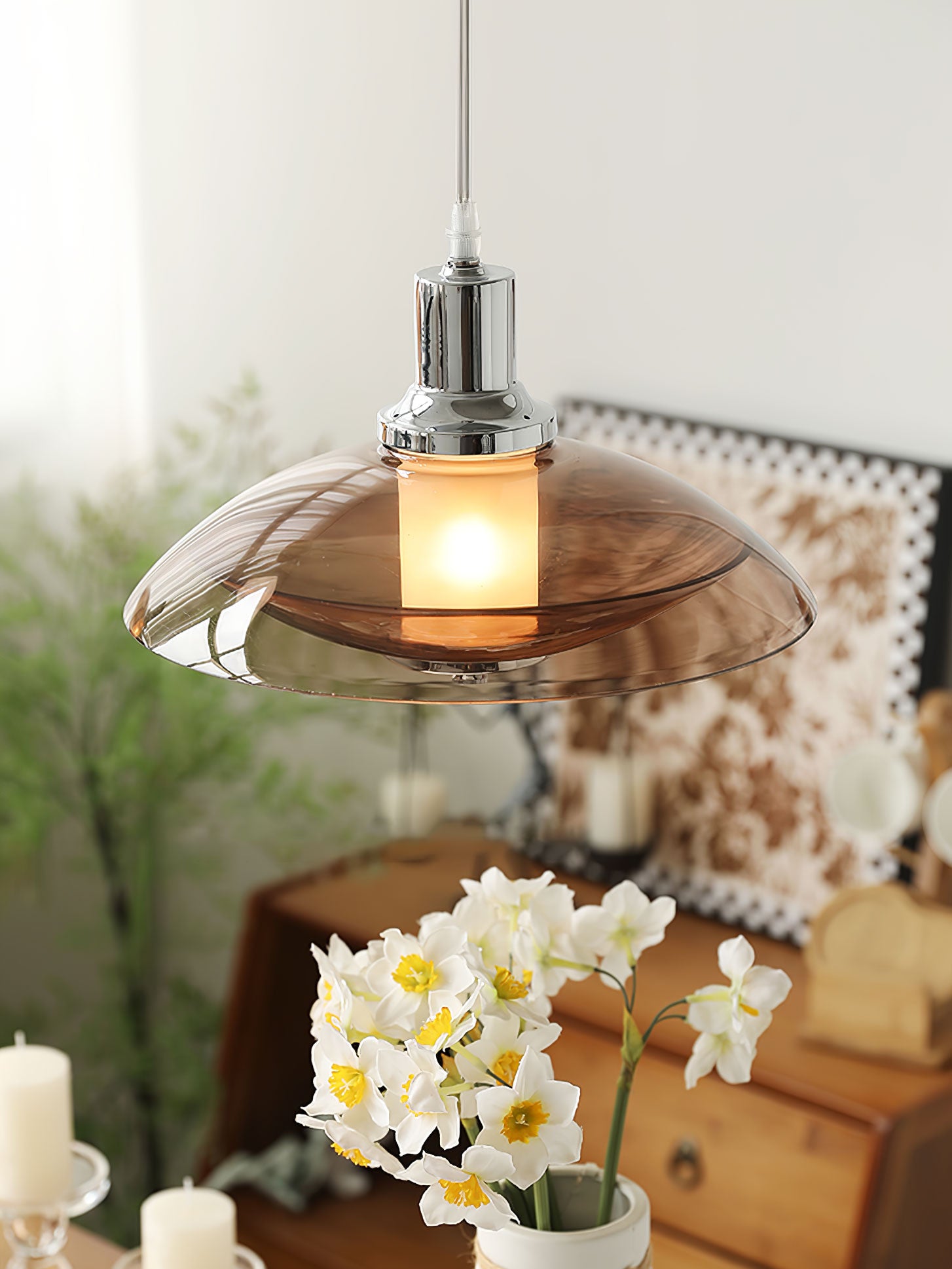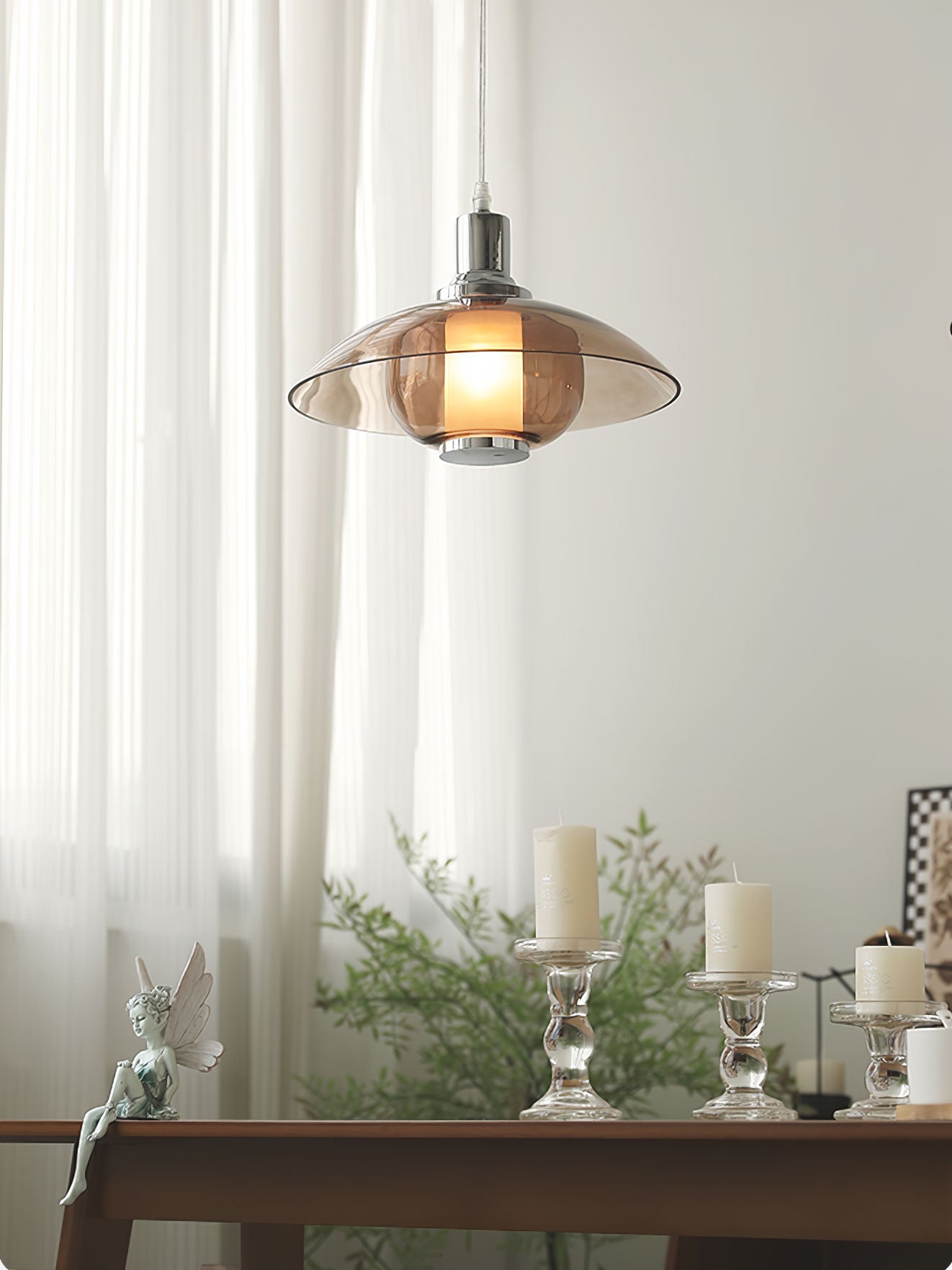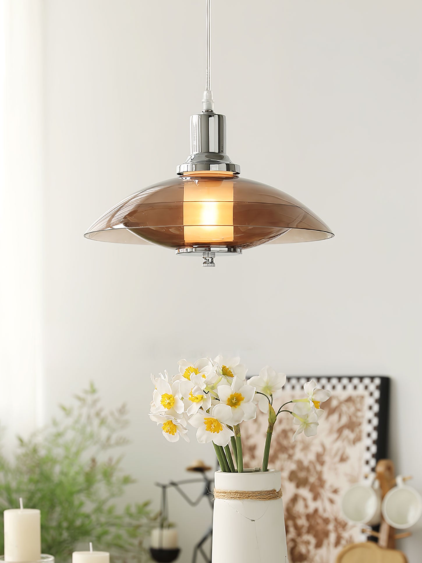 Amber lasi hajottaa valon lämpimään, kutsuvaan sävyyn luoden kodikasta hehkua asuintilasi. Tämä leikkisä mutta hienostunut riippuvalaisin toimii katseenvangitsijana keskipisteenä, joka voi vaivattomasti kohottaa minkä tahansa huoneen estetiikkaa tyylikkäästä oleskelutilasta kutsuvaan eteiseen. Flying Saucer Chrome Pendant Light on häikäisevä sekoitus retrohenkistä charmia ja nykyajan tyylikkyyttä, olipa se sitten päällä piristämään iltaasi tai toimimaan veistoksellisena kappaleena päivällä.