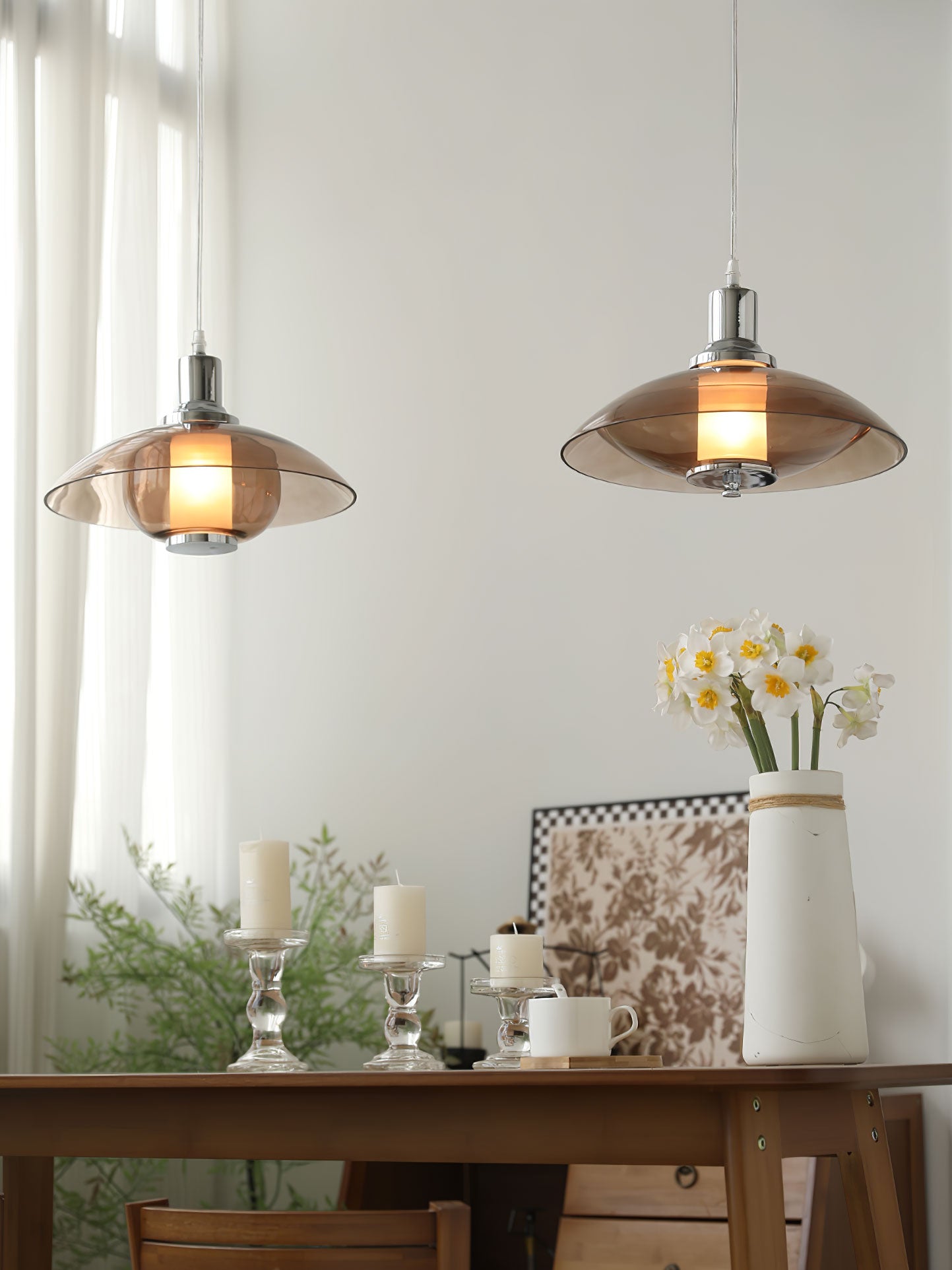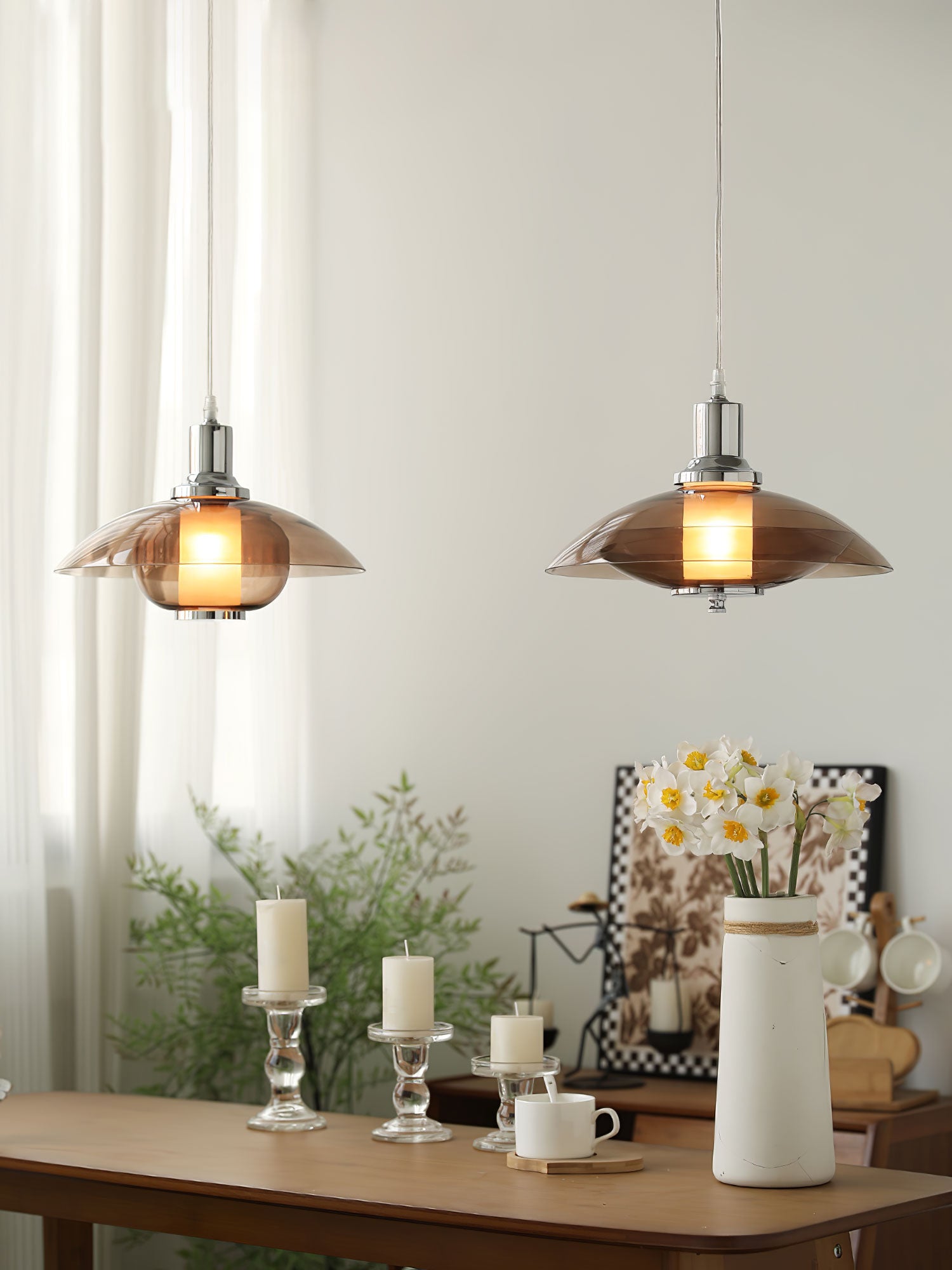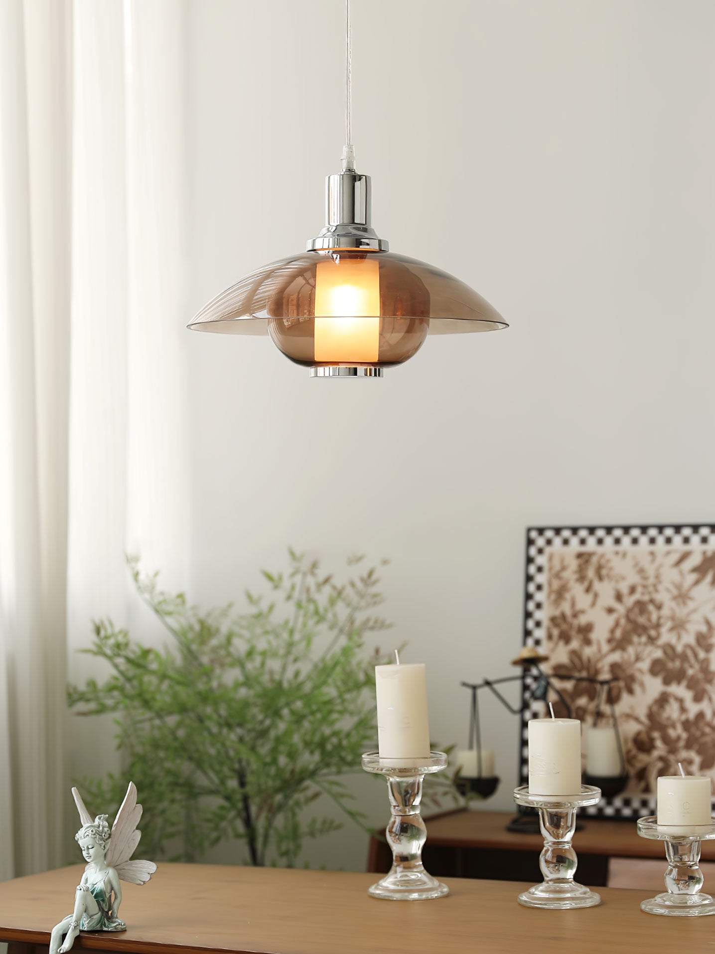 Amber lasi hajottaa valon lämpimään, kutsuvaan sävyyn luoden kodikasta hehkua asuintilasi. Tämä leikkisä mutta hienostunut riippuvalaisin toimii katseenvangitsijana keskipisteenä, joka voi vaivattomasti kohottaa minkä tahansa huoneen estetiikkaa tyylikkäästä oleskelutilasta kutsuvaan eteiseen. Flying Saucer Chrome Pendant Light on häikäisevä sekoitus retrohenkistä charmia ja nykyajan tyylikkyyttä, olipa se sitten päällä piristämään iltaasi tai toimimaan veistoksellisena kappaleena päivällä.