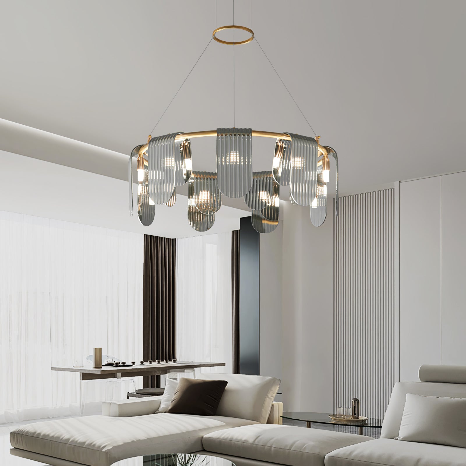 Folioles Brass -kattokruunu on tyylikäs valaistusvaihtoehto mihin tahansa huoneeseen. Tämä messinkivalaisimilla ja soikealla tuhkanharmaalla lampunvarjostimella valmistettu kattokruunu tuo kotiisi varmasti vaivatonta hienostuneisuutta.