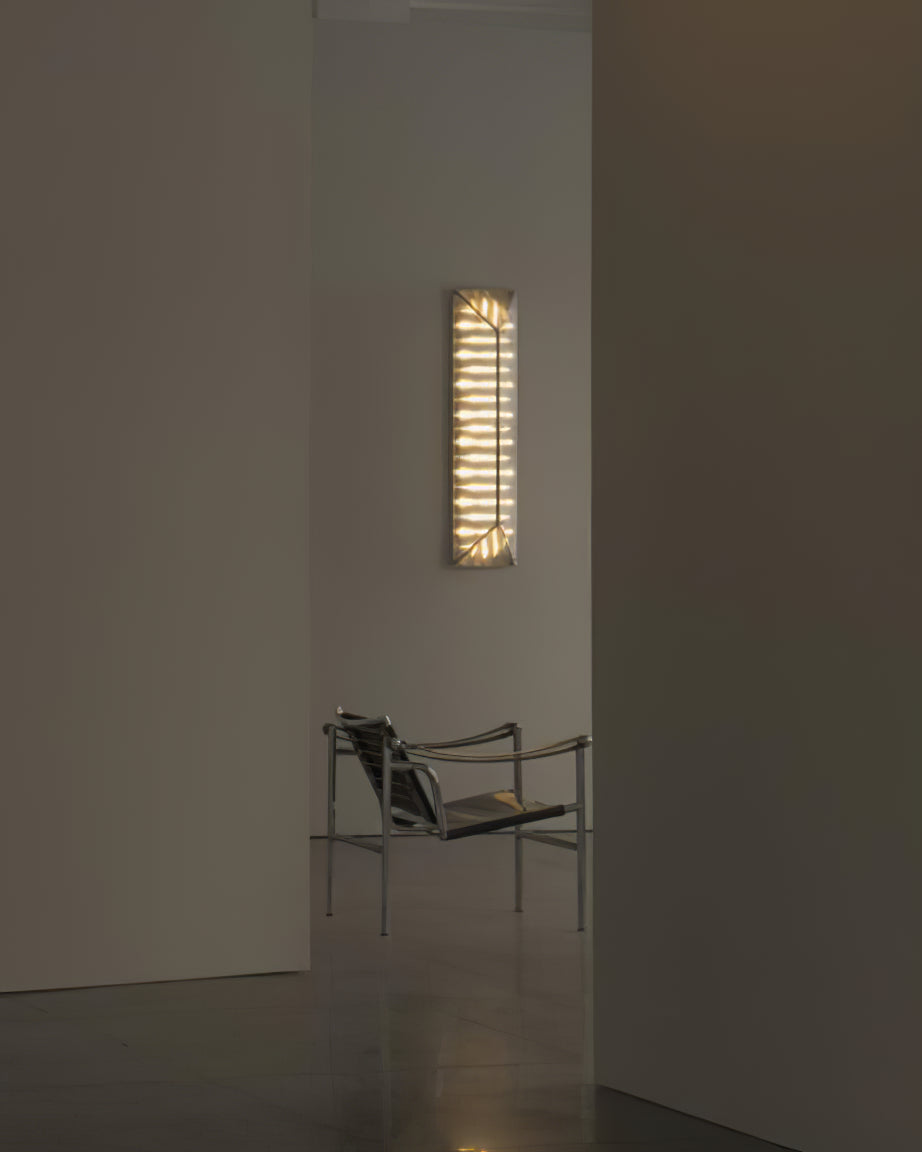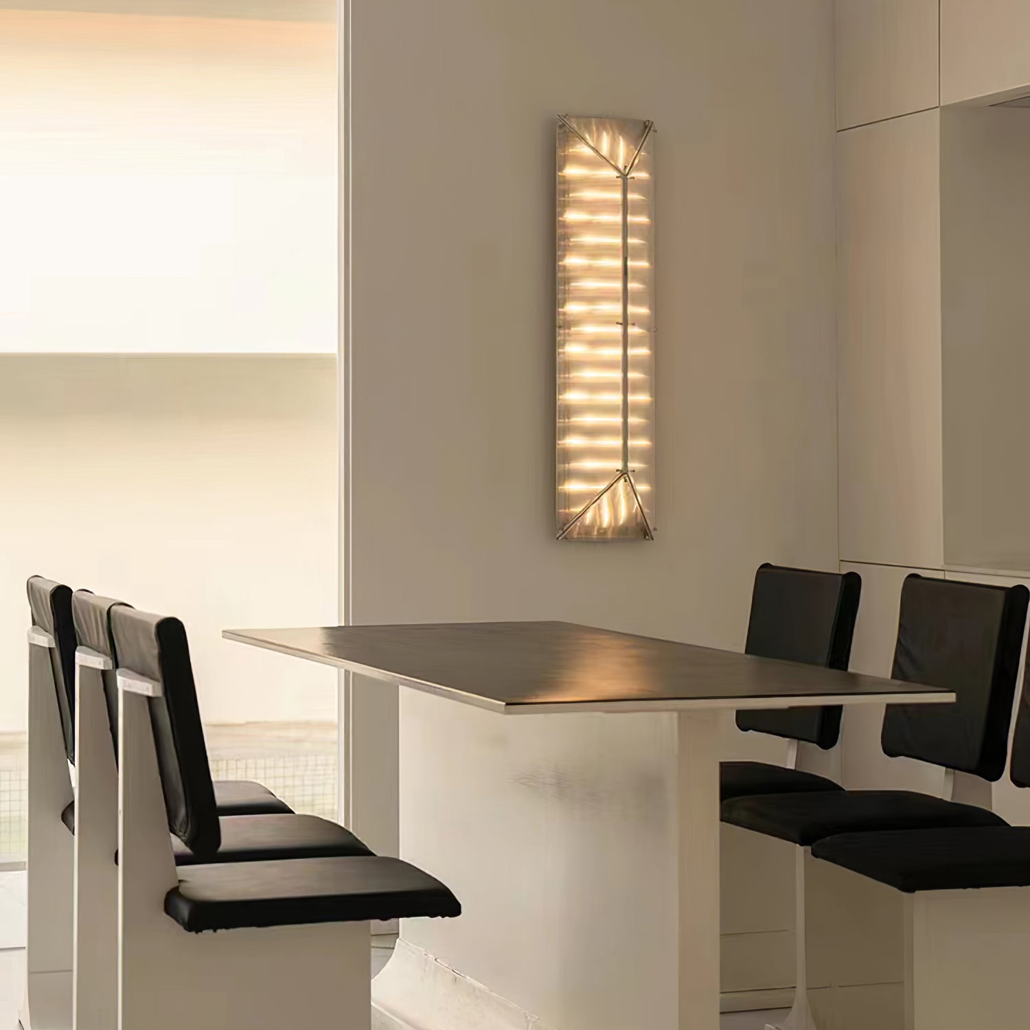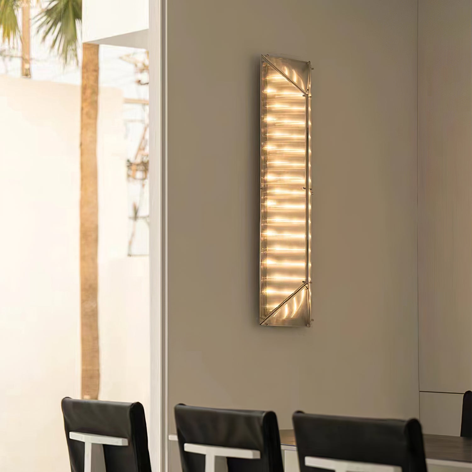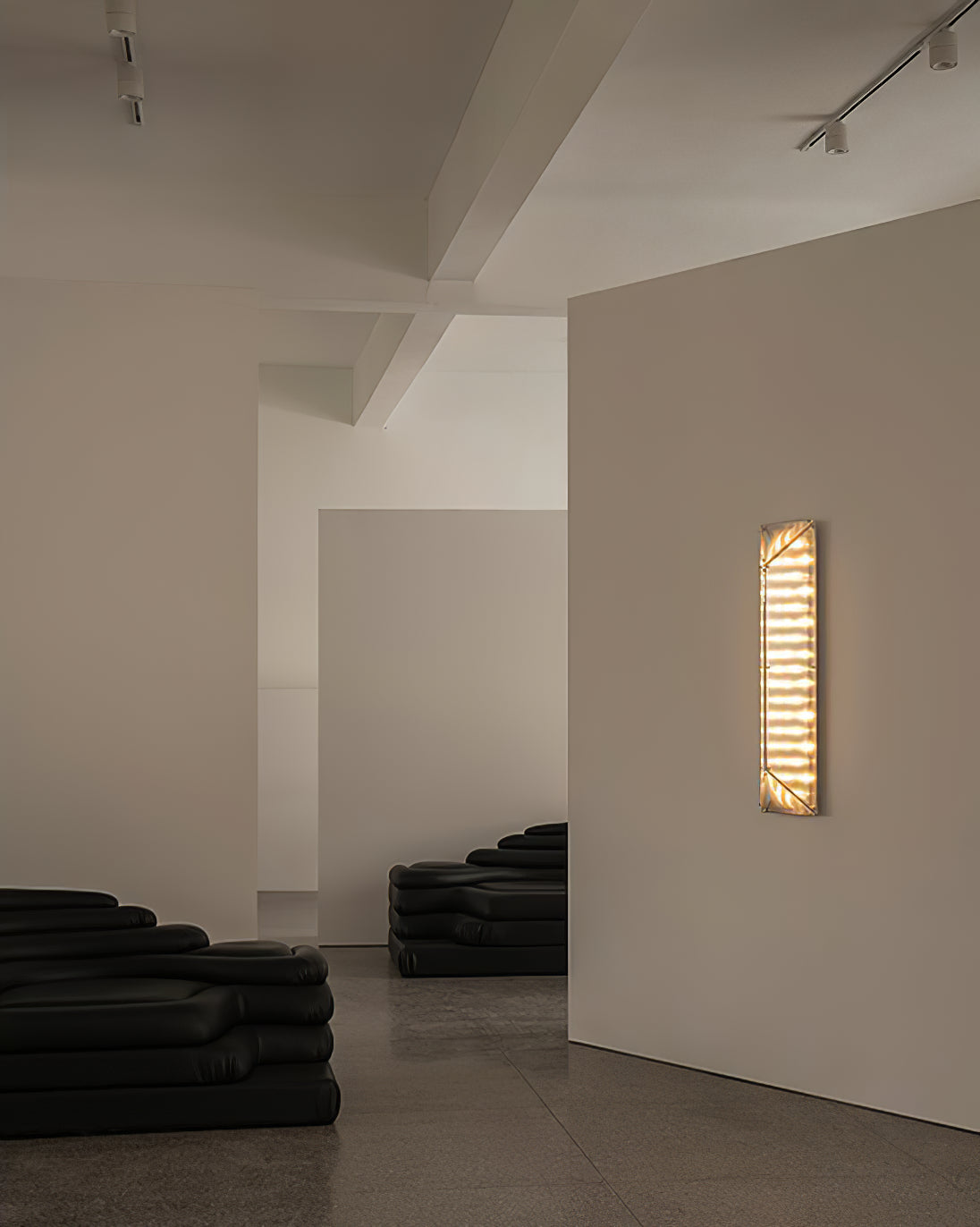 'Fragment'-seinävalaisin Käytetty kuvioitu lasi, joka voi vääristää valon suuntaa ja luoda erikoisvaikutelman, joka on saanut inspiraationsa länsimaisen goottilaisen kirkon arkkityypistä ja kirkon värikkäiden ikkunoiden luomasta salaperäisestä tunnelmasta, joka muuttaa arkkitehtonisen kielen hänen valaistukseensa sarja 'fragment'.