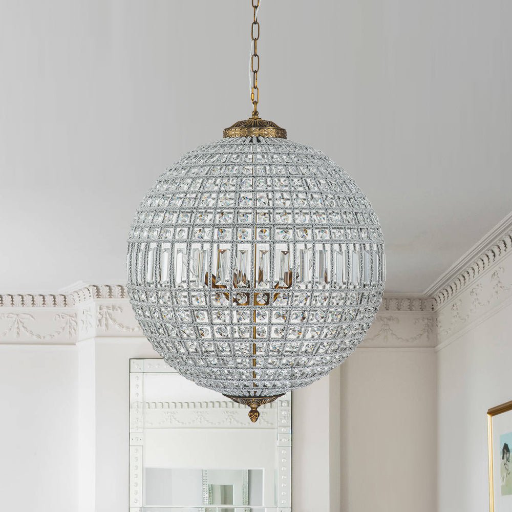 Tervetuloa upea ja vintage-tyylikäs tunnelma tilaan tämän pallomaisen riippuvalaisimen avulla. Tämä antiikkimessingillä viimeistelty kristallipallokruunu on klassinen ja tyylikäs ranskalainen tyyli. Erikokoiset viistetyt lasikristallit täyttävät avoimen pallokehyksen ja luovat tämän upean kristallikruunun. Viisi E12/E14 kynttelikköpolttimoa (ei sisälly), jotka on valettu sisältä kimaltelemaan kristallikoristeiden läpi, parantavat tilan tunnelmaa. Tämä ranskalainen leveä kristallikruunu tuottaa unohtumatonta glitteriä ruokapöytään, olohuoneeseen, eteiseen, aulaan tai hotelliin.Tiedot