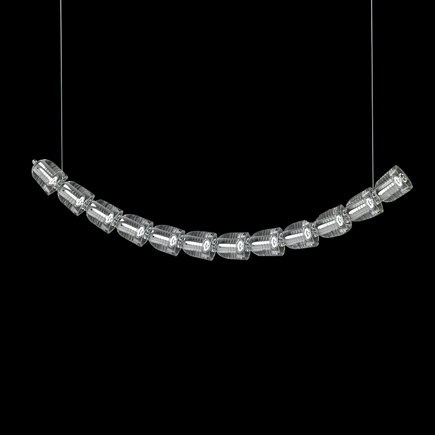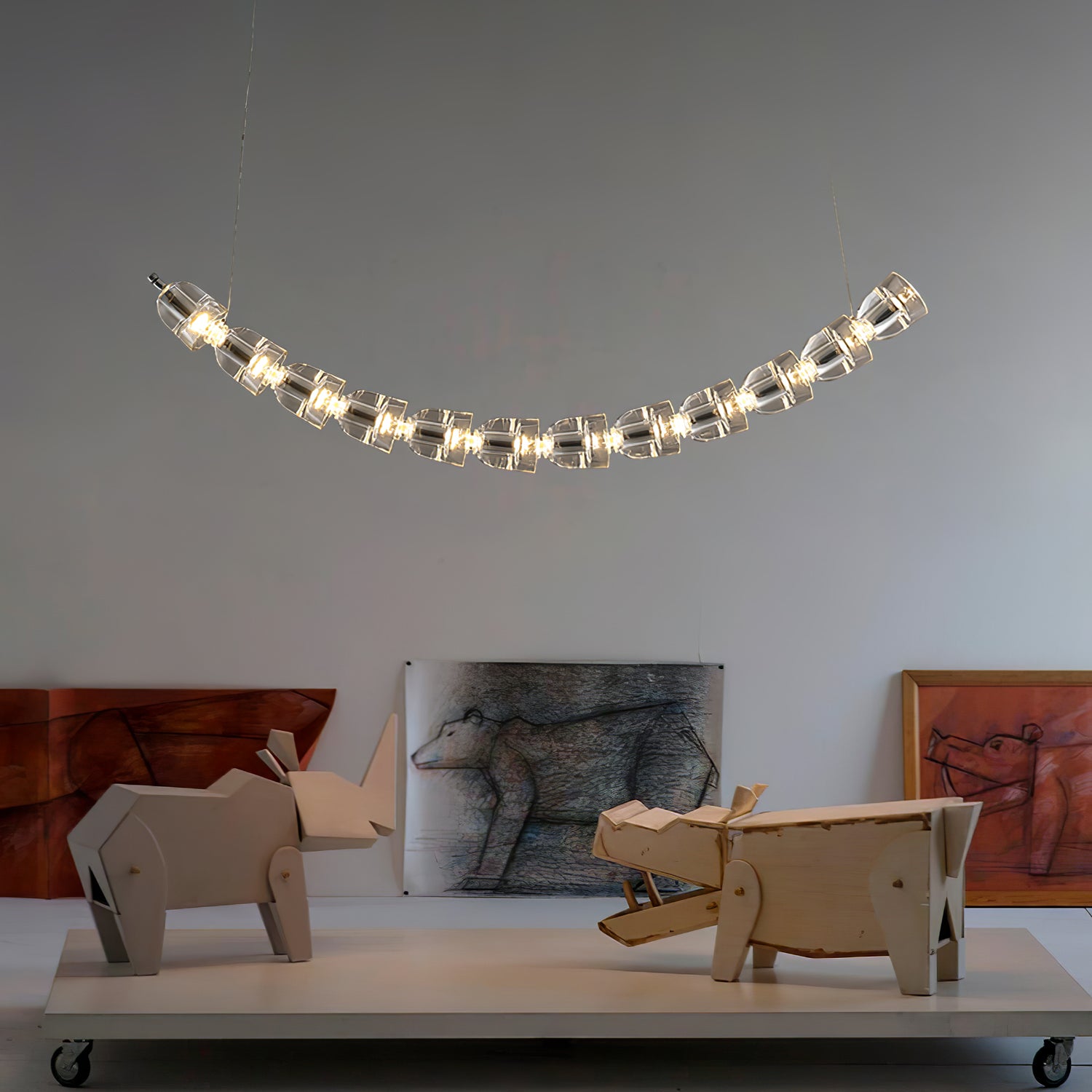 Gabriel-kattokruunu Suunnittelu on saanut inspiraationsa käärmeen sujuvuudesta ja eleganssista, ja sen pehmeät kaaret jäljittelevät käärmeen siroa kaaria sen liukuessa. Segmentoitu rakenne on tarkasti yhdistetty muodostamaan harmonisen puolikuun muodon, mikä viittaa käärmeen tasaiseen ja rytmiseen liikkeeseen levossa. Puhtaat linjat ja yksinkertaiset geometriset muodot antavat tälle valaisimelle modernin tunnelman, kun taas sen hienovarainen muistutus käärmeen kanssa lisää elementin luonnollista maailmaa. Tämä on teos, jossa yhdistyvät orgaanisten muotojen seesteisyys nykyaikaisen muotoilun sulavaisuuteen, ja se sopii täydellisesti tiloihin, jotka etsivät näyttävää valaisinta, joka tarjoaa molempien maailmojen parhaat puolet.