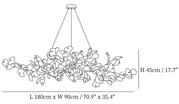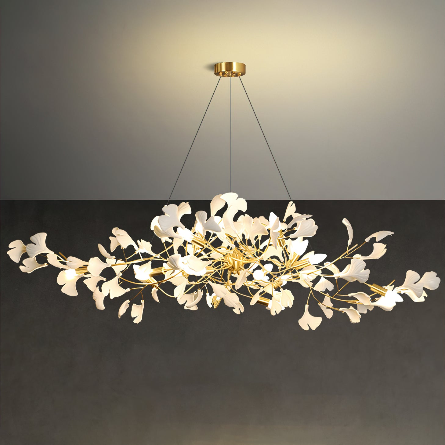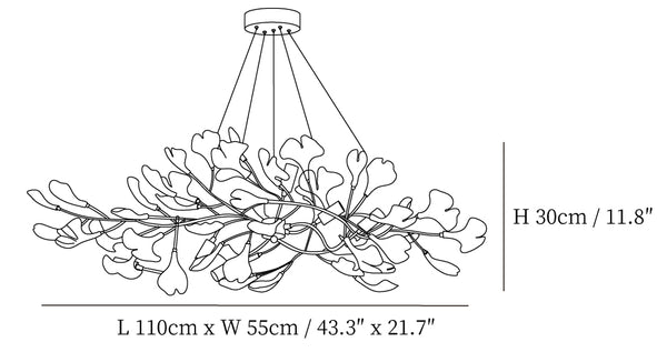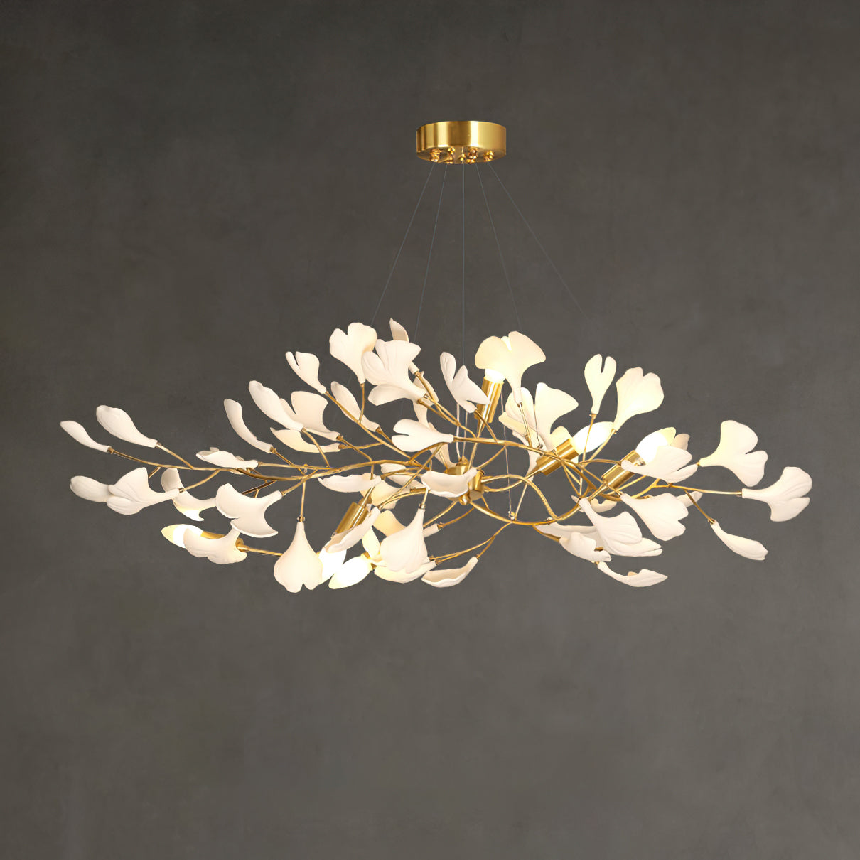 Tämä ginkgo-lehtikruunu on valmistettu korkealaatuisesta messingistä ja keramiikasta. Messingin kultainen väri lisää ripauksen klassista ylellisyyttä kattokruunuun, ja se yhdistyy täydellisesti sen hienoihin keraamisiin neidonhiuspuunlehtiin osoittaen modernia mutta klassista kauneutta. Messingistä valmistetut kannattimet varmistavat kattokruunun tukevuuden ja kestävyyden, kun taas keraamiset ginkgo-lehdet loistavat valon alla, säteilevät rauhallista ja pehmeää kiiltoa luoden lämpimän ja elegantin tunnelman sisätilaan. Täydellinen sekoitus modernia käsityötaitoa ja luonnon kauneutta, tämä kattokruunu on epäilemättä minkä tahansa tilan keskipiste.