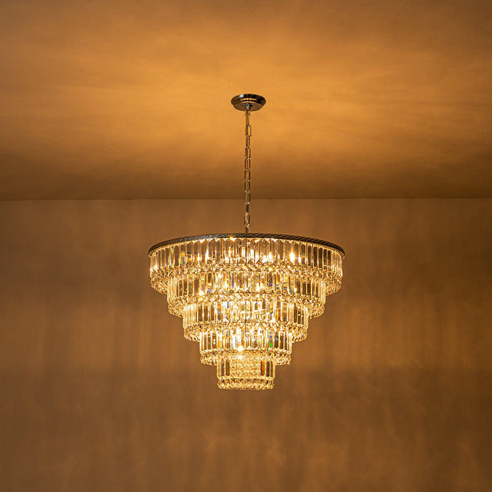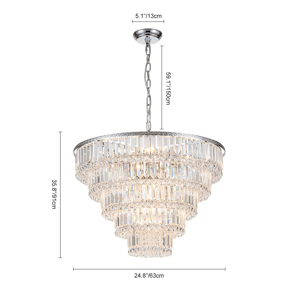 Hienolla tarkkuudella valmistettu ylellinen keskiosa, häikäisevä porrastettu kristallikruunumme huokuu ajatonta tyyliä ja loistoa. Tämä upea pyöreä kattokruunu, joka on koristeltu runsailla määrillä viehättäviä kristalleja, säteilee tyylikästä hienostuneisuutta. Kiillotetulla kromilla viimeistelty viisi rummun muotoista sävyä, jotka on valmistettu hienosti hohtavista, viistetyistä kristalliprismoista, ympäröivät kauniisti seitsemäntoista E12-pohjaista polttimoa (ei sisälly toimitukseen). Kristallihalon hohtaessa valon ympärillä saavutetaan upean ylellinen ja romanttinen tunnelma. Tämä upea 5-kerroksinen pyöreä kristallikruunu on täydellinen lisä mihin tahansa ruokasaliin, olohuoneeseen, keittiön tiskiin, eteiseen, makuuhuoneeseen tai eteiseen.Tiedot