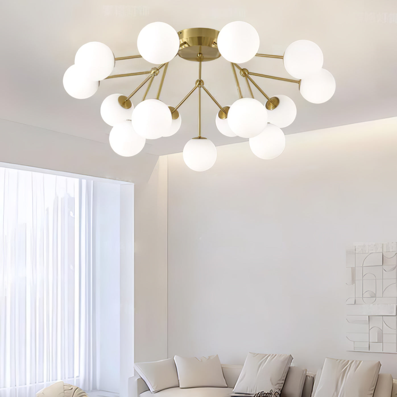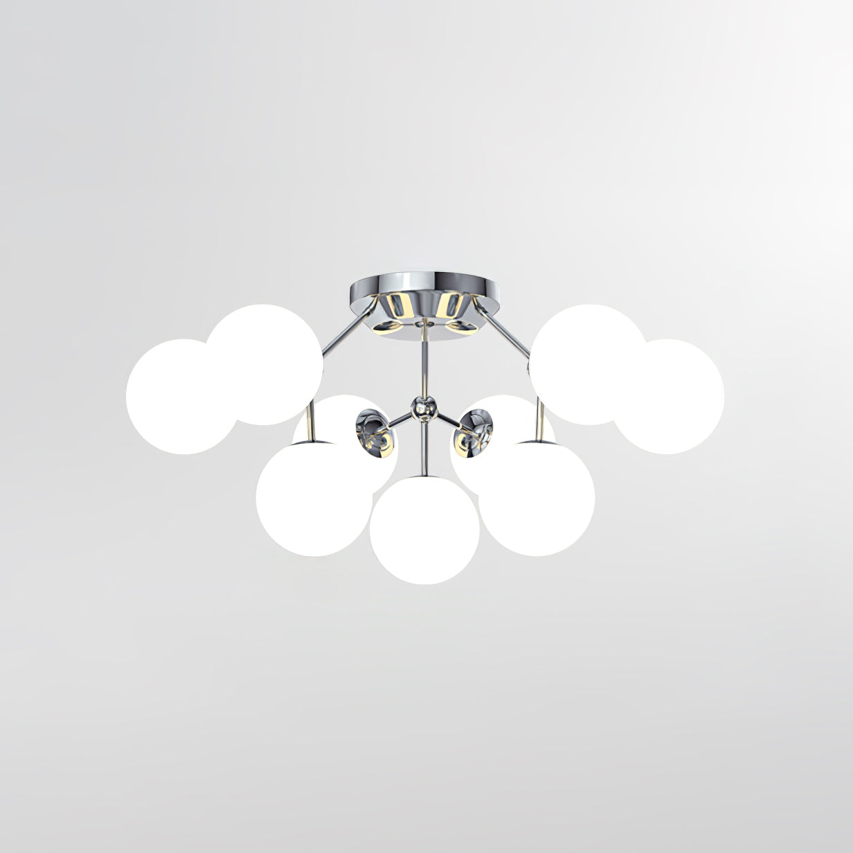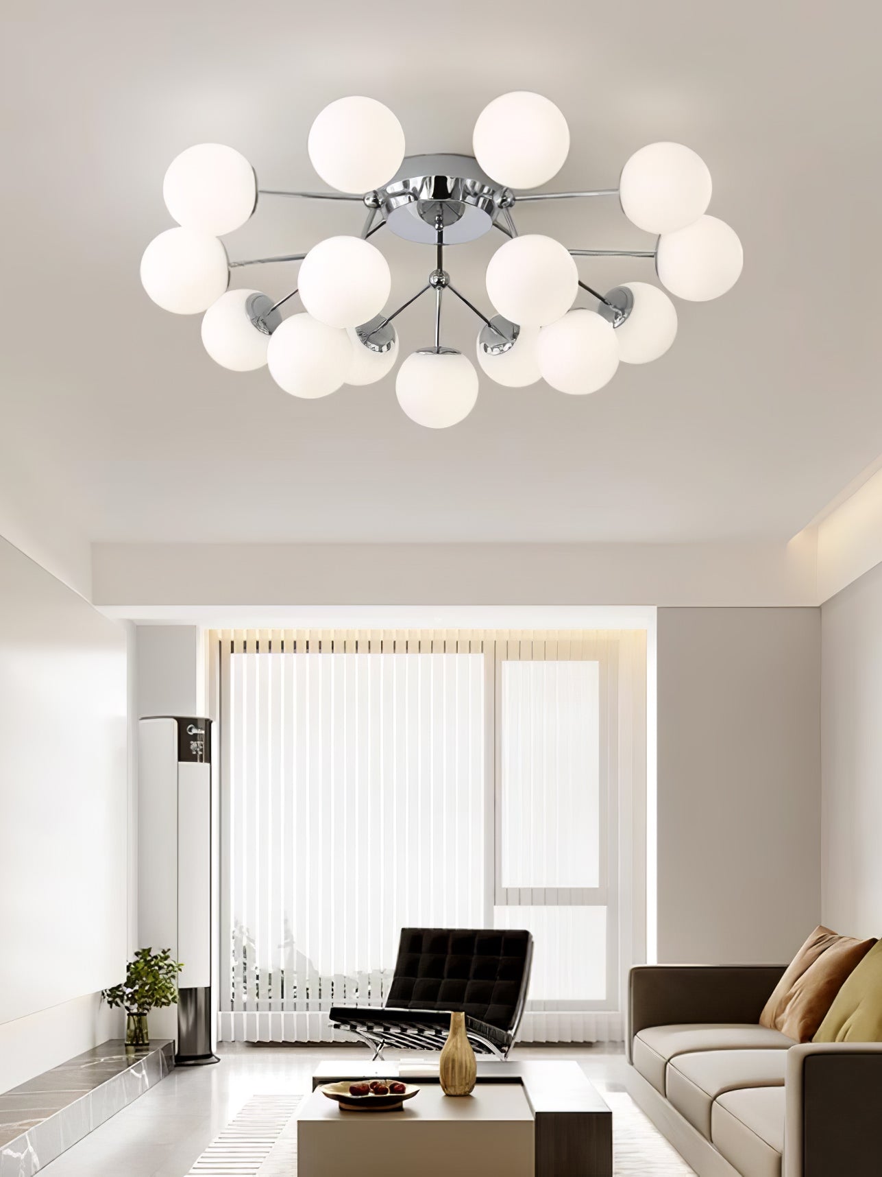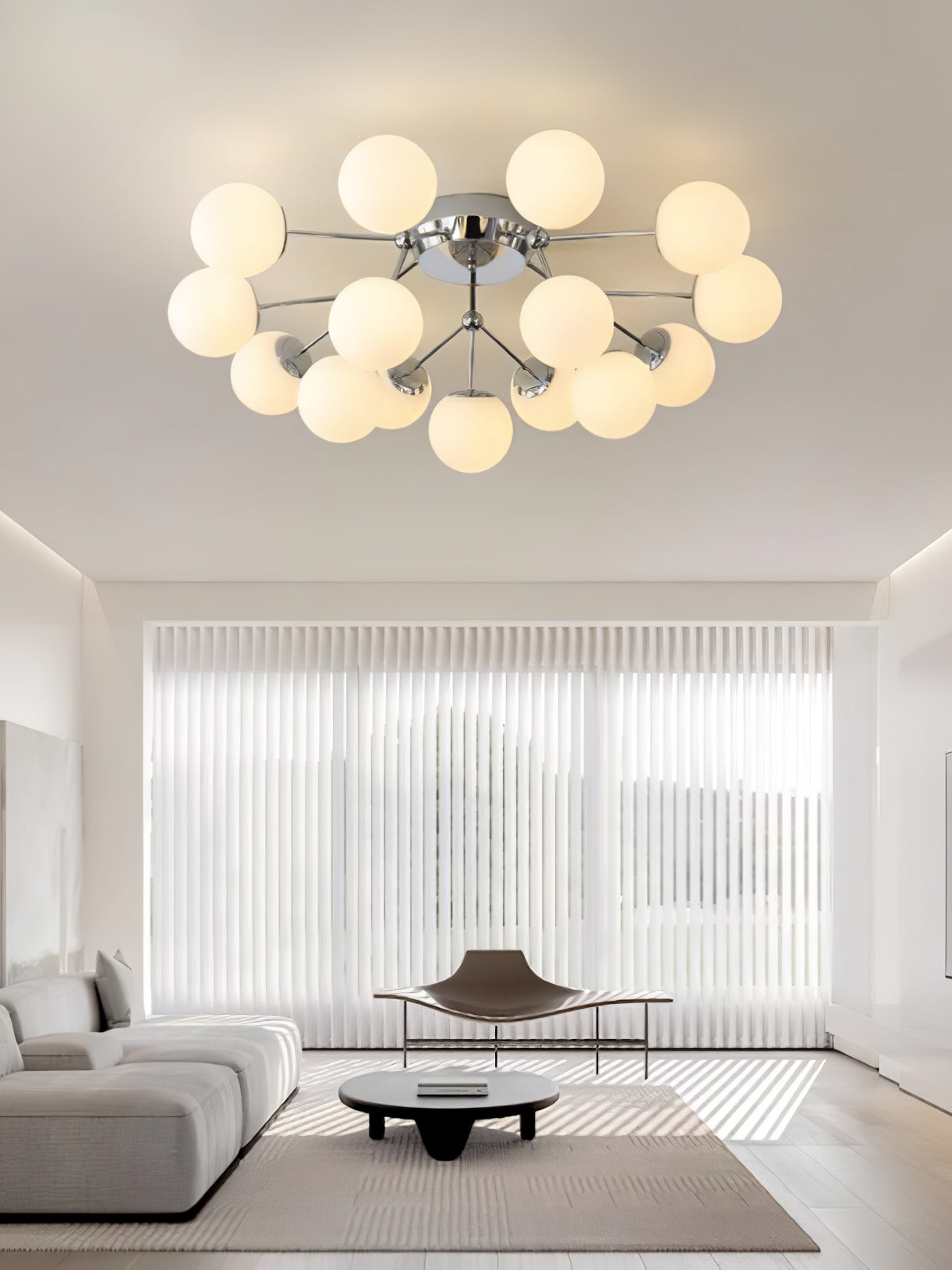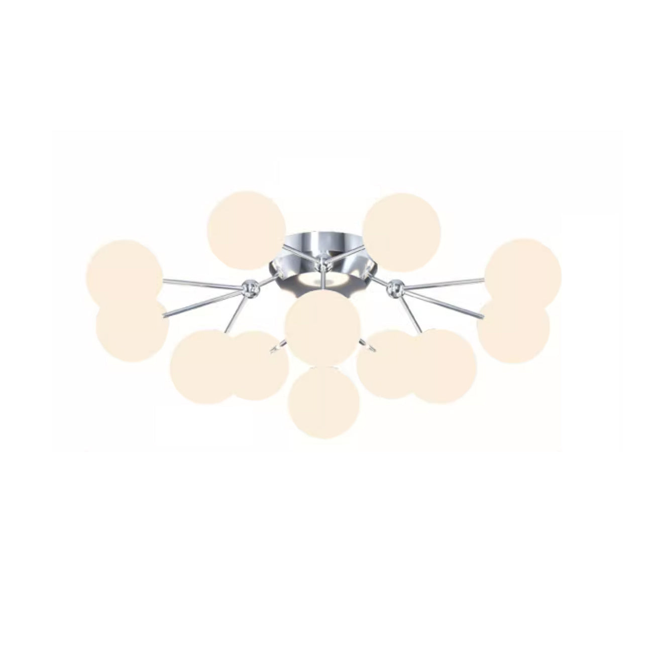 Tämä moderni Glass Balls Cluster -kattolamppu tuo tyylikkään ilmeen mihin tahansa tilaan. Sen geometrinen klusterimuotoilu koostuu valkoisista lasipalloista, jotka säteilevät pehmeää valaistusta, joka on täydellinen parantamaan minkä tahansa huoneen tunnelmaa. Siinä on myös yksinkertainen, muodikas tukirakenne helppoa asennusta varten.