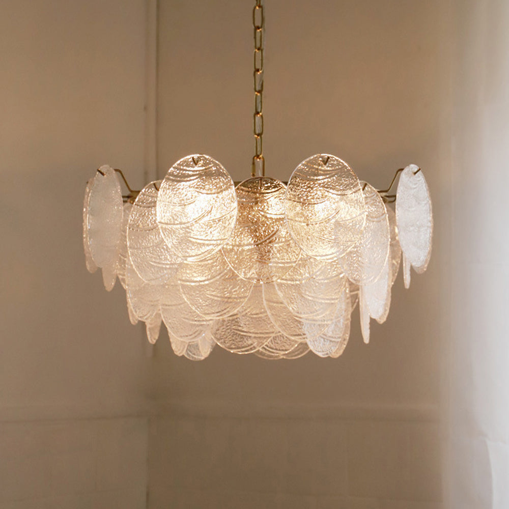 Kullapinnoitettu rauta tekee lampunvarjostimesta vahvan ja kestävän, ja aaltoileva lasi tekee tästä kappaleesta kauniin ulkonäön ja välittää pehmeän ja tasaisen tunnelman. Anna valon loistaa aaltoilevien lasipalojen läpi luodaksesi lämpimän, runsaan hehkun olohuoneesi ja makuuhuoneesi päälle.
