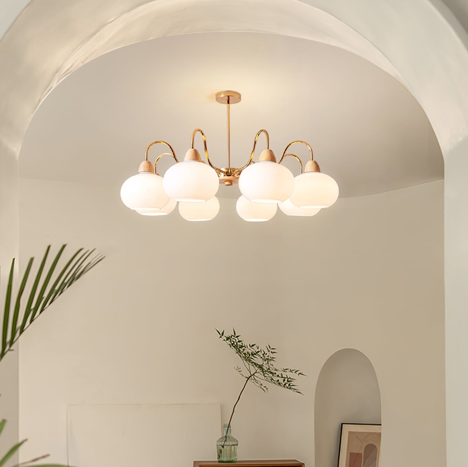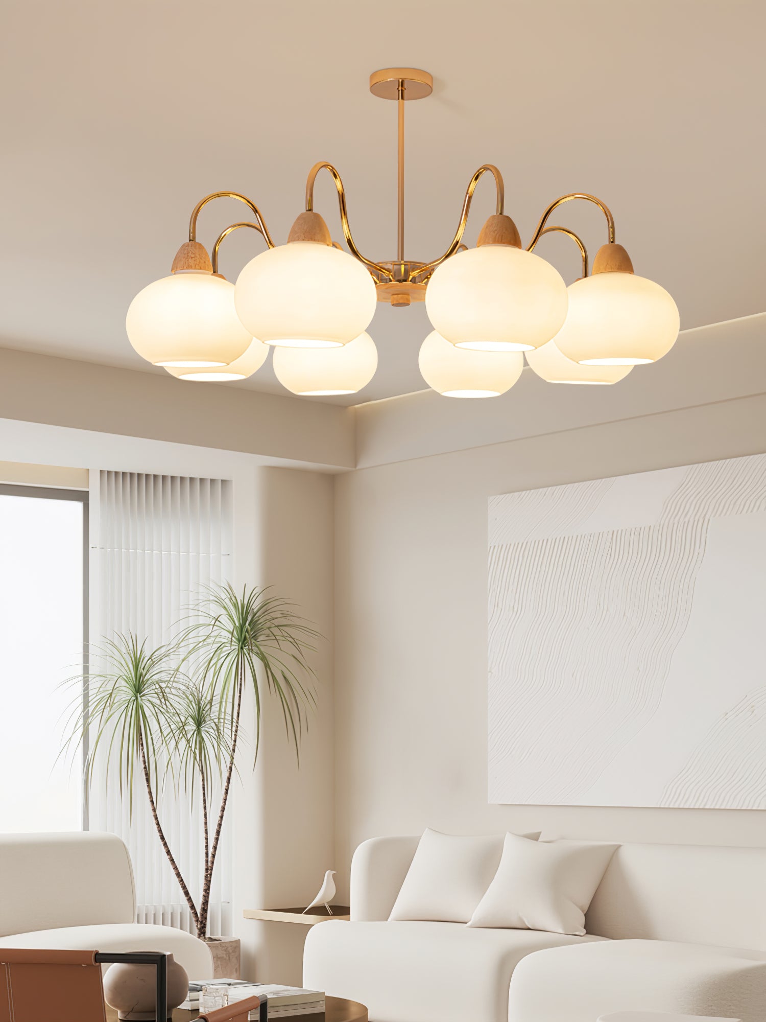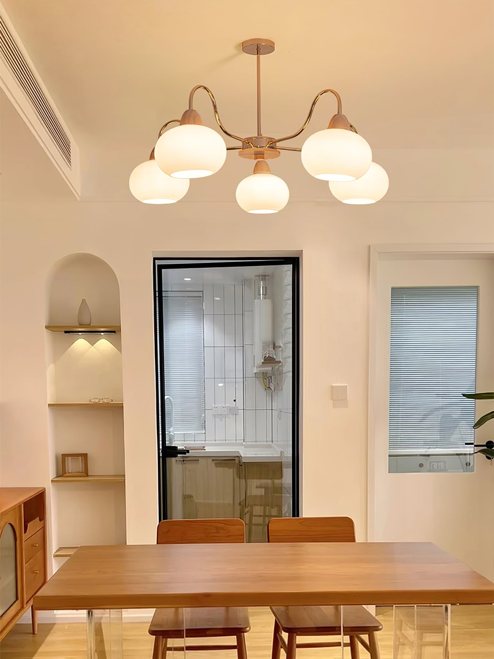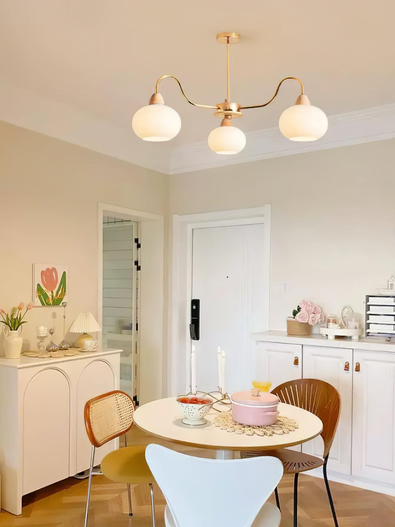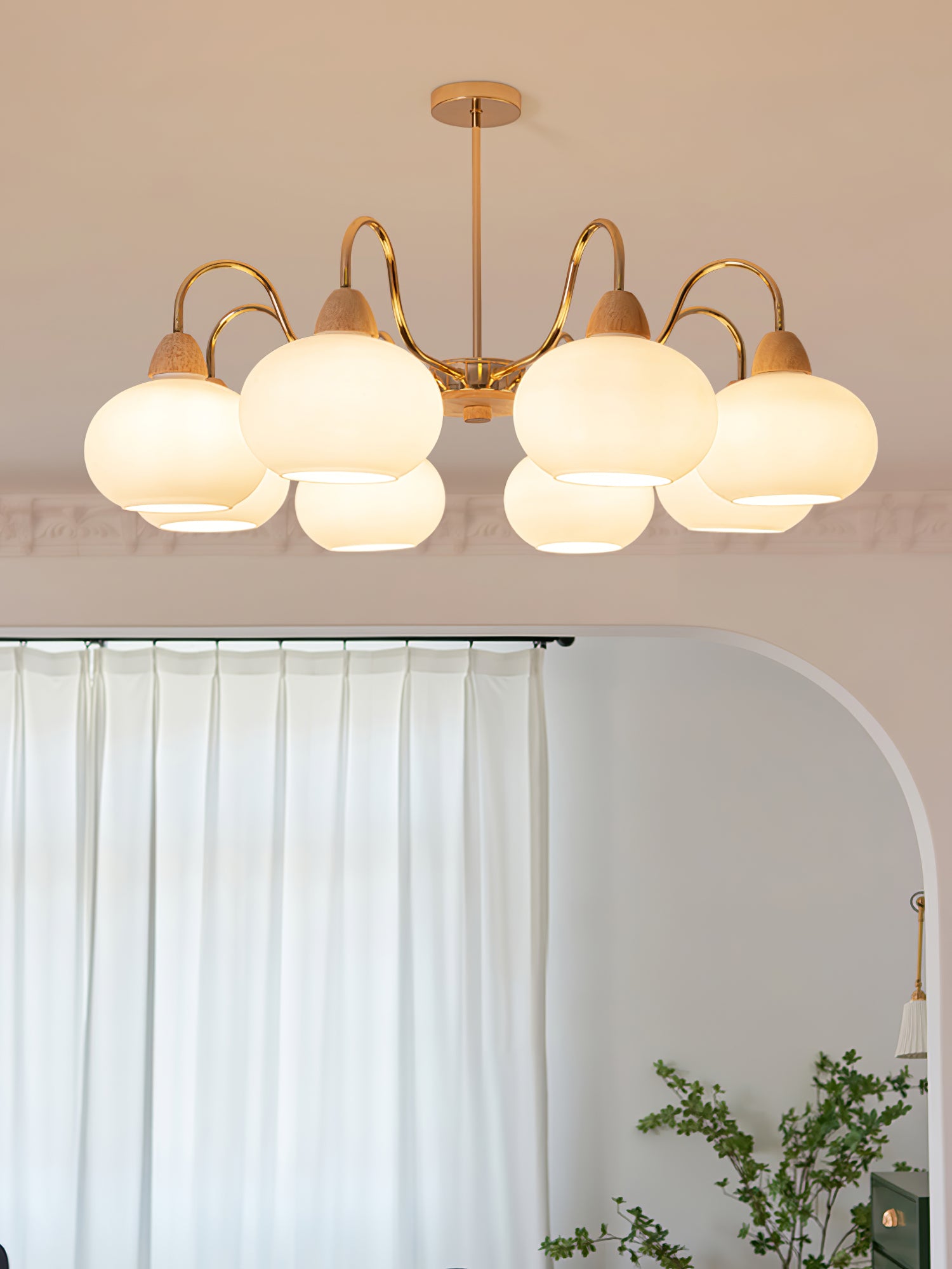 Tämä kattokruunu on täydellinen keskipiste mihin tahansa olohuoneeseen. Siinä on lasin kakimuotoinen varjostin klassisessa vuosisadan puolivälin Bauhaus-tyylissä kermanvärisellä viimeistelyllä, joka luo ainutlaatuisen ja tyylikkään ilmeen. Modernin ja ajattoman muotoilunsa ansiosta se on huomiota herättävä lisä jokaiseen kotiin.