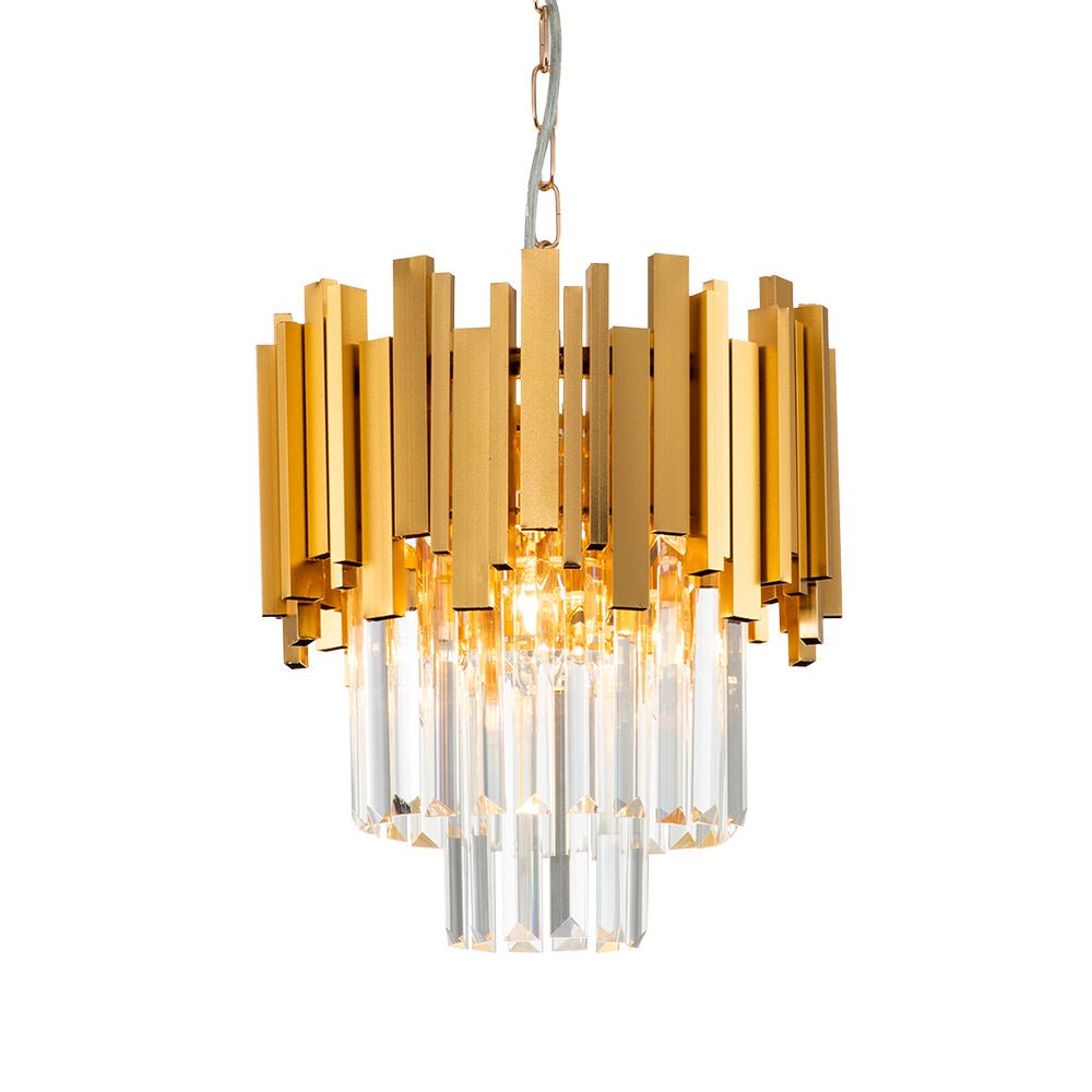Kolme valoa • Kolme tasoa • Lasikristalli • Kultaviimeistely • E12 kynttelikköpolttimot (ei sisälly) • Kiinteä • UL-listattu/CE-listattu