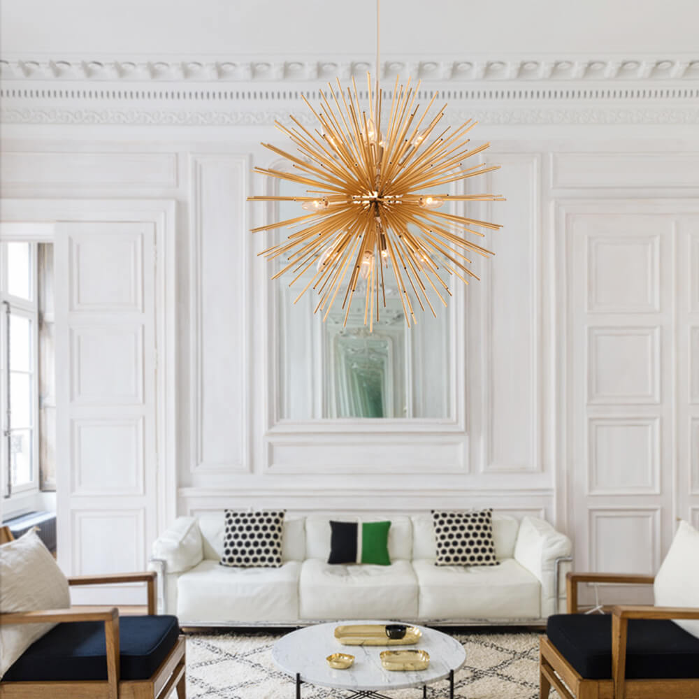 Nauti kultaisen sputnik-pallon auringonsäteistä kattokruunua ja upota elintilasi viehättävään valoon. Kultainen sputnik-kattokruunumme on valmistettu metallista, ja siinä on suuri määrä tyylikkäitä tankoja, jotka säteilevät ulospäin kaikkiin suuntiin muodostaen upean auringonpaisteen siluetin. Kahdeksan tai kaksitoista E12/E14 kynttelikköpolttimoa (ei sisälly) piiloutuu tasaisesti auringonsäteitä muistuttavien sauvojen väliin, joten aurinkokuorrutettu kattokruunu loistaa upeasti ja heijastavasti kullanvärisenä. Säädettävällä kaapelilla ripustettuna tämä kultainen pallokruunu voi olla sopivan pituinen tarpeidesi mukaan. Lisäksi tämä kultainen sputnik-kattokruunu on yhteensopiva kaltevan katon kanssa, mikä laajentaa sen käyttöaluetta. Luo bling-keskipiste olohuoneeseen, makuuhuoneeseen, ruokailuhuoneeseen tai eteiseen kultaisella sputnik-pallon aurinkoisella kattokruunulla.