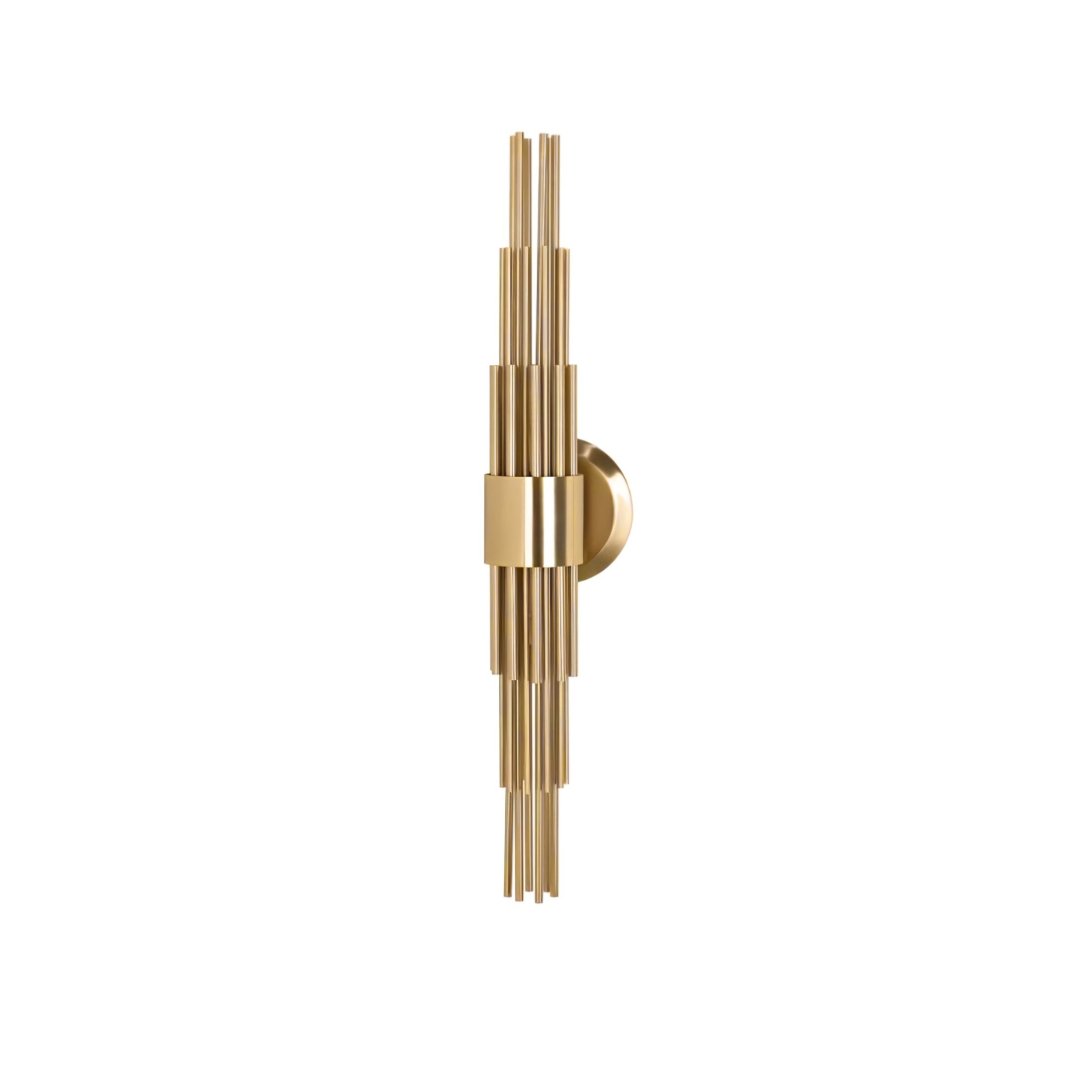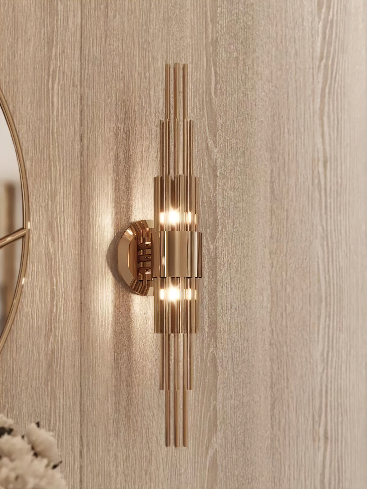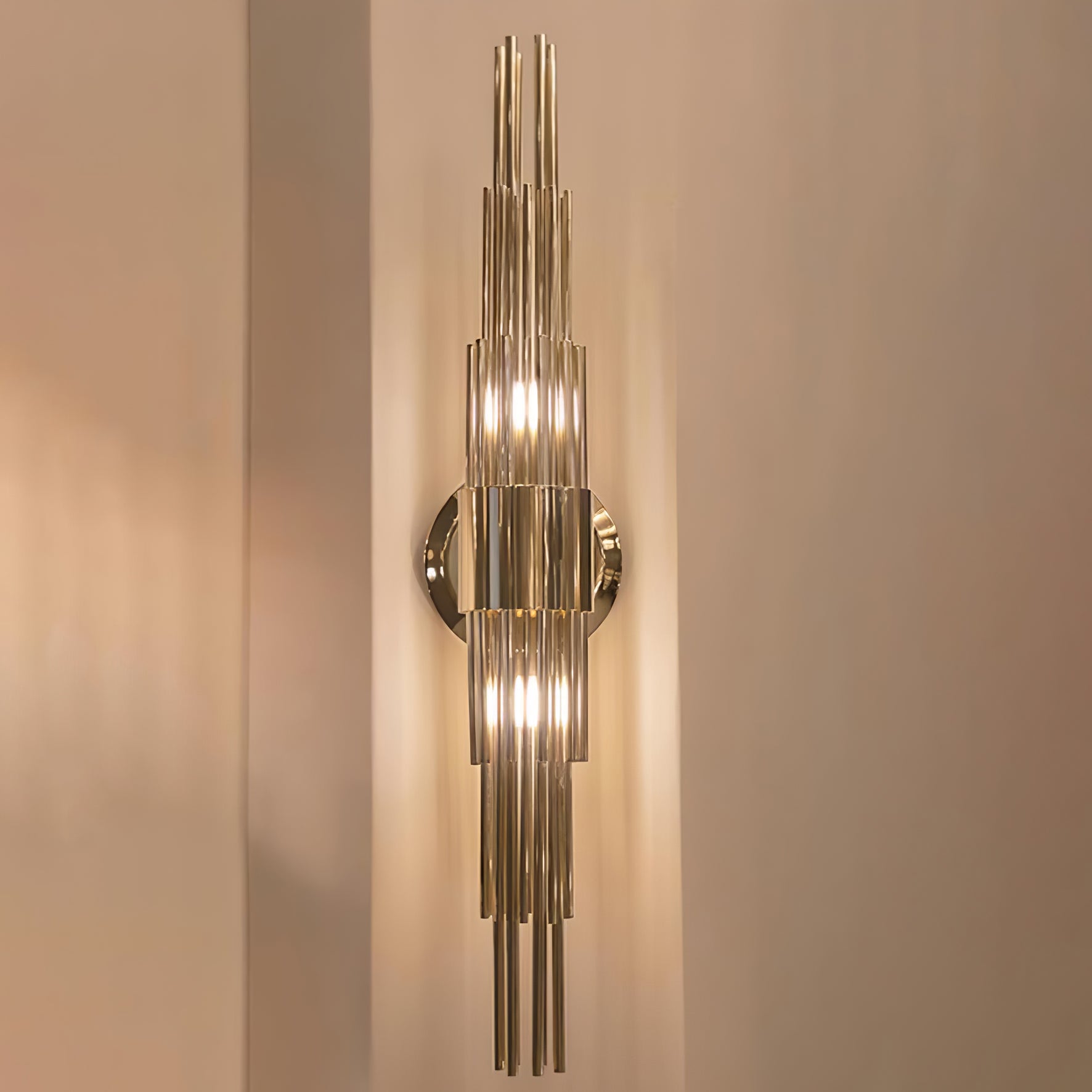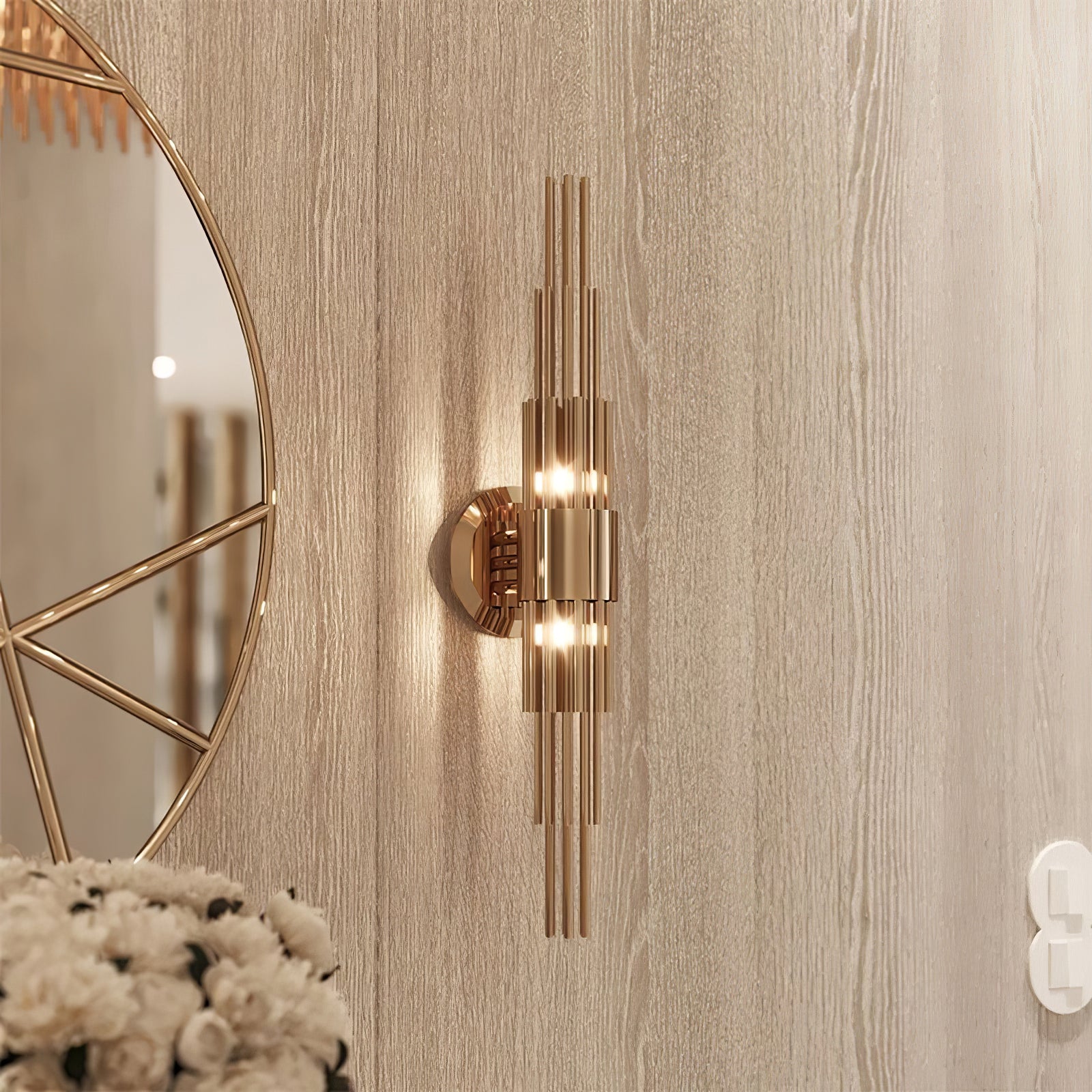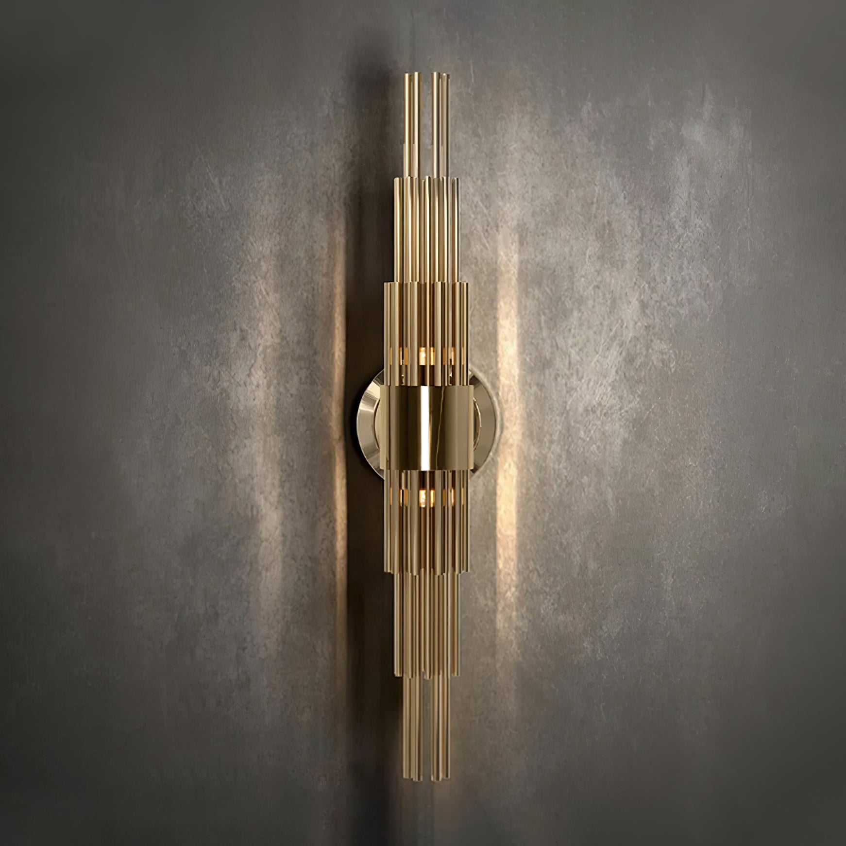 Tässä tyylikkäässä seinävalaisimessa on pitkät kullatut lasiputket, jotka antavat suunnittelulle täysin eksklusiivisen ja ylellisen ilmeen, mikä asettaa uuden tason erottuvalla ulkonäöllään. Tämä art deco -arkkitehtuurin inspiroima rikkaiden materiaalien ja sulavien linjojen resepti tekee Streamline-seinävalustasta halutun.