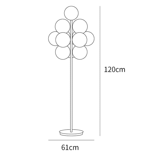 Grape Floor Lamp on hieno ja ainutlaatuinen lattiavalaisin, joka tunnetaan erottuvasta muotoilustaan ja laadukkaista materiaaleistaan. Sen runko on valmistettu raudasta ja lasista, mikä antaa koko valaisimen kestävyyttä ja pitkäikäisyyttä. Valaisimen runko on esitelty syvän mustana, ja se huokuu eleganttia ja salaperäistä tunnelmaa, joka sulautuu saumattomasti eri sisustustyyleihin.