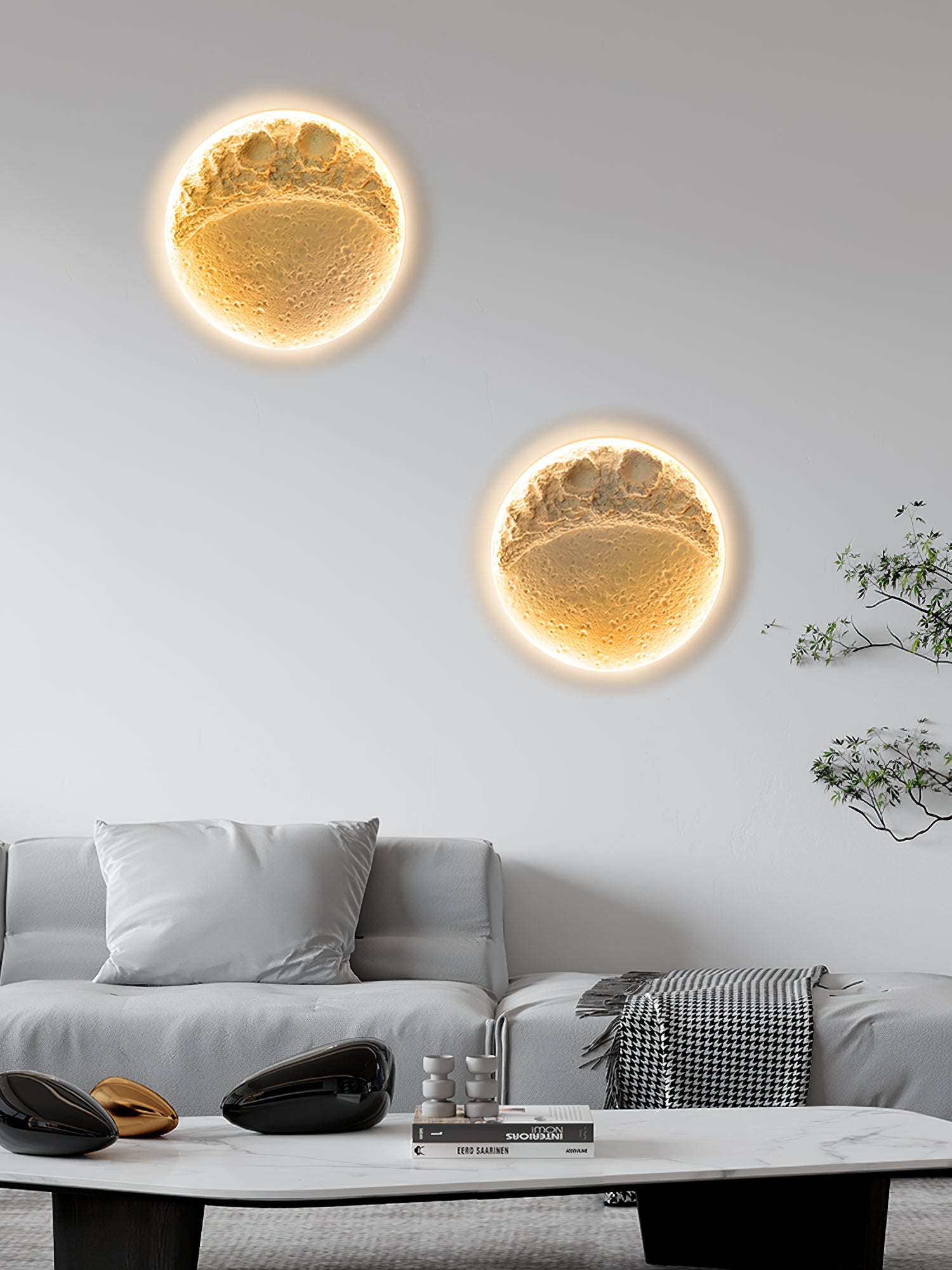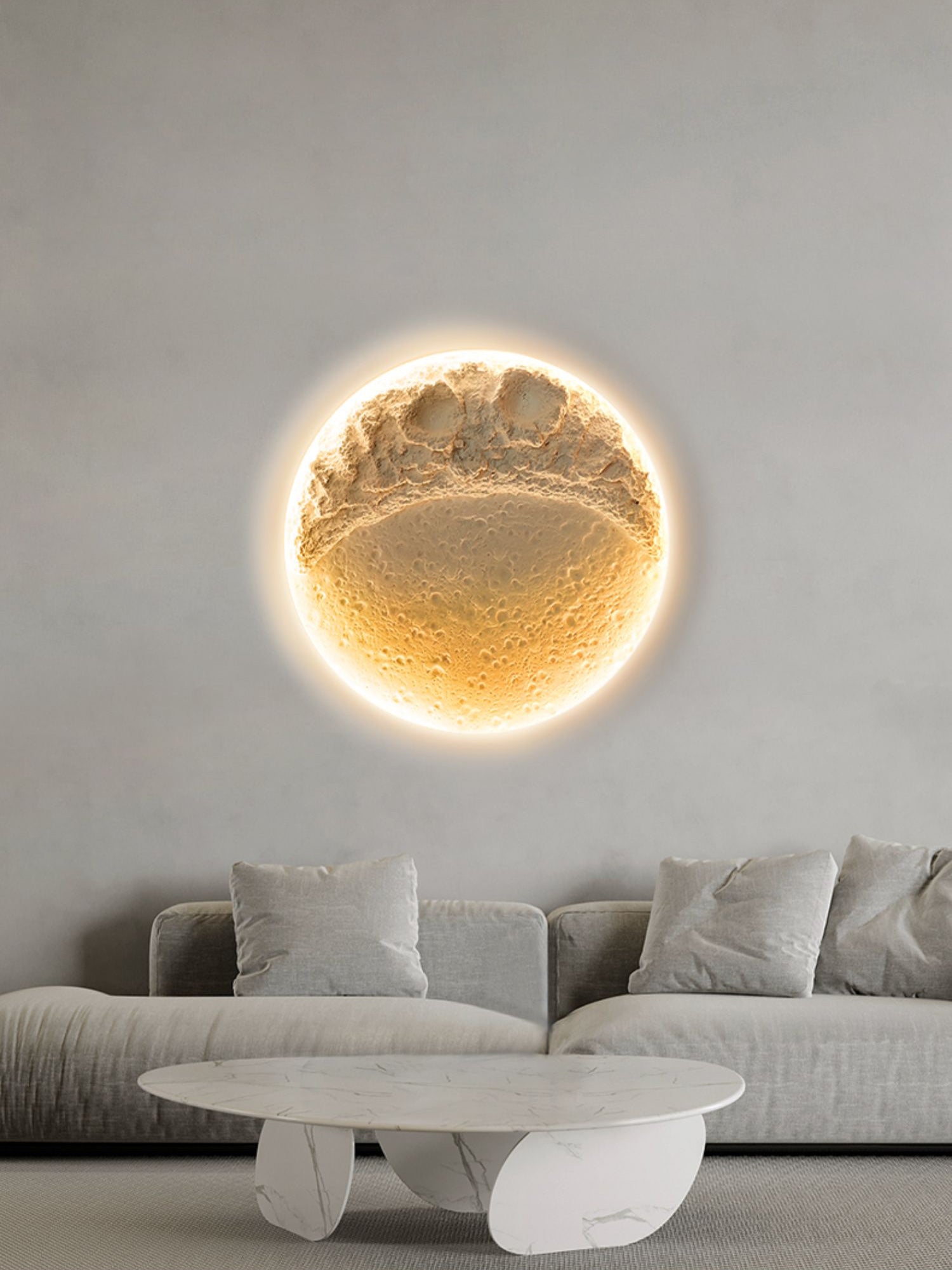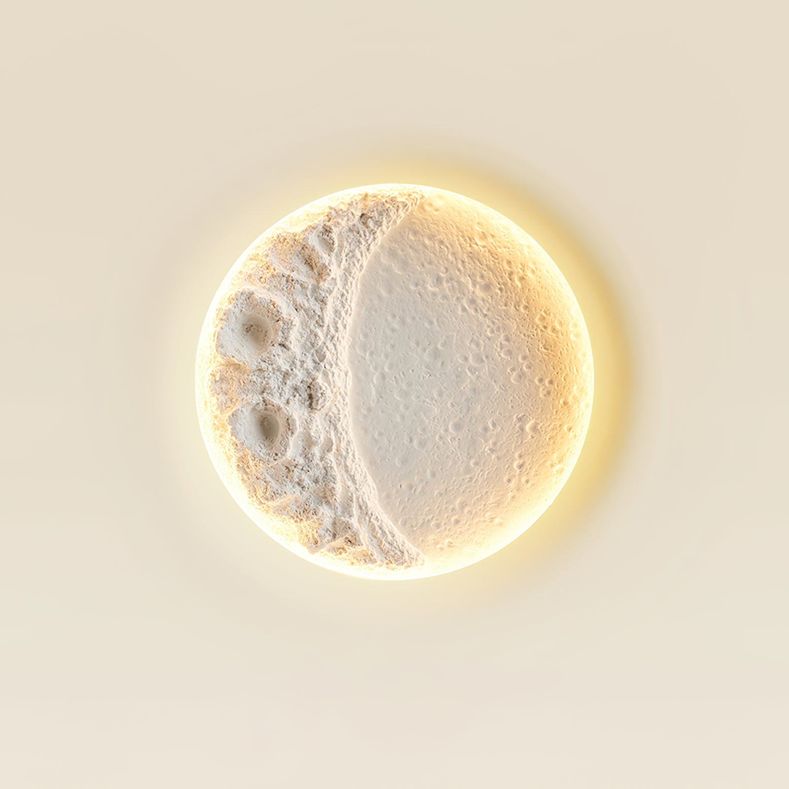 Tämä seinävalaisin on valmistettu kipsimateriaalista. Sen valaisinrungon muotoilu on täynnä taiteellista tunnelmaa, ja se jäljittelee voimakkaasti kuun pinnan kraatterimallia, mikä tekee seinävalaisimesta realistisemman ja kolmiulotteisemman.